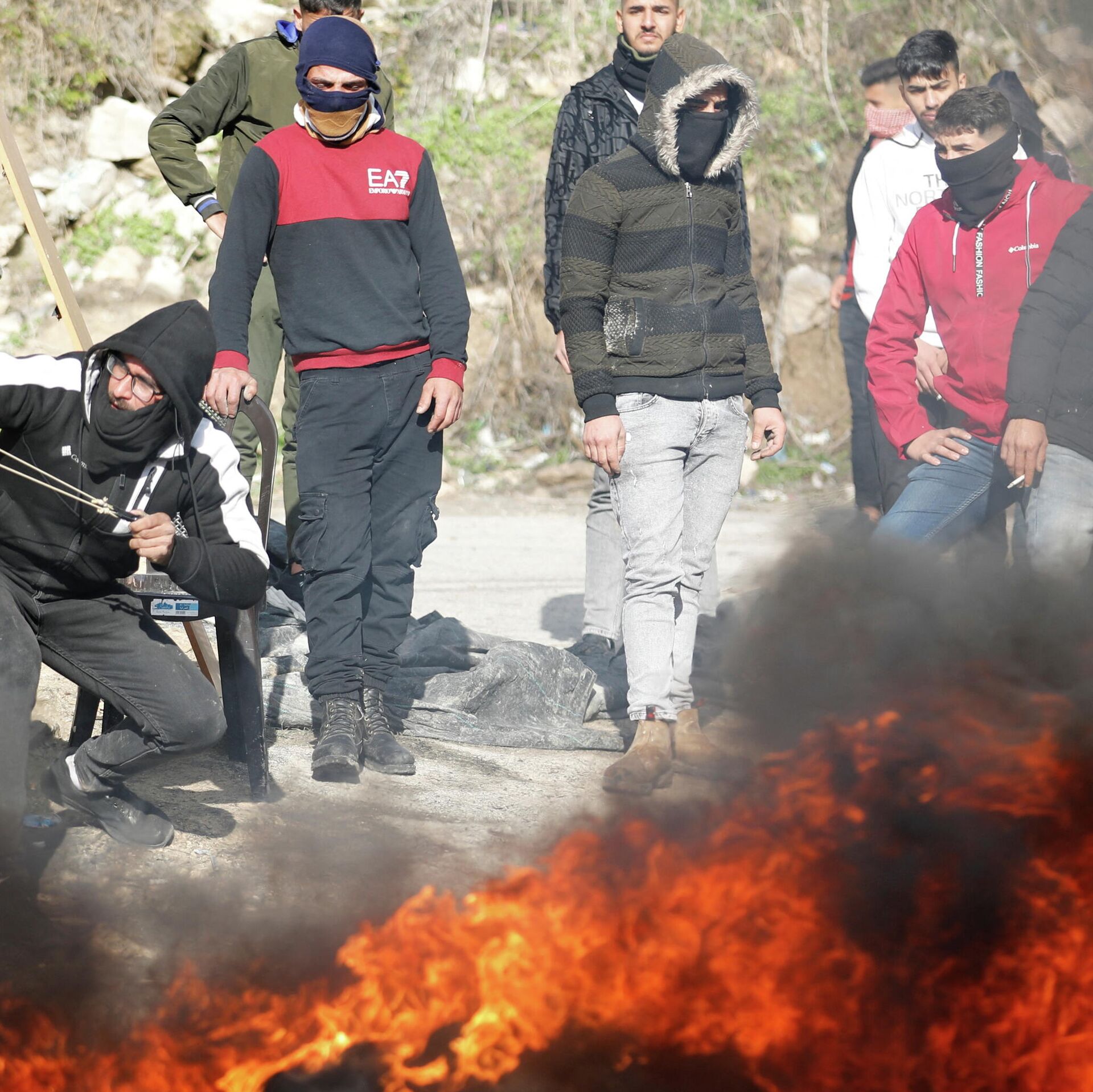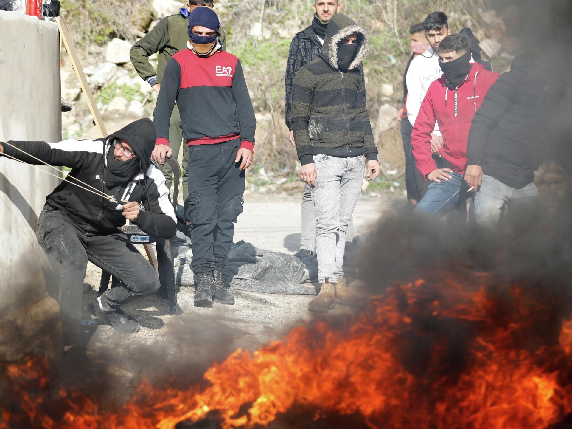 © REUTERS / RANEEN SAWAFTAمتظاهرون فلسطينيون أمام حاجز من الإطارات المشتعلة احتجاجاً على تشييد مستوطنة في قرية البرقة، الضفة الغربية المحتلة، 24 ديسمبر 2021