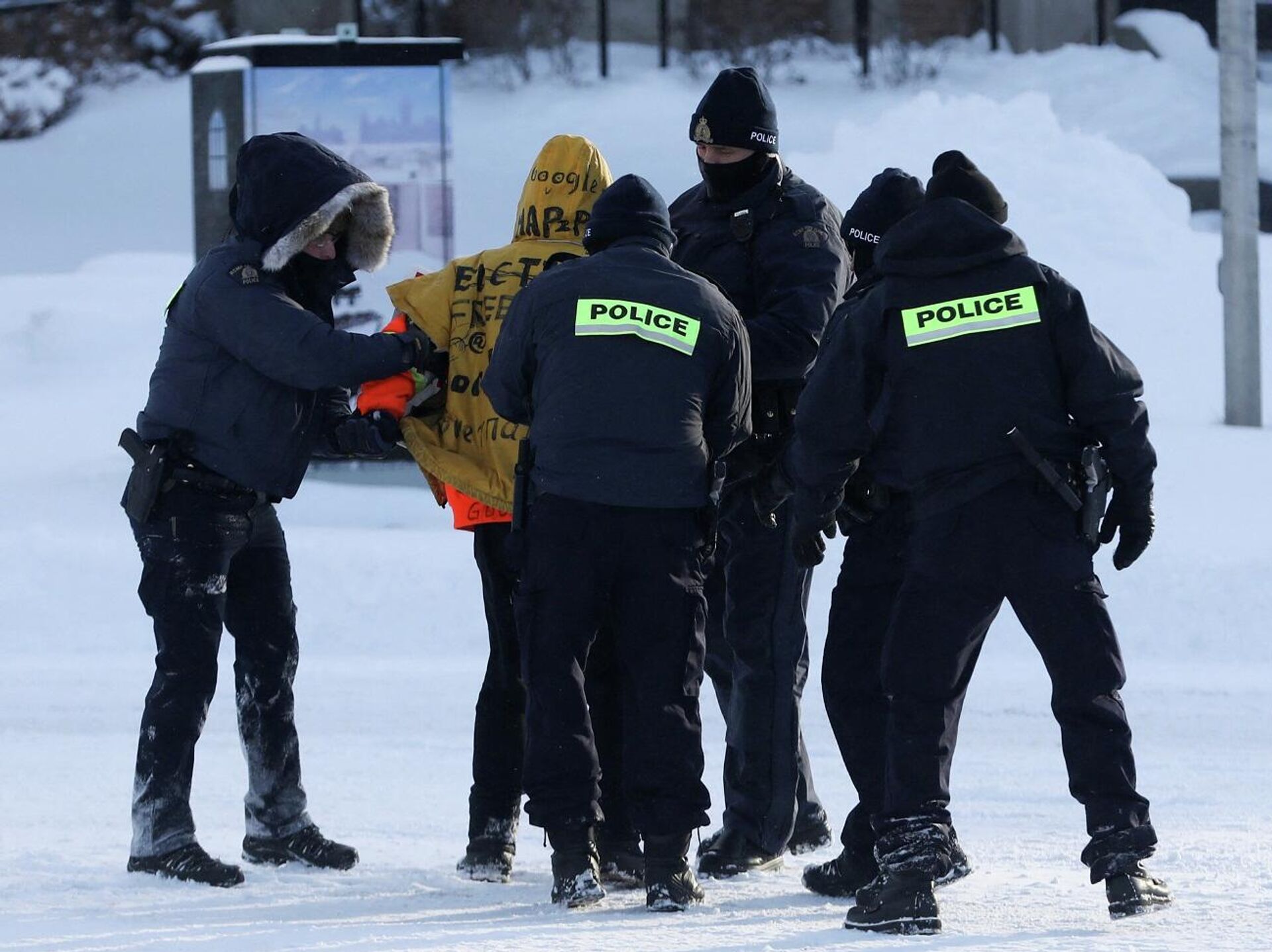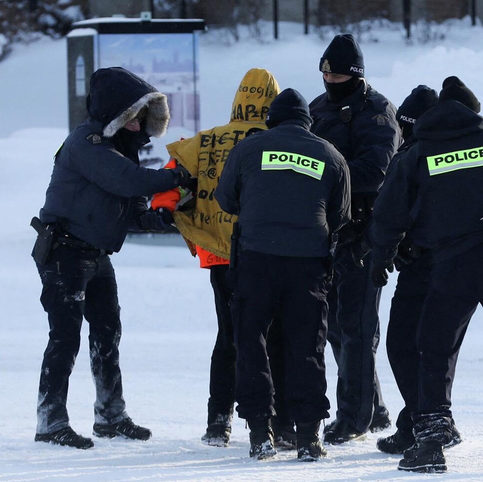 واتخذت الشرطة الكندية أول تحرك لها لإنهاء الحصار في وقت متأخر من أمس الخميس، باعتقال اثنين من قادة الاحتجاج الرئيسيين، كما انهم أغلقوا الكثير من منطقة وسط المدينة أمام الغرباء، لمنعهم من القدوم لمساعدة المحتجين على غرار "قافلة الحرية".