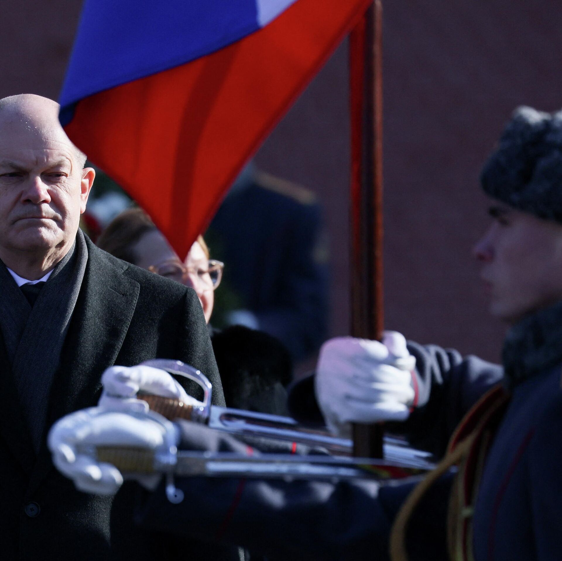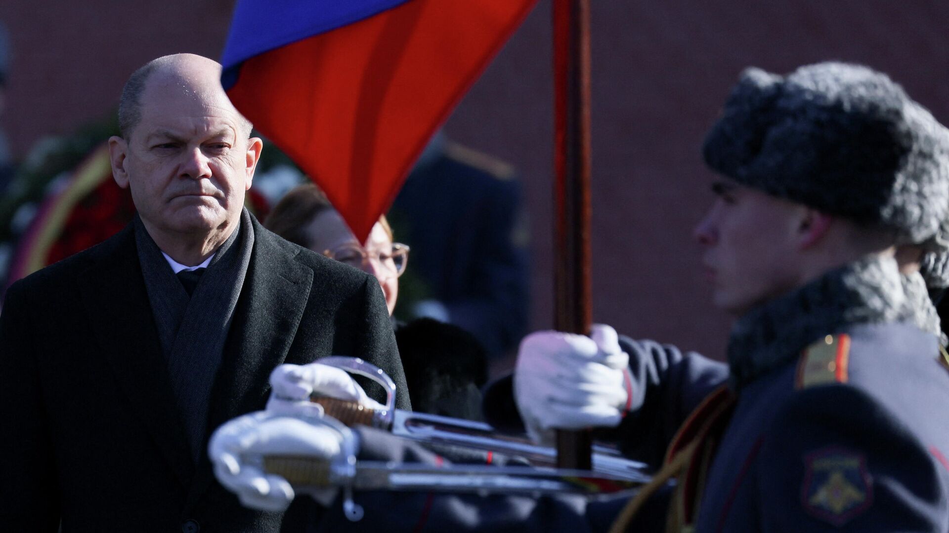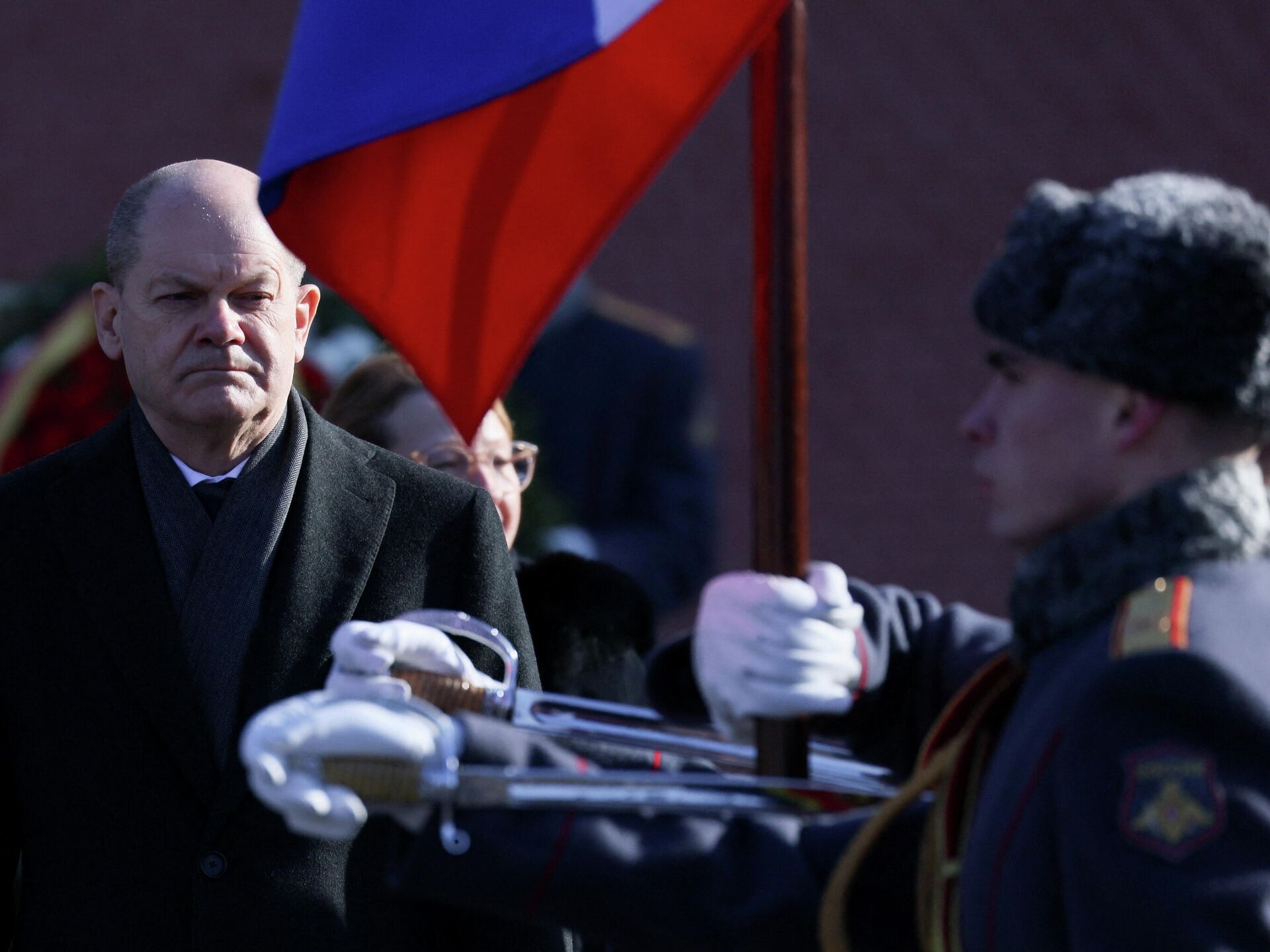 مستشار ألمانيا أولاف شولتز يشارك في مراسم وضع إكليل من الزهور على قبر الجندي المجهول في حديقة ألكسندر في موسكو، روسيا 15 فبراير 2022