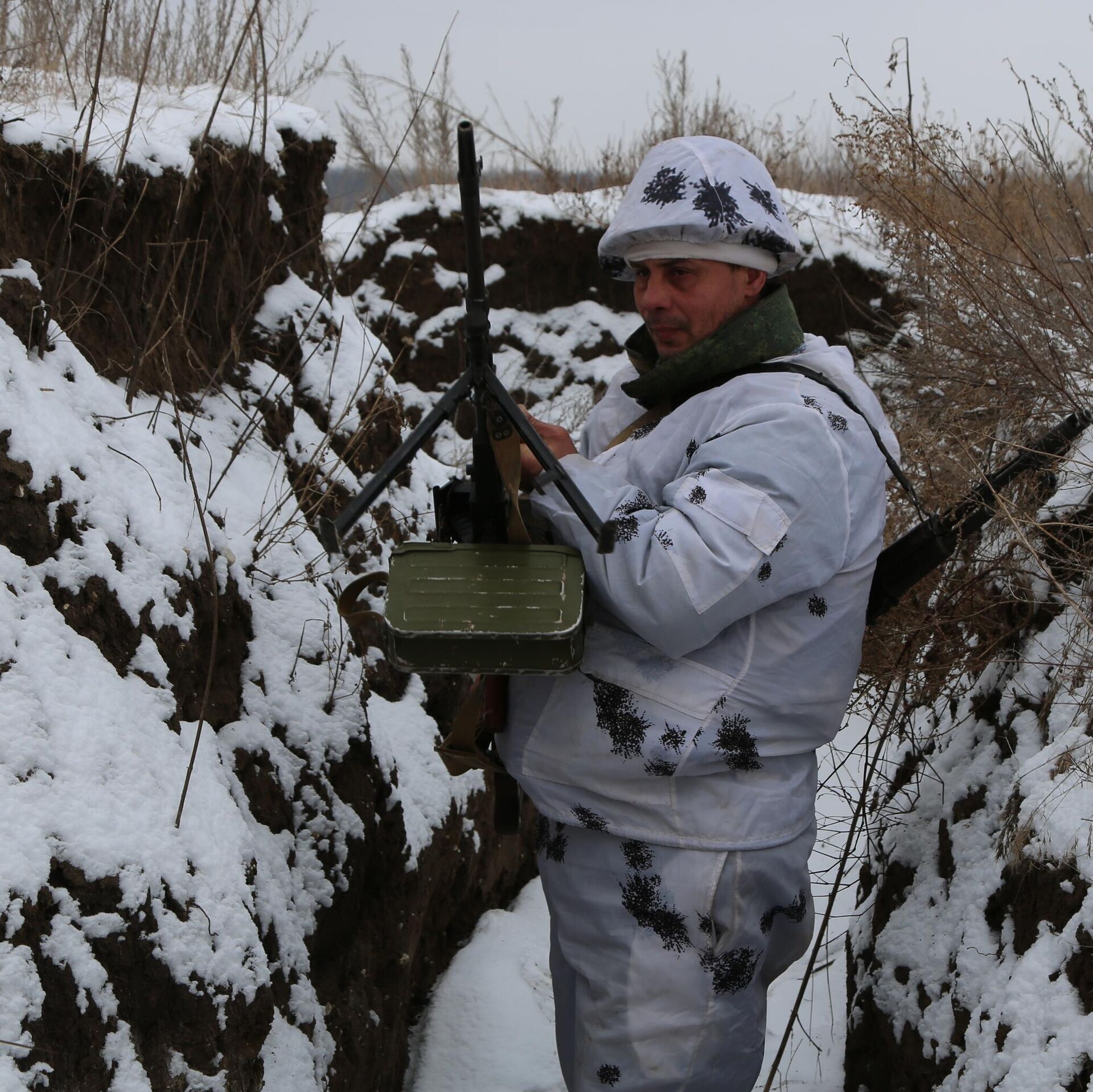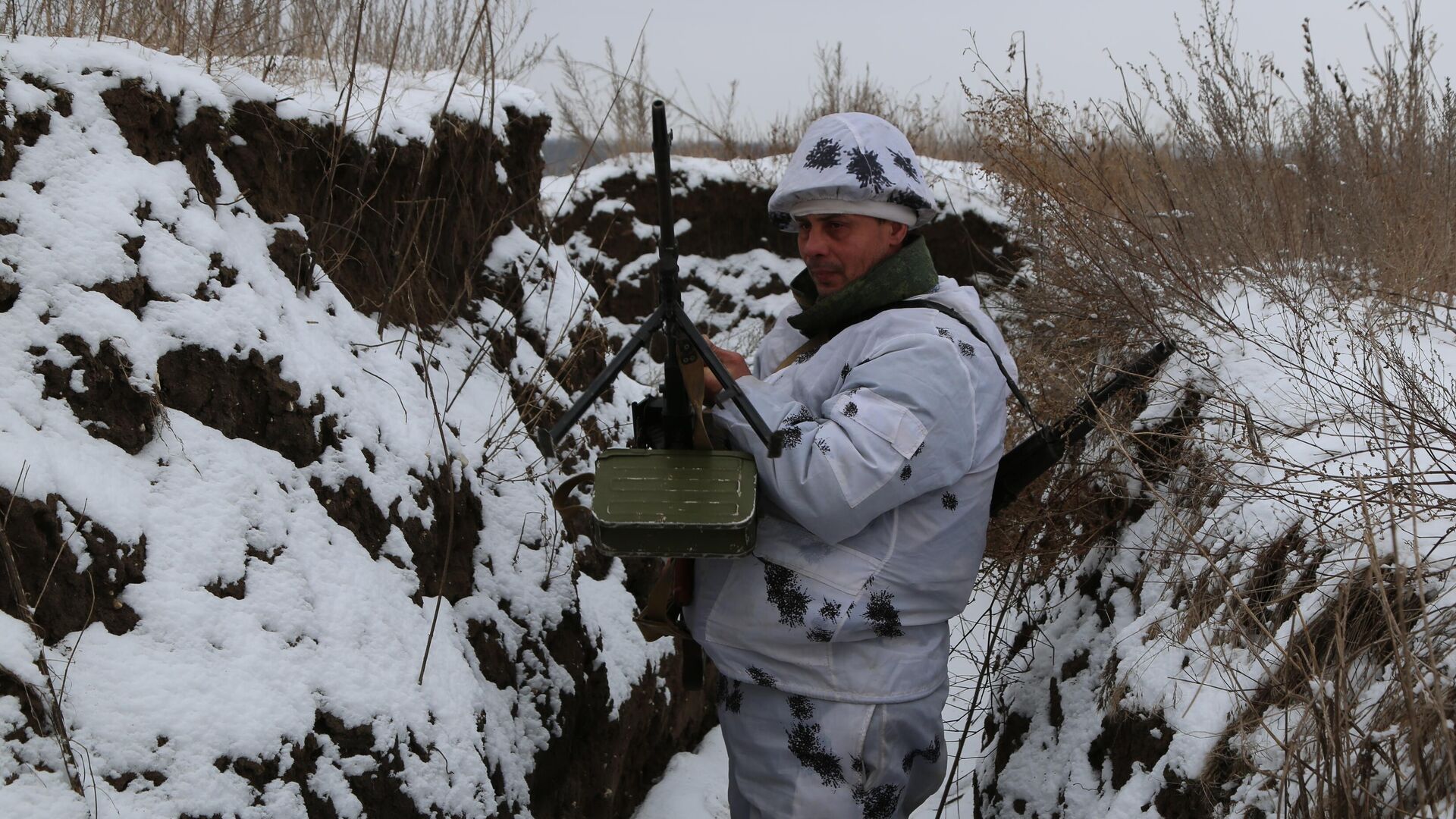 © Sputnik . Сергей Аверин / الانتقال إلى بنك الصورجندي من القوات المسلحة الشعبية لجمهورية لوغانسك الشعبية يقف في خندق على خط التماس مع القوات المسلحة الأوكرانية في قرية سلافيانوسربسك في منطقة لوغانسك، شرق أوكرانيا 25 يناير 2022