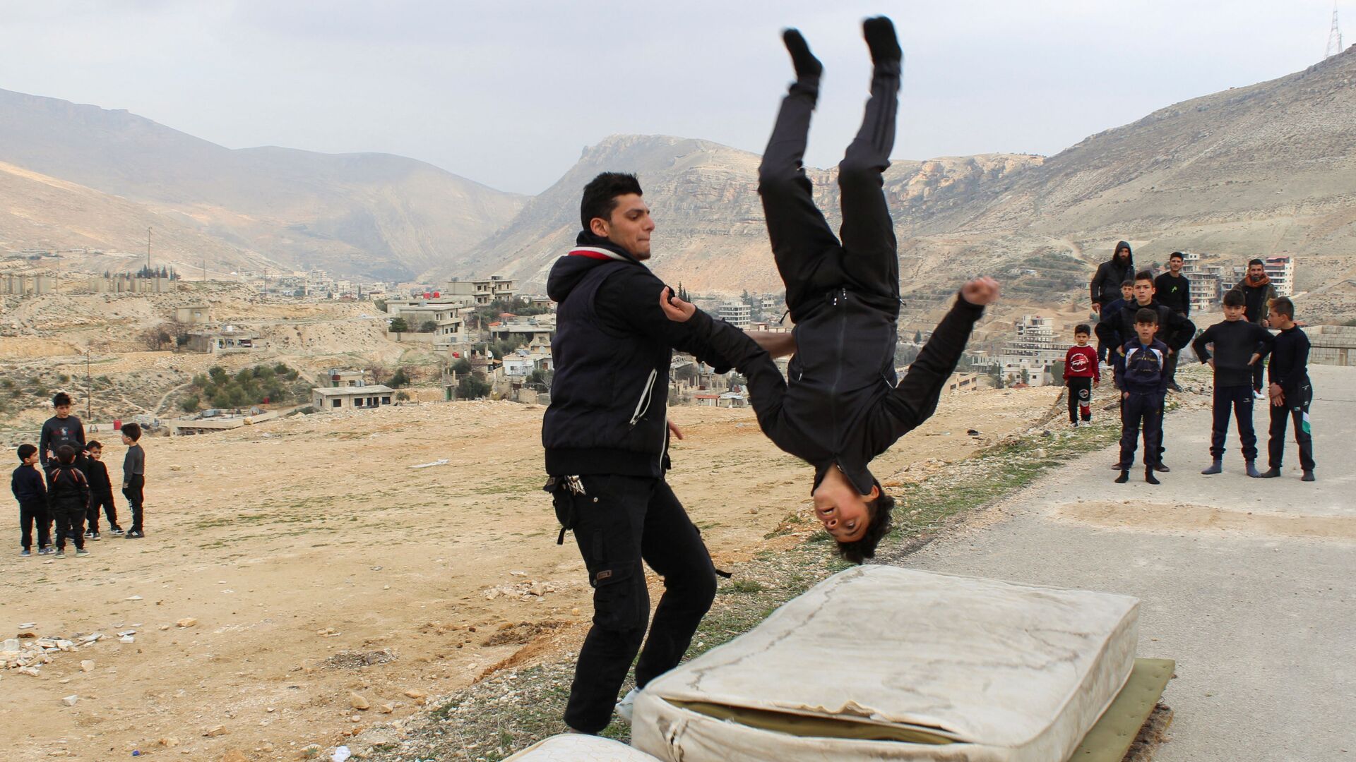 فتى يشارك في دورة تدريبية في الهواء الطلق مع مدرب فنون القتال السوري حسن منصور في وادي بردى بريف دمشق، سوريا، 27 فبراير 2022.