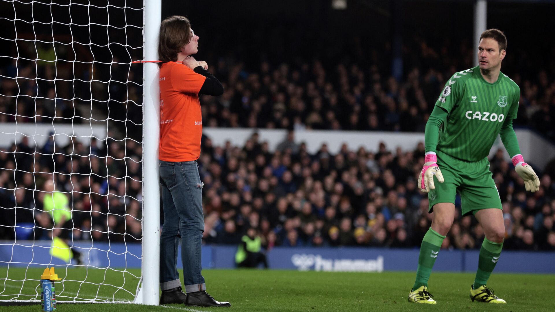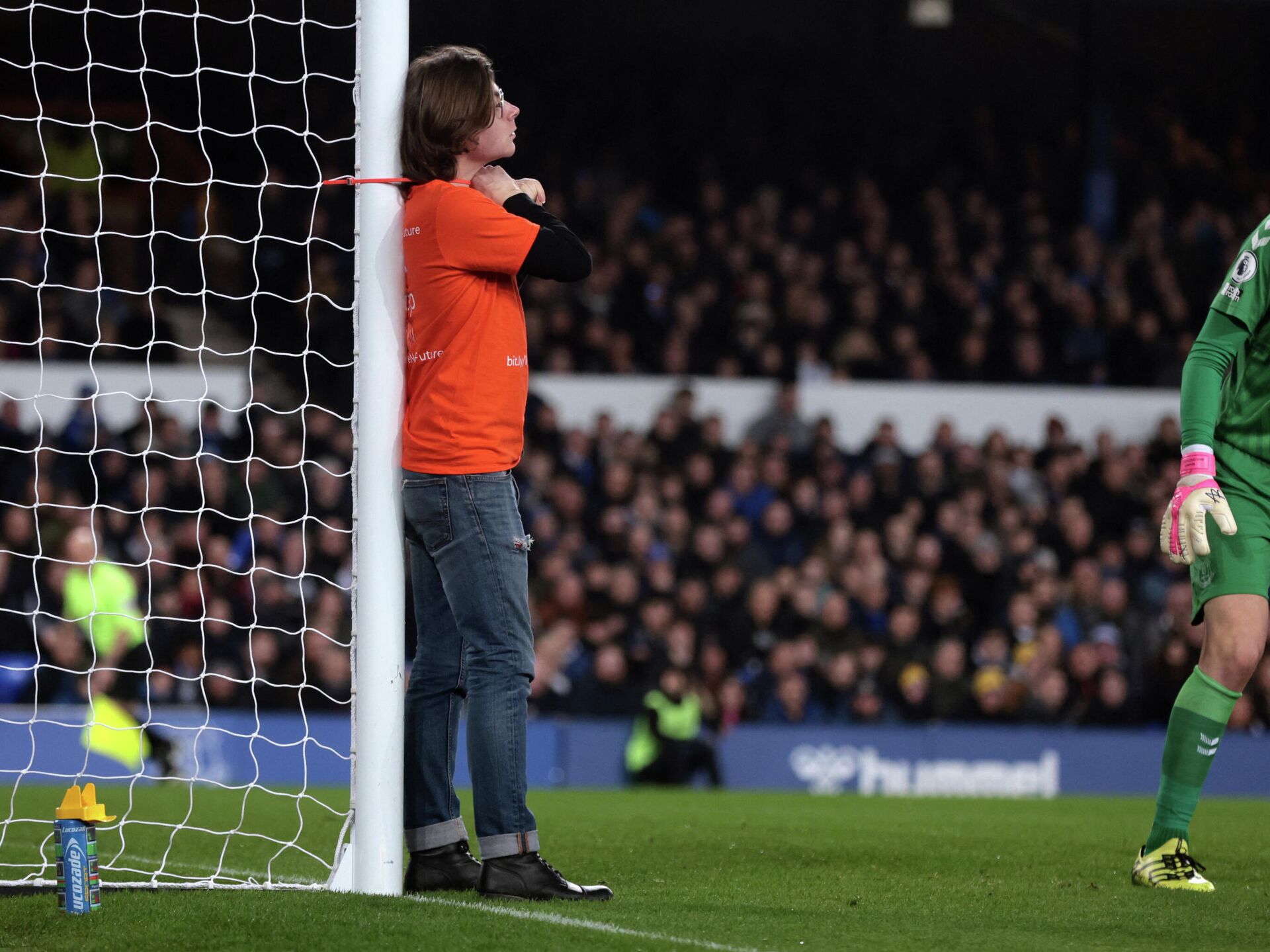 The Everton vs Newcastle game had to be halted after a protestor tied himself by his neck to a goalpost. 😱