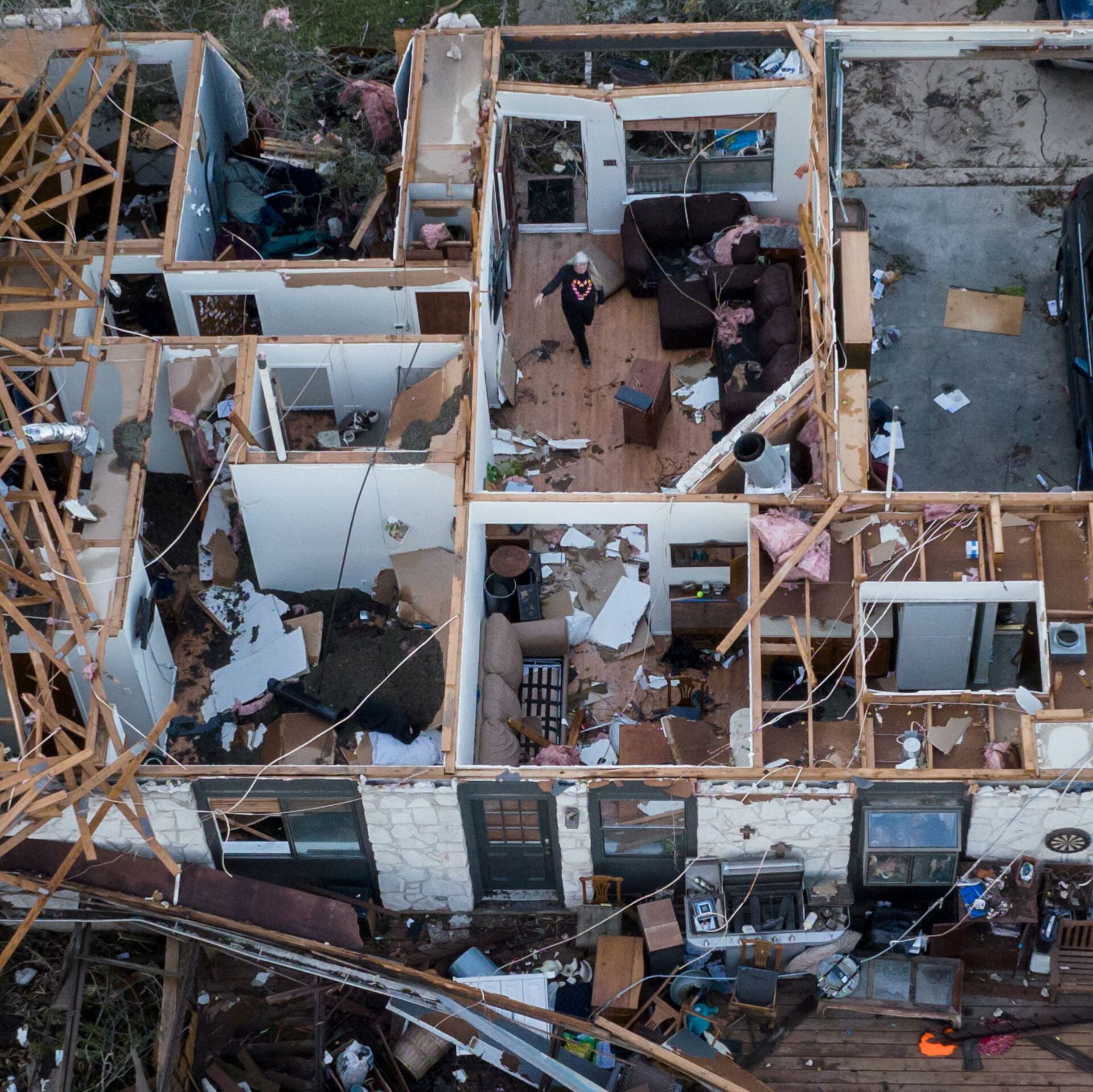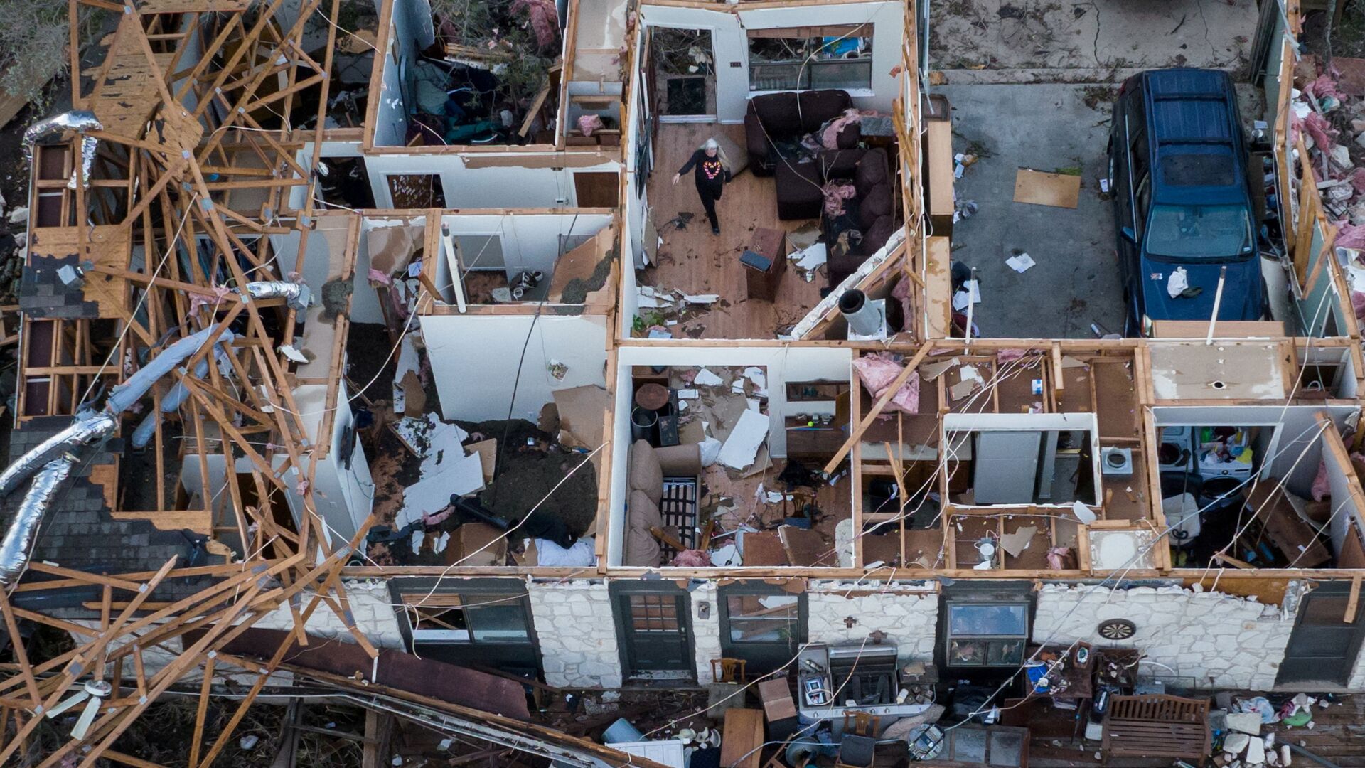 أسقطت الرياح القوية شجرة على منزل، مما تسبب في انهيار جزء من السقف والجدار الخارجي، في إدواردز بولاية ميسيسيبي.يعكس الضرر مواقف مماثلة في جميع أنحاء ولاية ميسيسيبي حيث تسابق الطقس القاسي بما في ذلك الأعاصير في جميع أنحاء الولاية. 22 مارس 2022