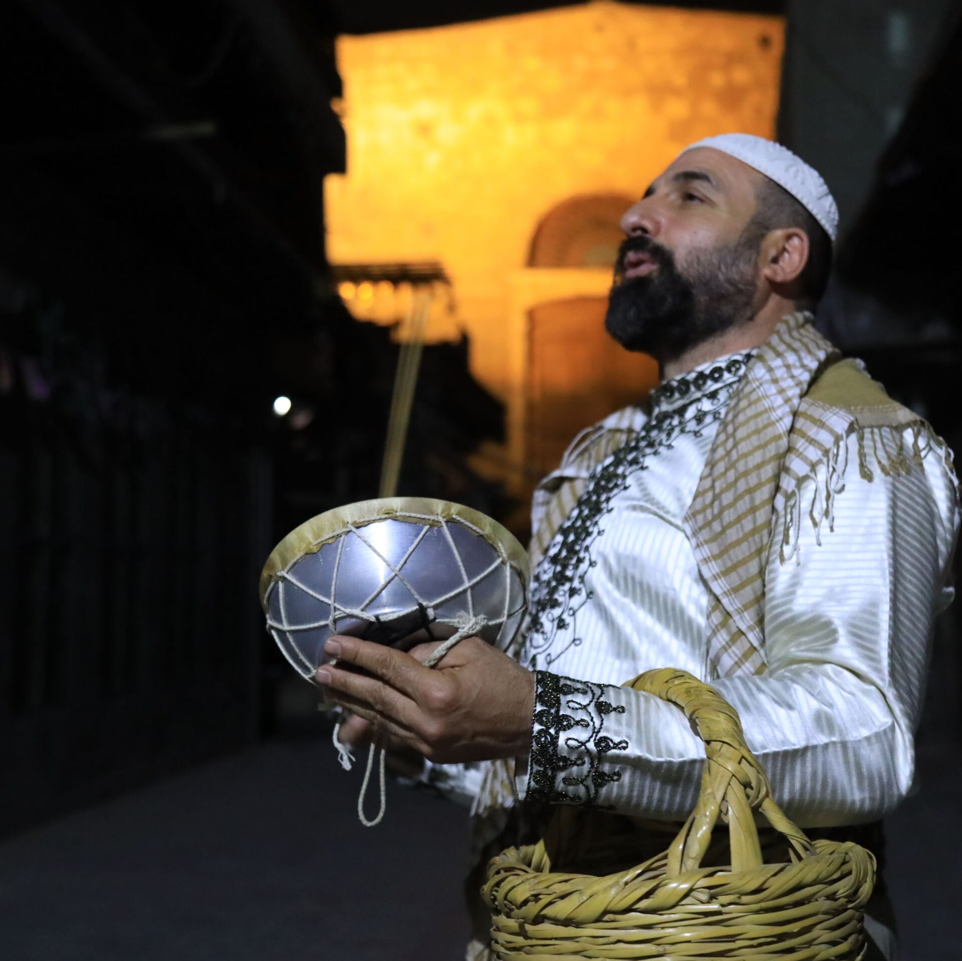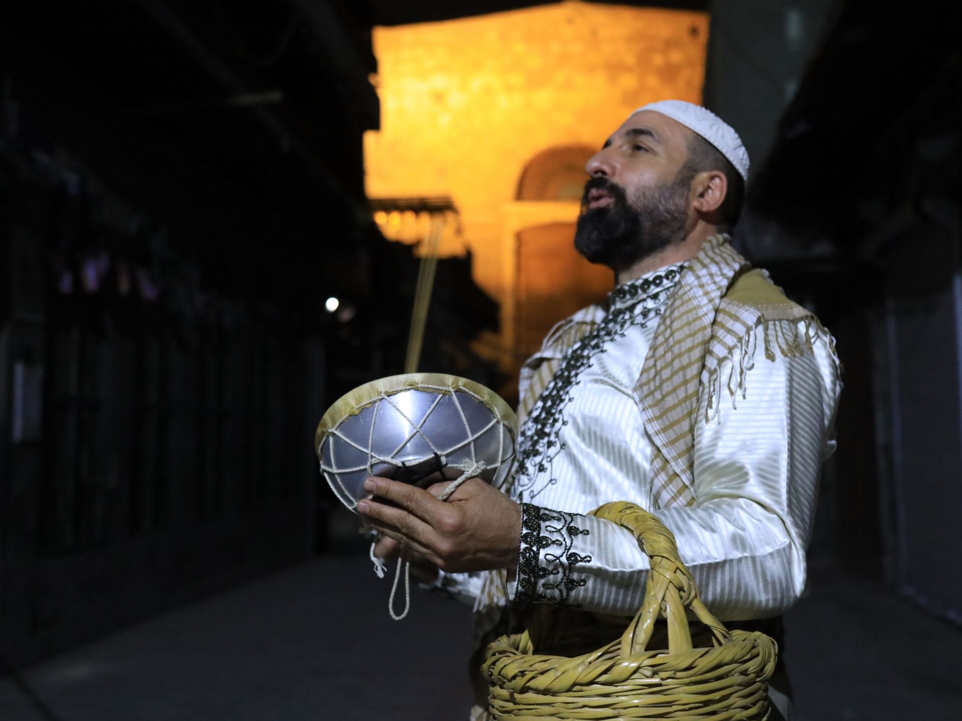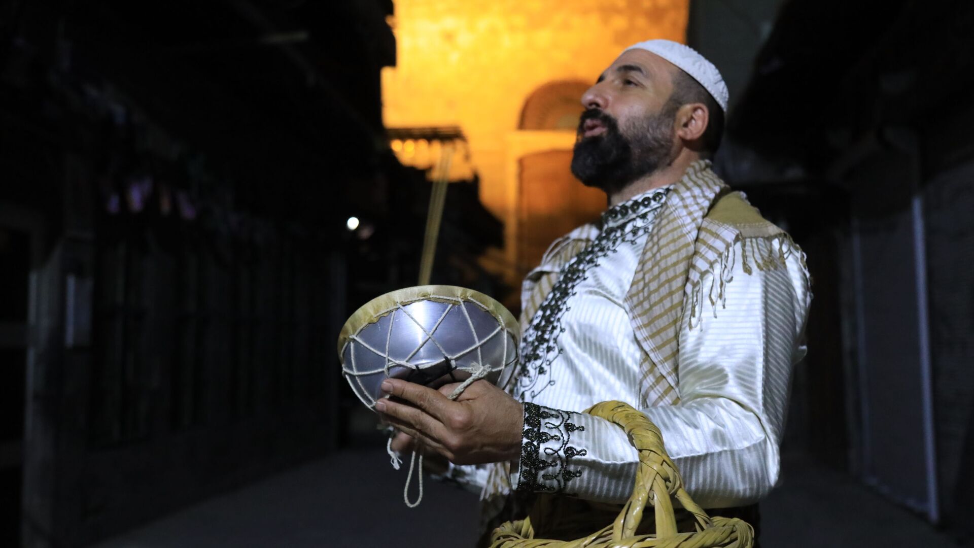 في الثانية من منتصف الليل يبدأ رحلته في منطقته، يحمل طبلته يدق عليها ثلاث دقات ويكررها مع كلمات تراثية غالبا ما يبدأها بجملة "أصحى يا نايم وحد الدايم رمضان... 02.04.2022, سبوتنيك عربي