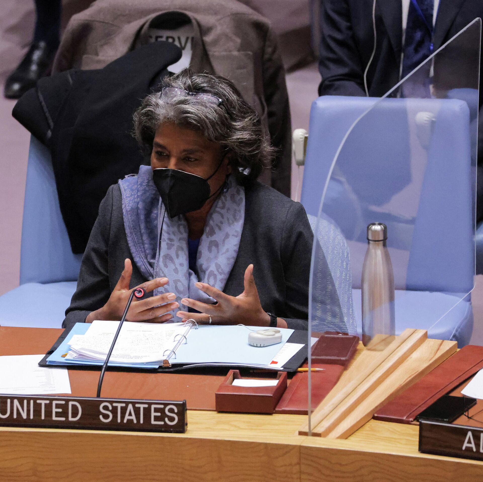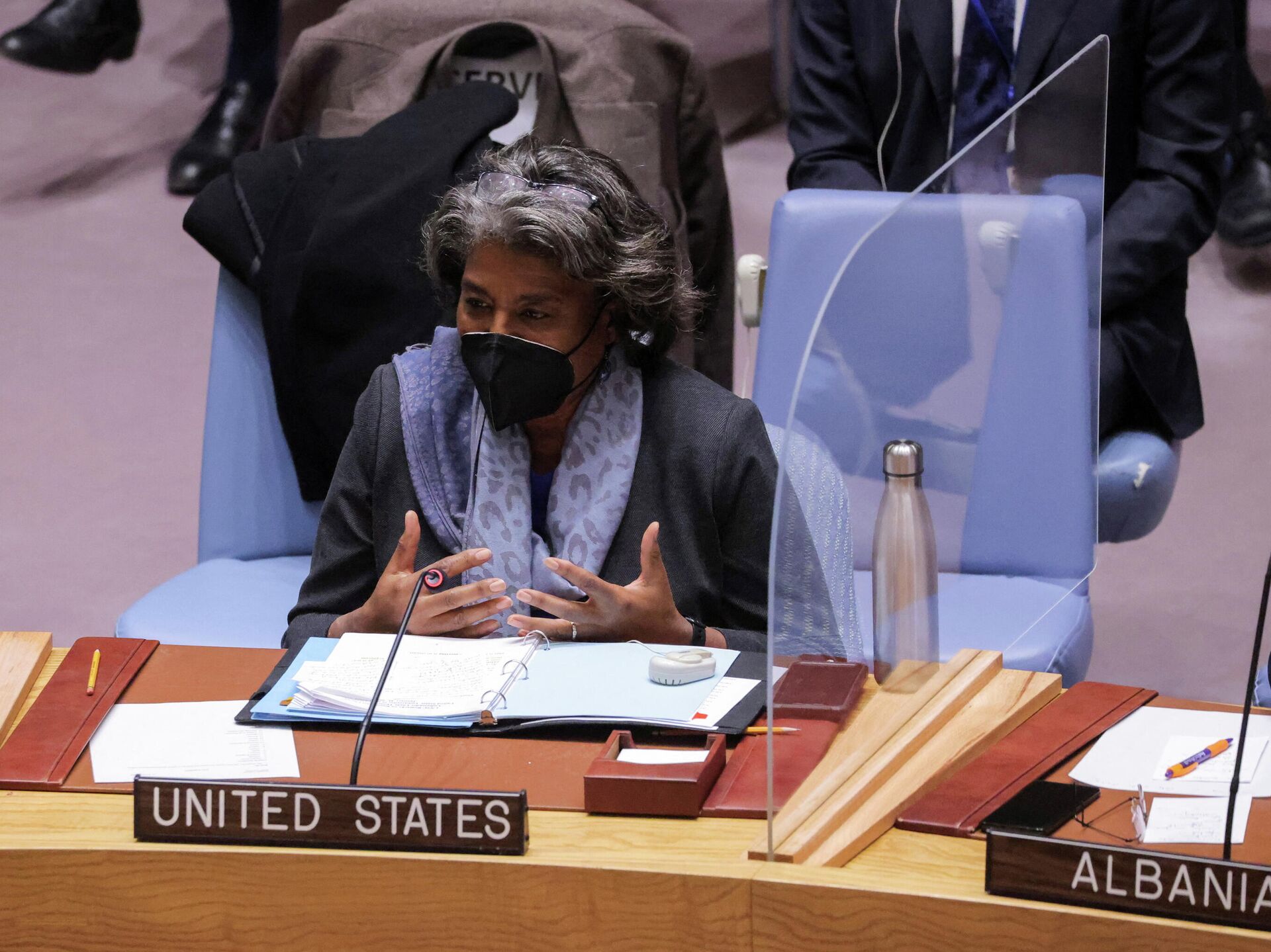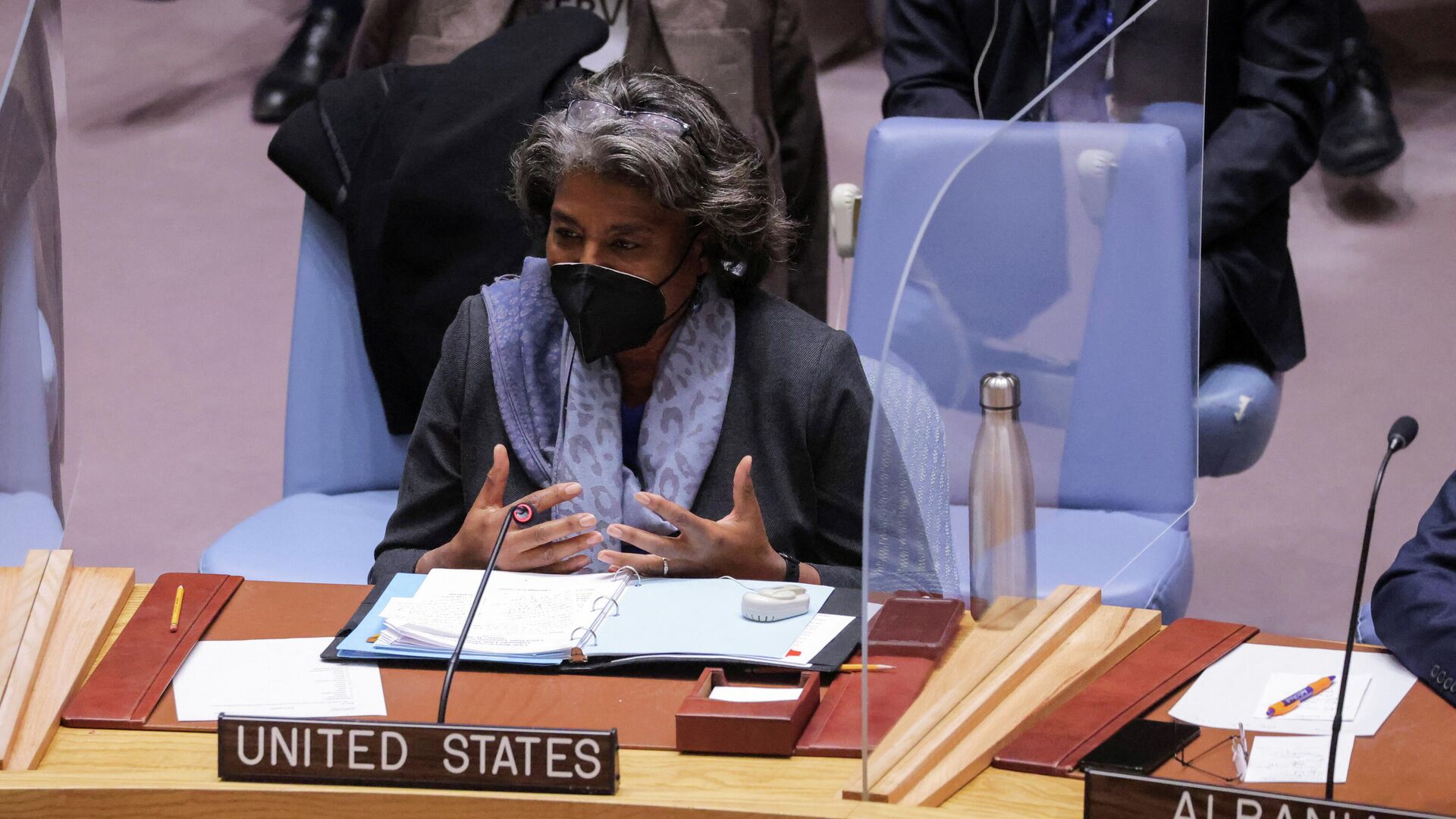 © REUTERS / ANDREW KELLYسفيرة الولايات المتحدة لدى الأمم المتحدة ليندا توماس جرينفيلد خلال جلسة نقاش مجلس الأمن الدولي حول أزمة أوكرانيا وروسيا، الأمم المتحدة، نيويورك، الولايات المتحدة 31 يناير 2022