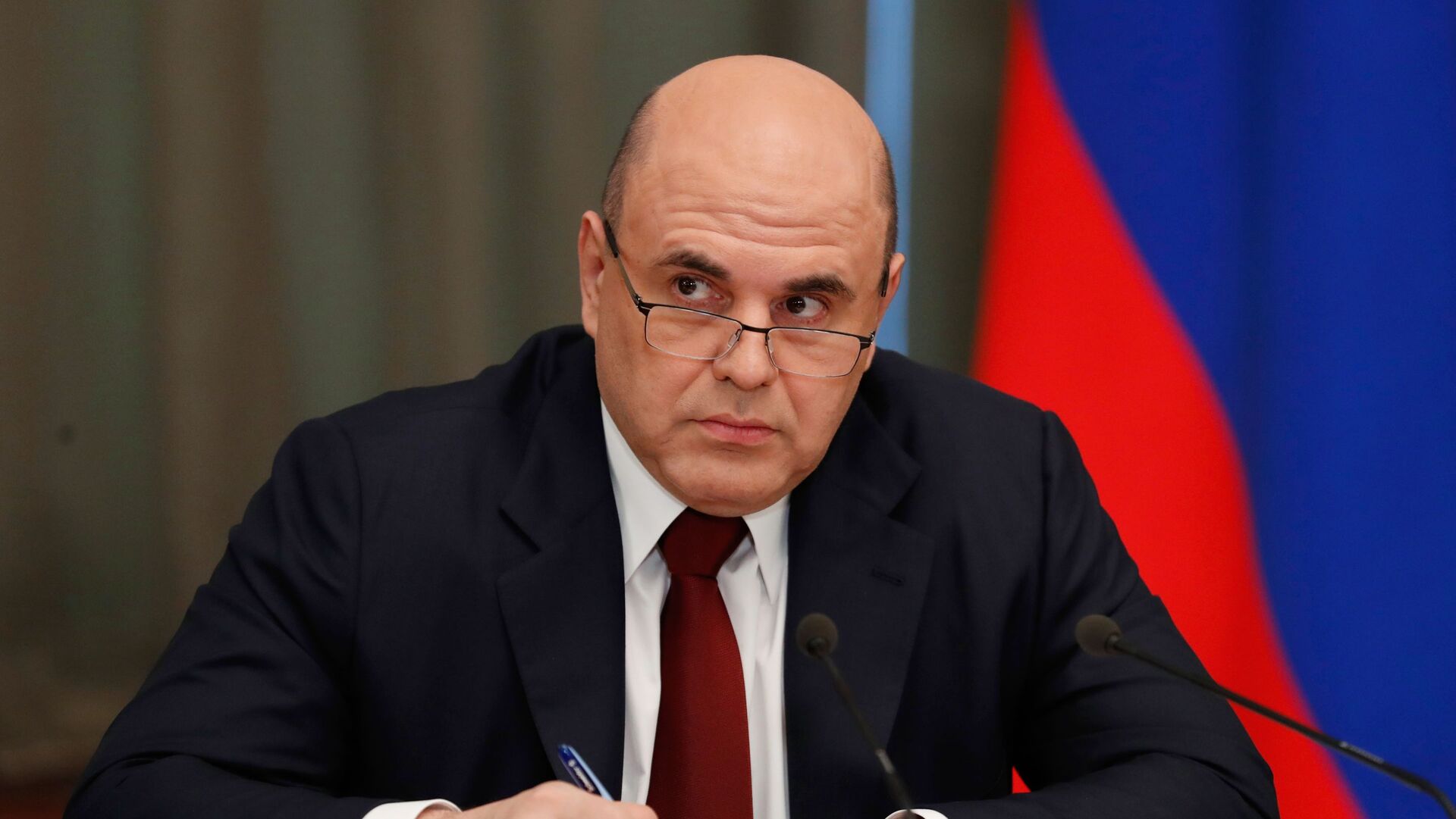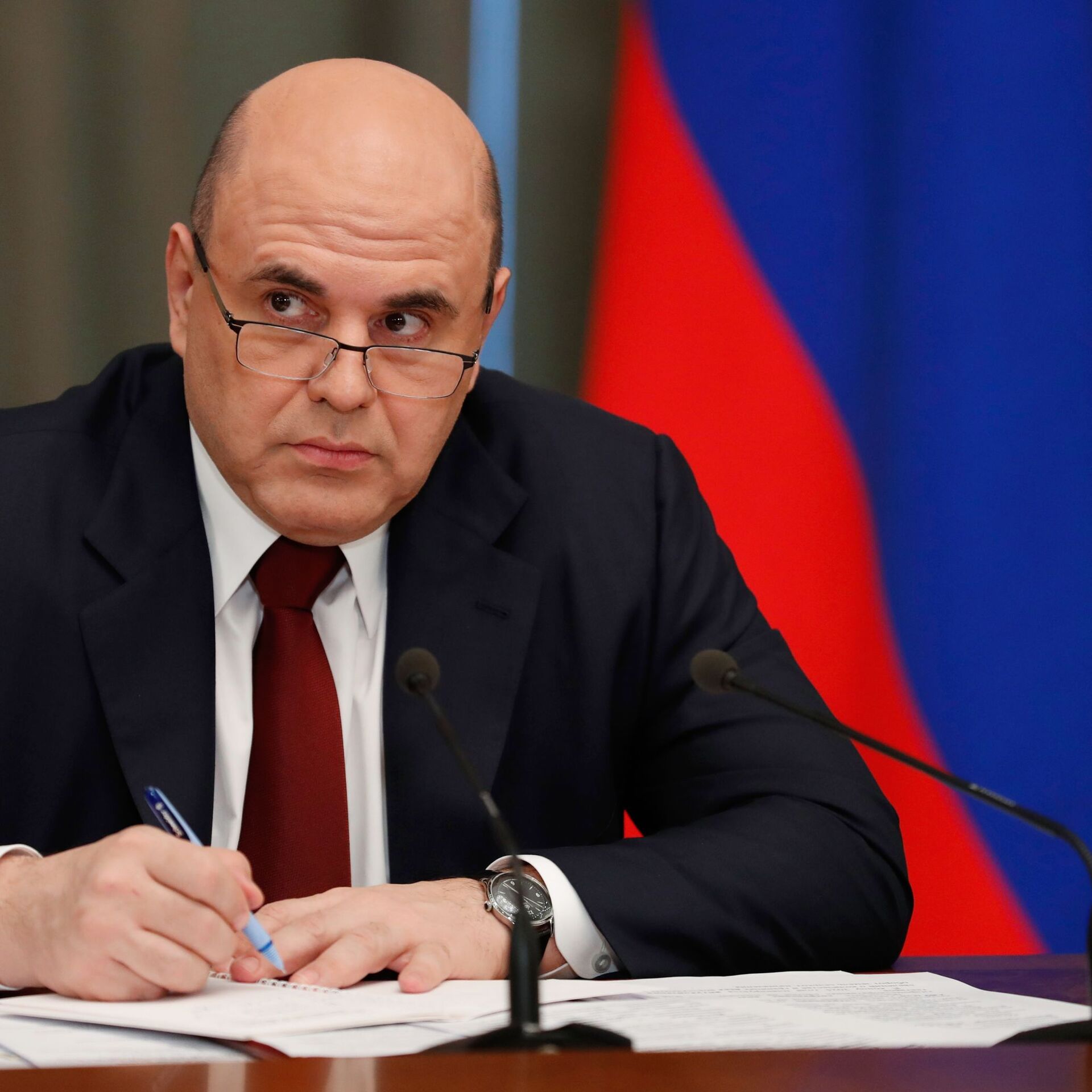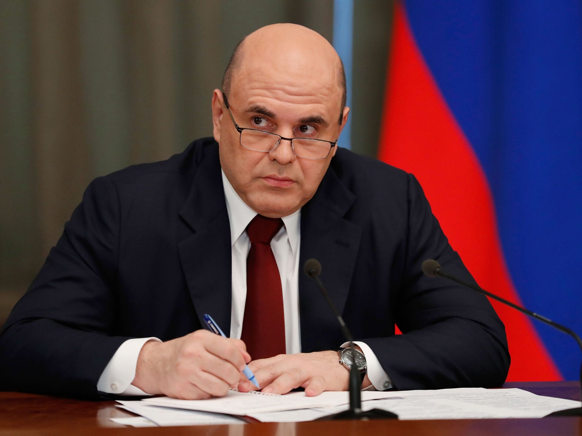 © Sputnik . Dmitriy Astakhov / الانتقال إلى بنك الصوررئيس الحكومة الروسية ميخائيل ميشوستين، الدوما، موسكو، روسيا 28 أبريل 2021