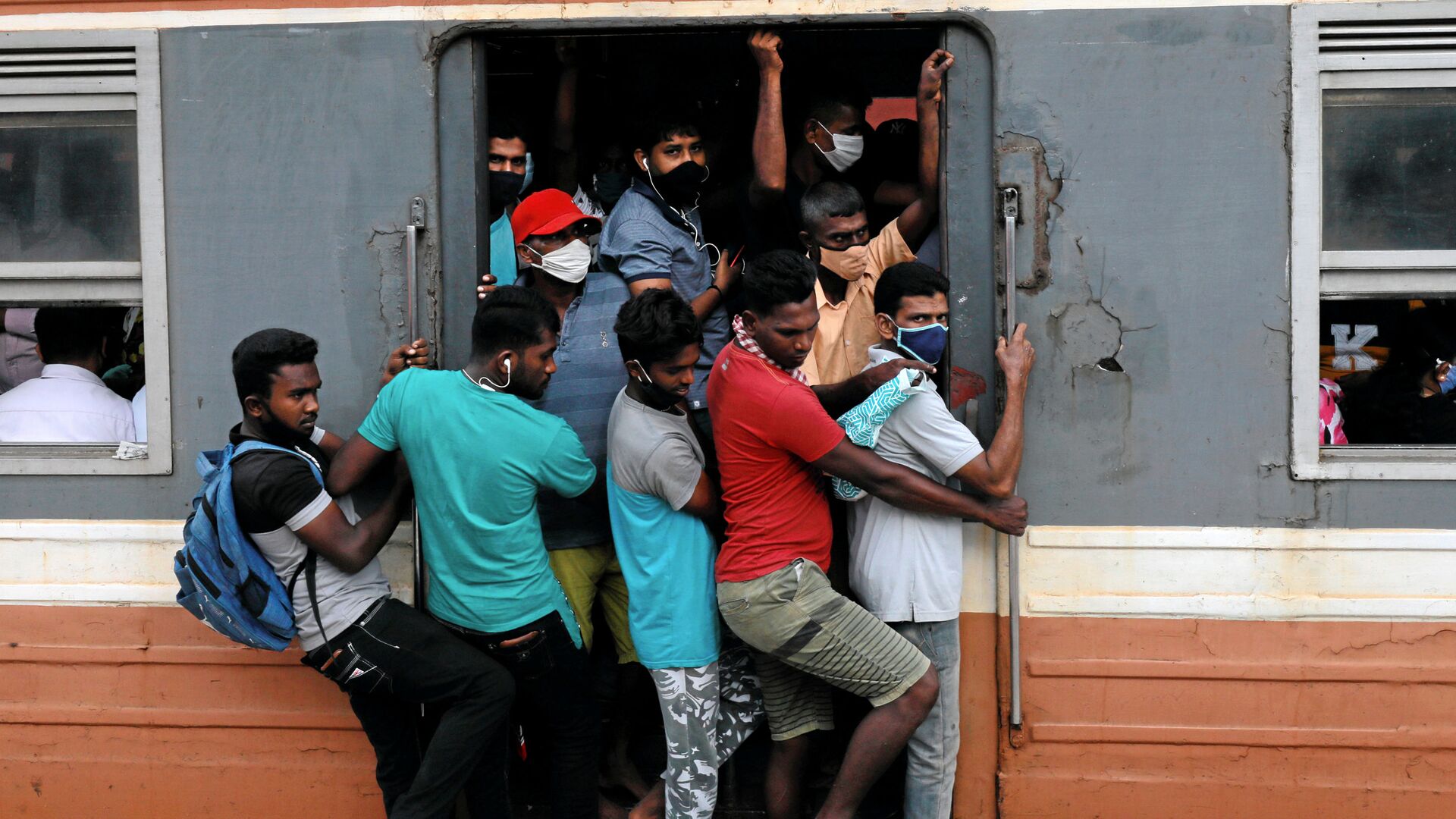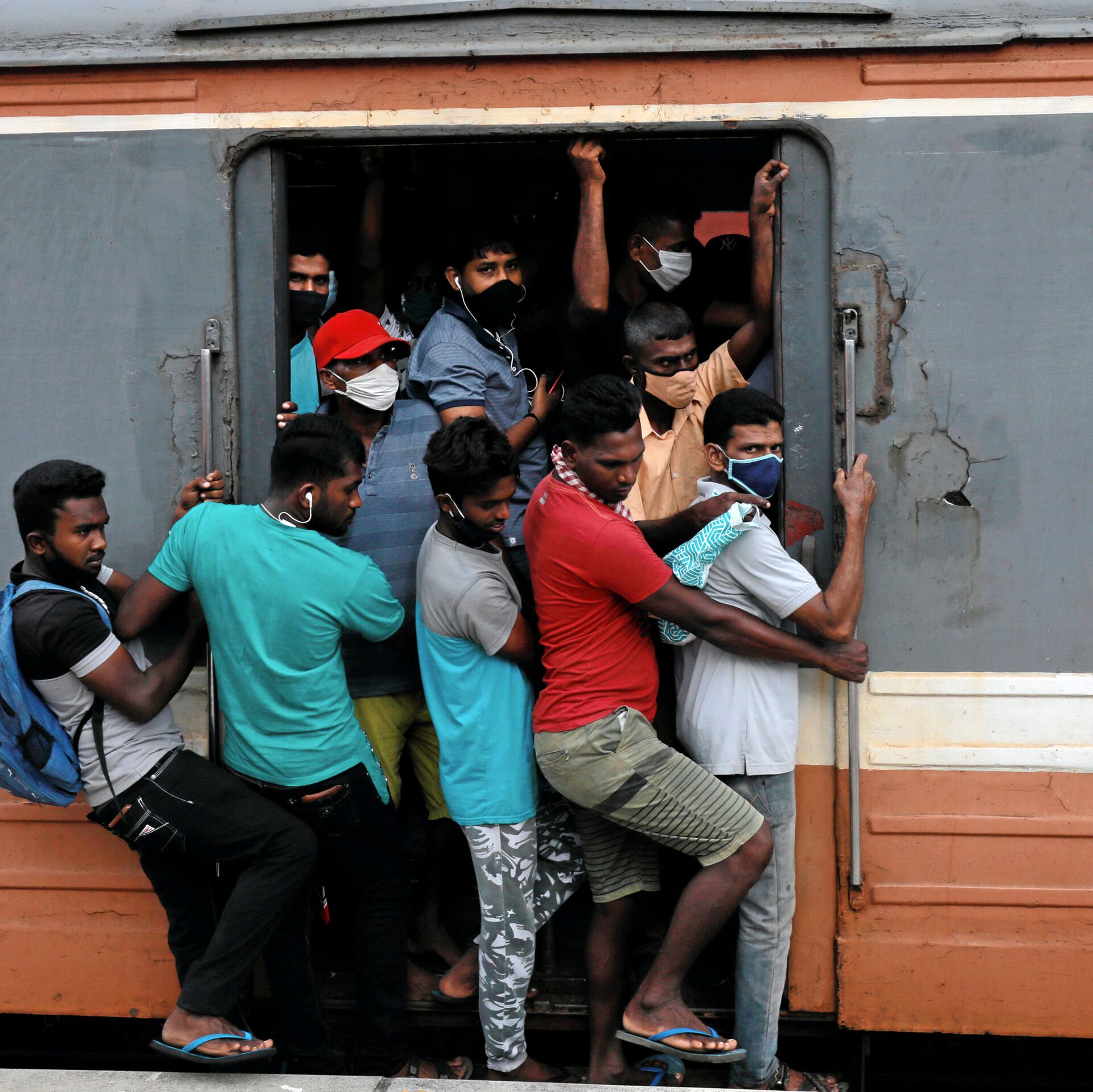 © REUTERS / Dinuka Liyanawatte مسافرون يرتدون كمامات في قطار مزدحم متجه نحو العاصمة، وسط مخاوف من انتشار مرض الفيروس التاجي (كوفيد-19)، في كولومبو، سريلانكا، 8 يوليو 2020.