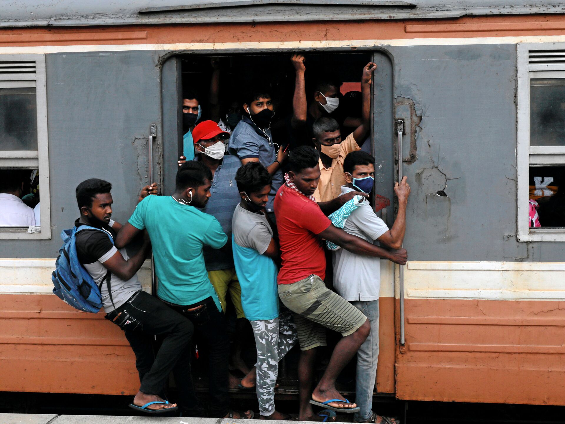 مسافرون يرتدون كمامات في قطار مزدحم متجه نحو العاصمة، وسط مخاوف من انتشار مرض الفيروس التاجي (كوفيد-19)، في كولومبو، سريلانكا، 8 يوليو 2020. - سبوتنيك عربي, 1920, 12.04.2022