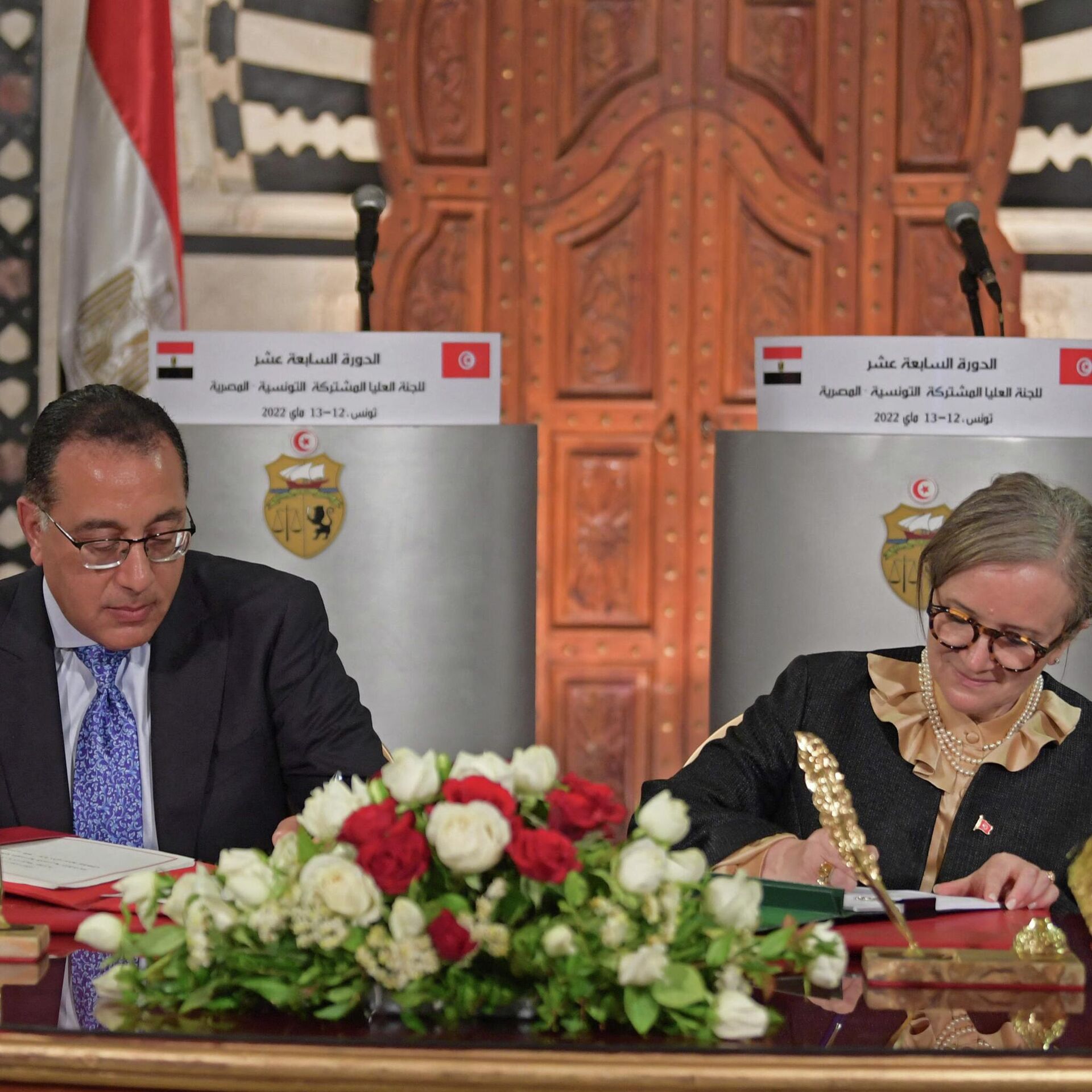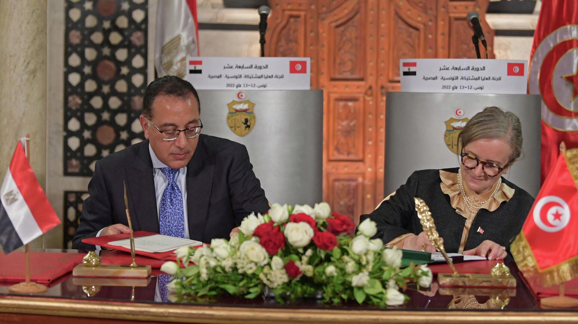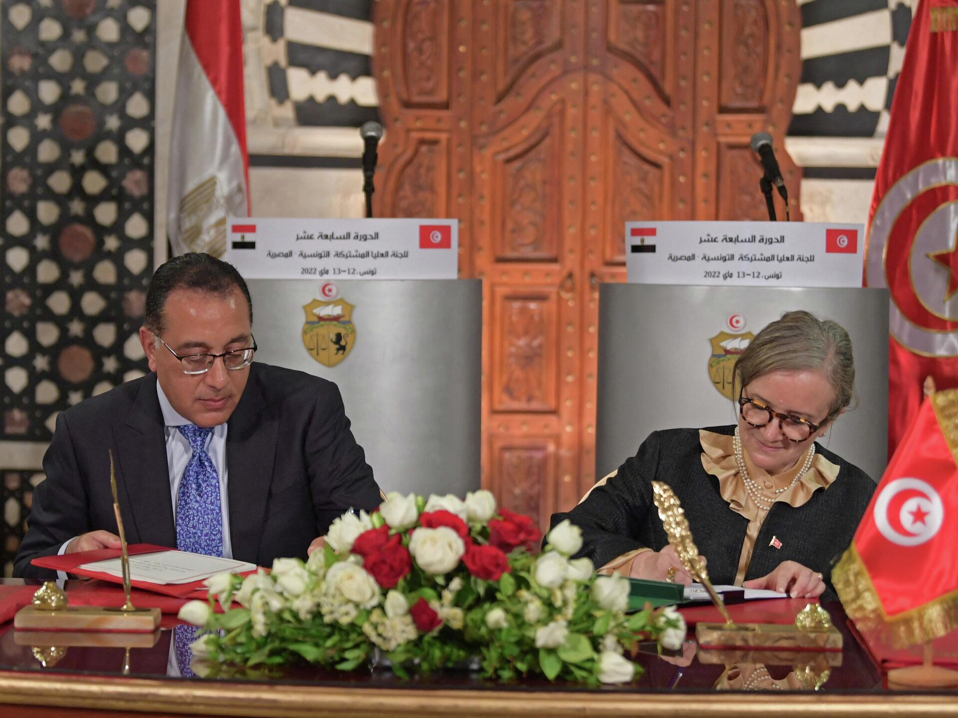 © AFP 2023 / FETHI BELAIDرئيس الوزراء المصري مصطفى مدبولي ورئيسة الحكومة التونسية نجلاء بودن