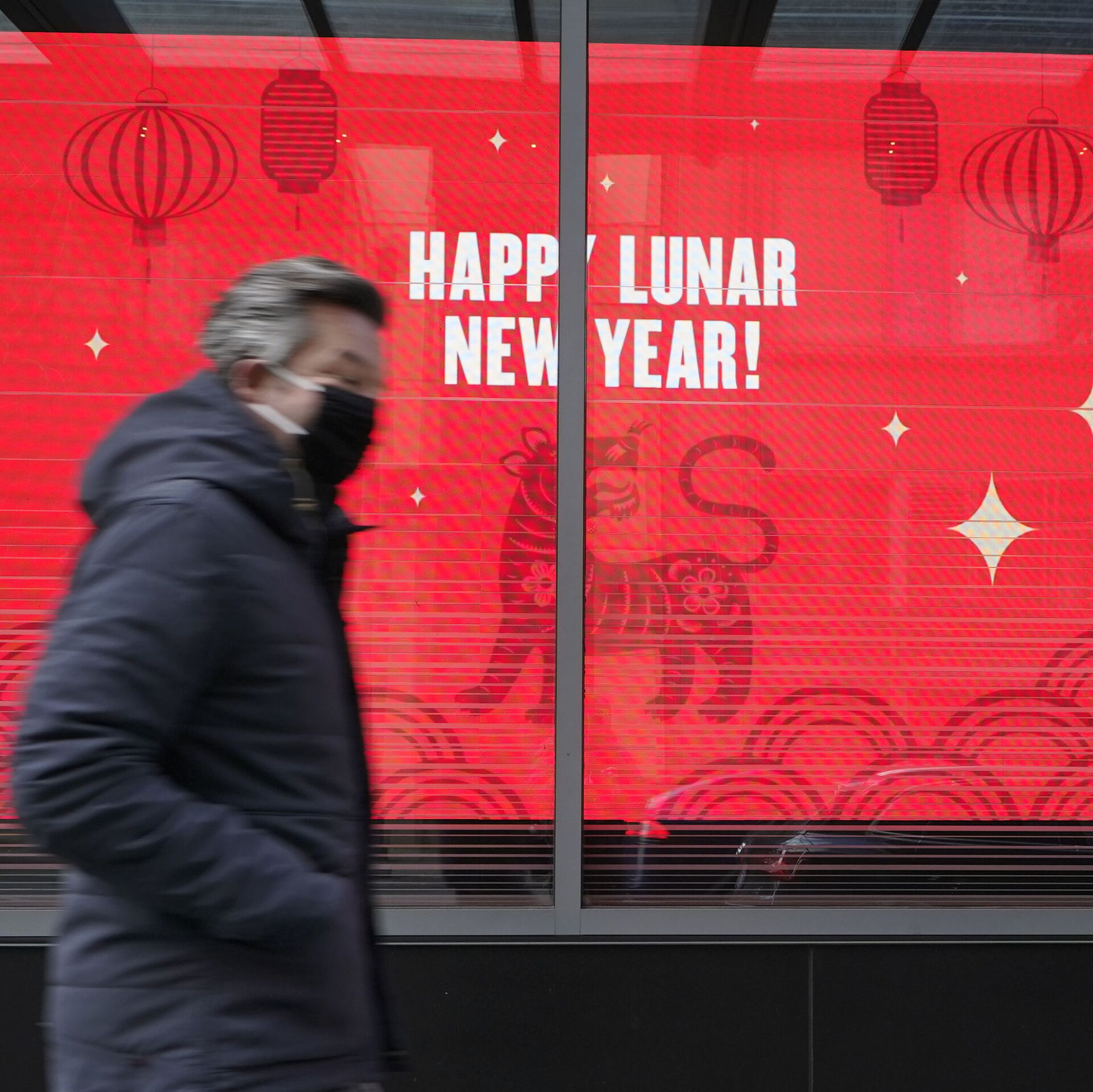 © AP Photo / Ted S. Warrenأحد المارة يرتدي كمامة يحيى بجوار عرض فيديو مع رسالة تهنئة بمناسبة السنة القمرية الجديدة في متجر نوردستروم، وسط مدينة سياتل، الولايات المتحدة 31 يناير 2022