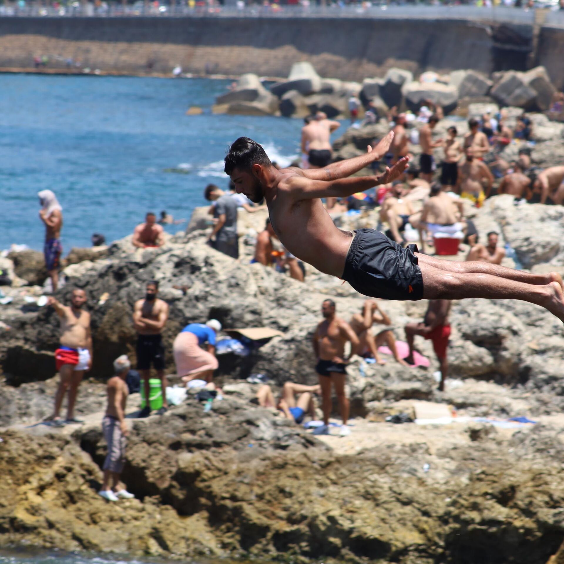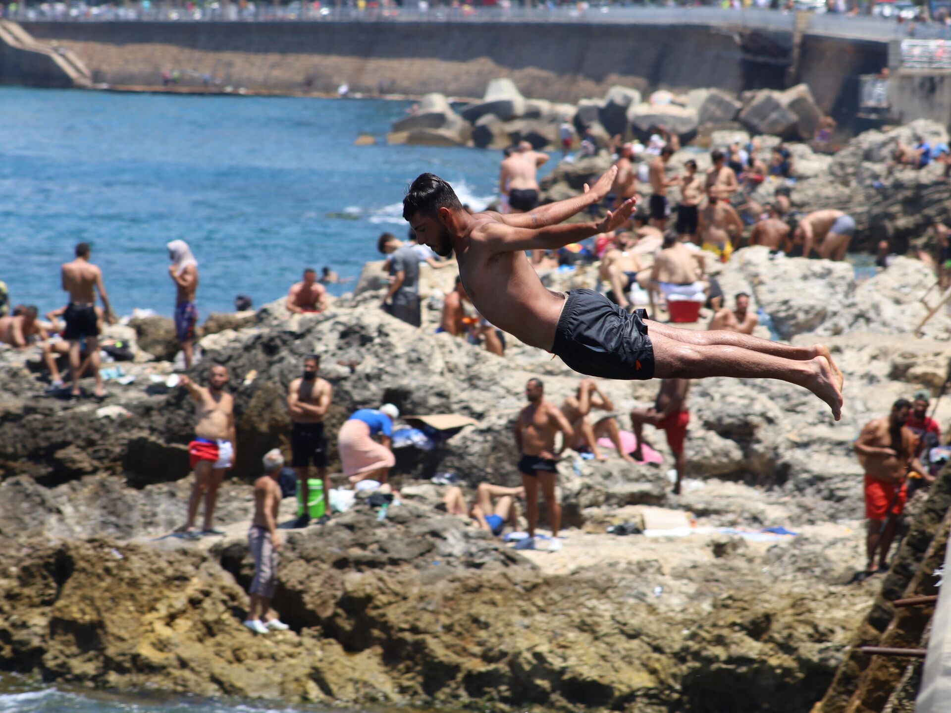 على شاطئ الرملة البيضاء في بيروت المئات من الناس، أفرادا وعائلات جاؤوا ومعهم عدّة الاستجمام من كراسي وطاولات ومظلات بالإضافة إلى الطعام وغيره، مقصدهم الاستمتاع.