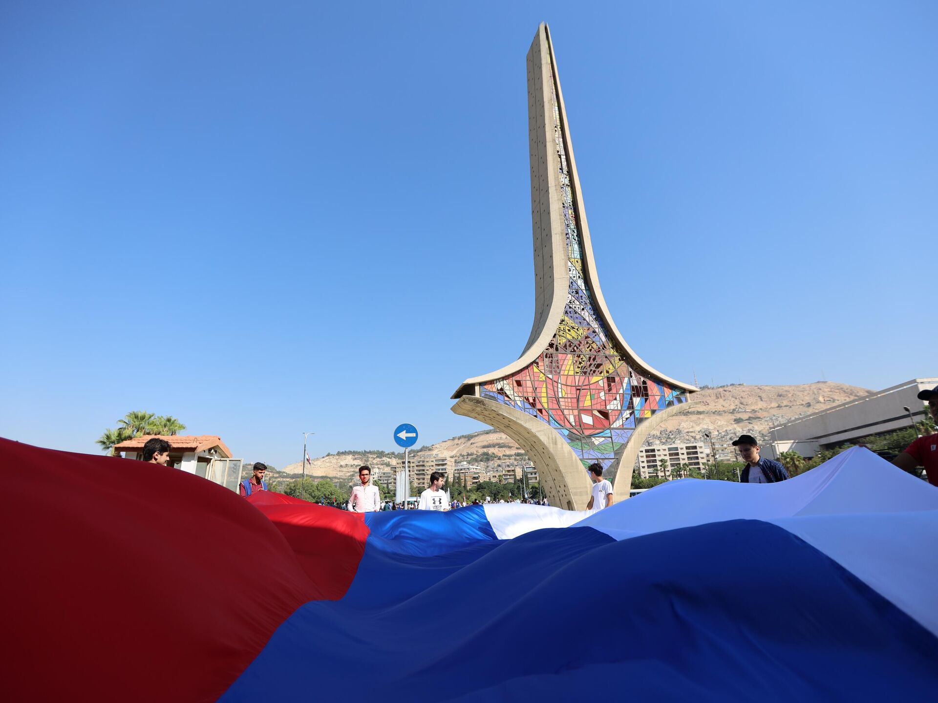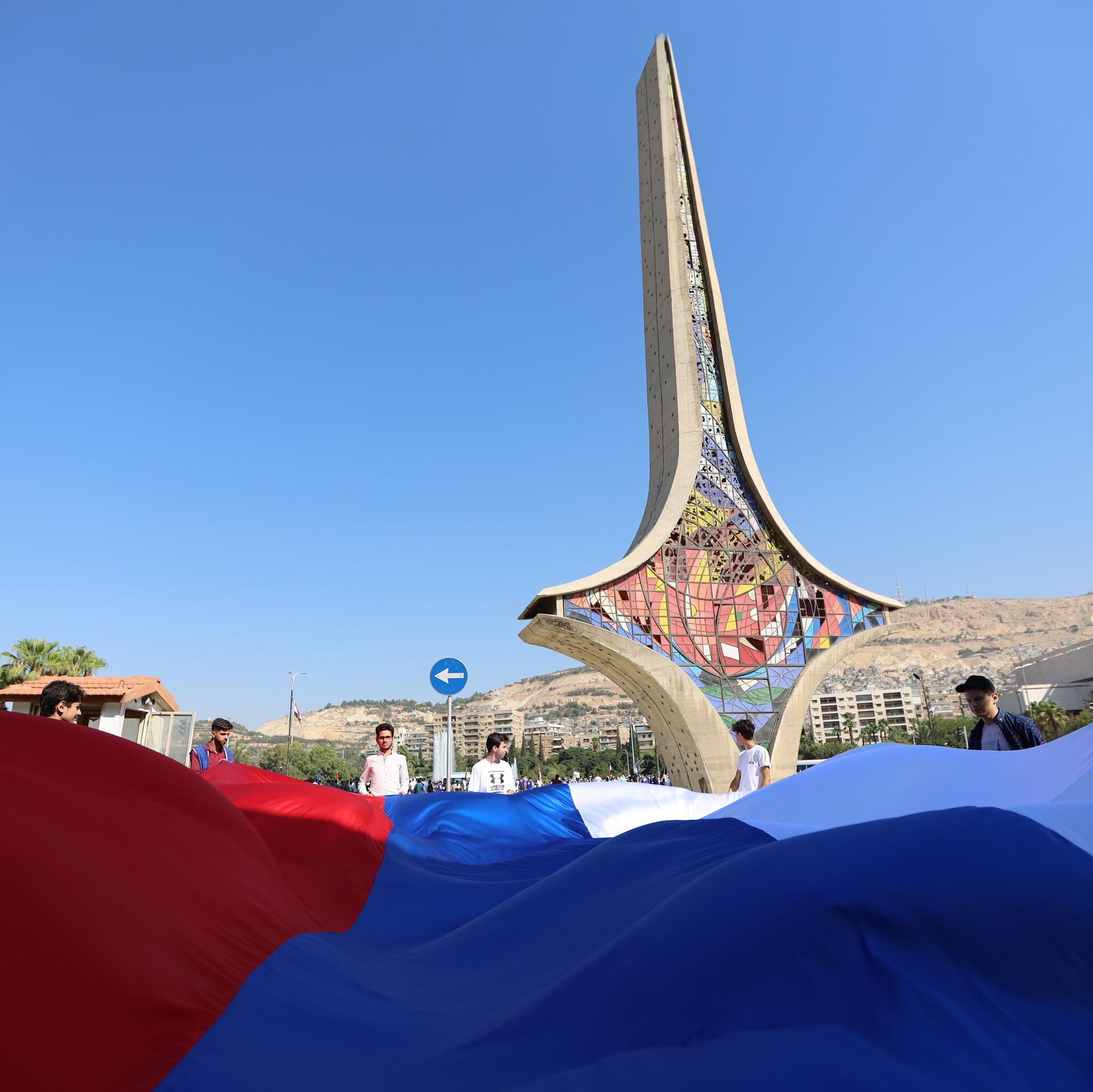 ورفع المشاركون أعلام روسيا الاتحادية يتوسطهم علم ضخم حمله العشرات من الشبان أمام نصب (السيف الدمشقي) التذكاري الذي يعد أحد الرموز بارزة الدلالة التاريخية لسوريا وبلاد الشام.