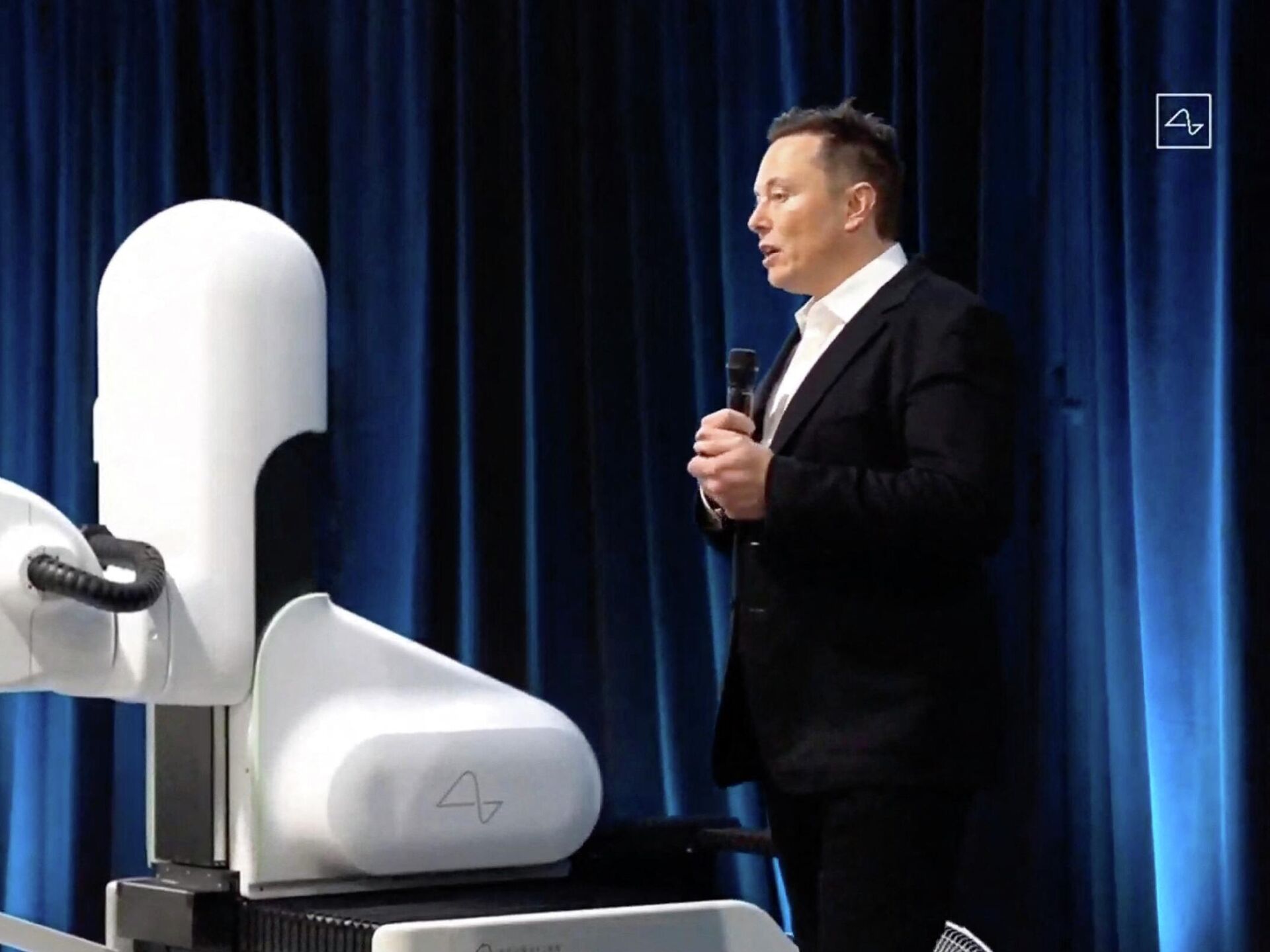 إيلون ماسك يقف بجانب روبوت جراحي أثناء عرض مباشر على الإنترنت لشركته "نيورالينك" في 28 أغسطس/ آب 2020