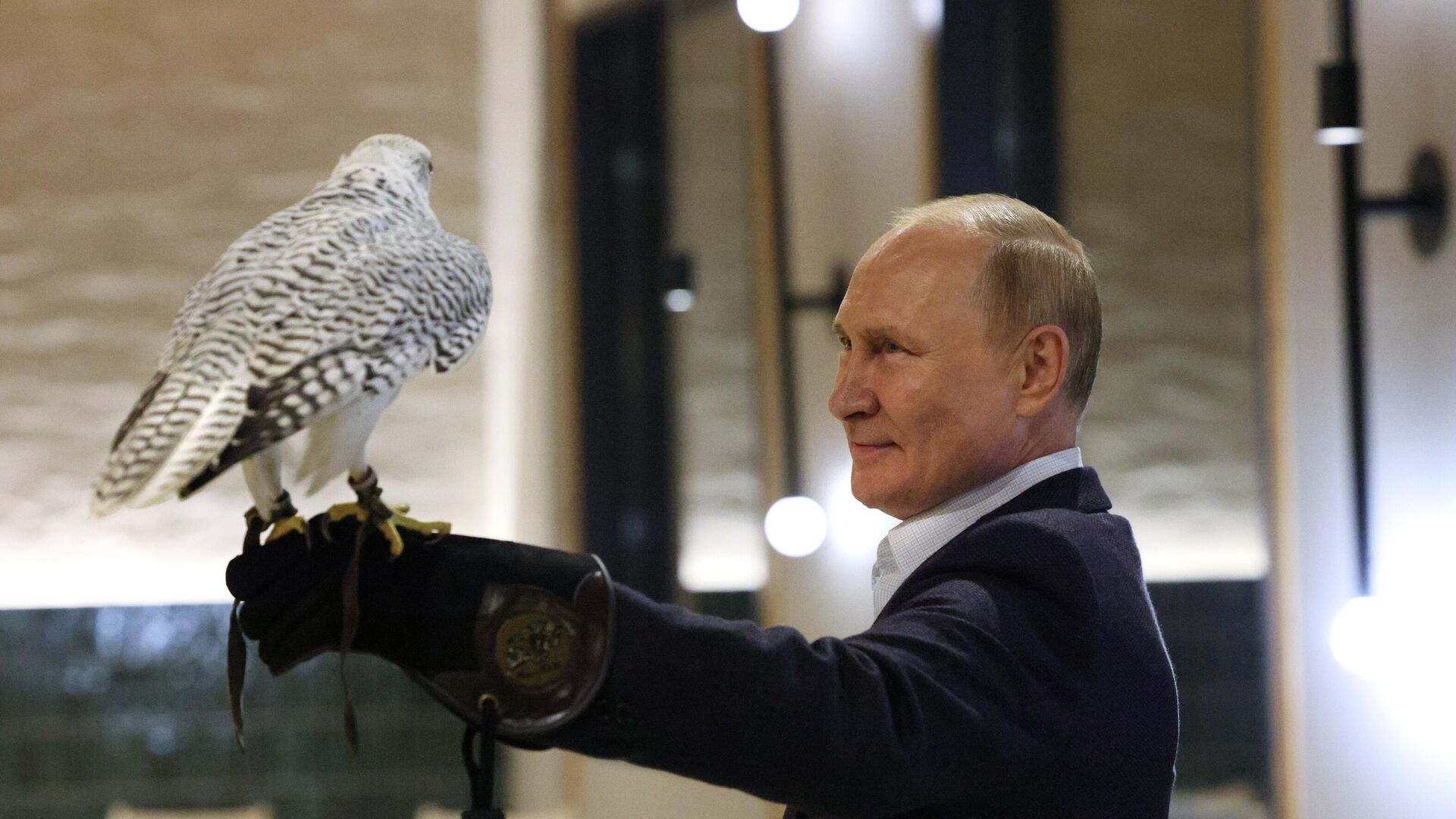 وأطلق أحد المروضين العنان لصقر ثلجي ليحط على ذراع الرئيس بوتين الذي كان يرتدي قفازا خاصا بالمدربين، والتقم الصقر بضع لقمات من قطعة اللحم التي كان يحملها بوتين.
