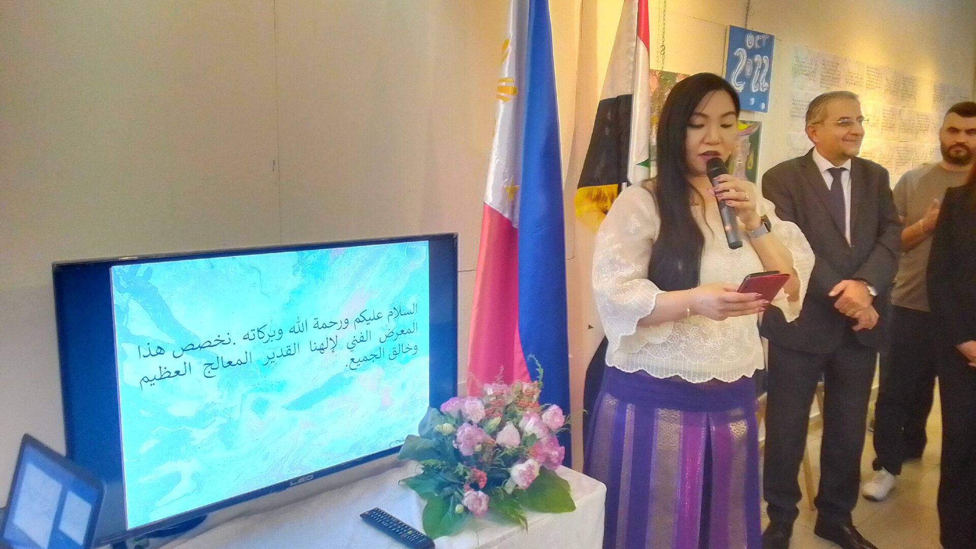 وقالت: "اخترنا موضوع (ألوان الأمل والشفاء) لأننا نعتقد أنه من خلال العلاج بالفن، يمكننا استخدام التعبير عن الألوان في تمرين للتعاطف مع الذات والشفاء الداخلي، ونشكر وزارة الخارجية والمغتربين السورية على دعم إقامة هذا المعرض الذي يقام لأول مرة في تاريخ العلاقات الدبلوماسية الفلبينية السورية في مجال الدبلوماسية الثقافية".