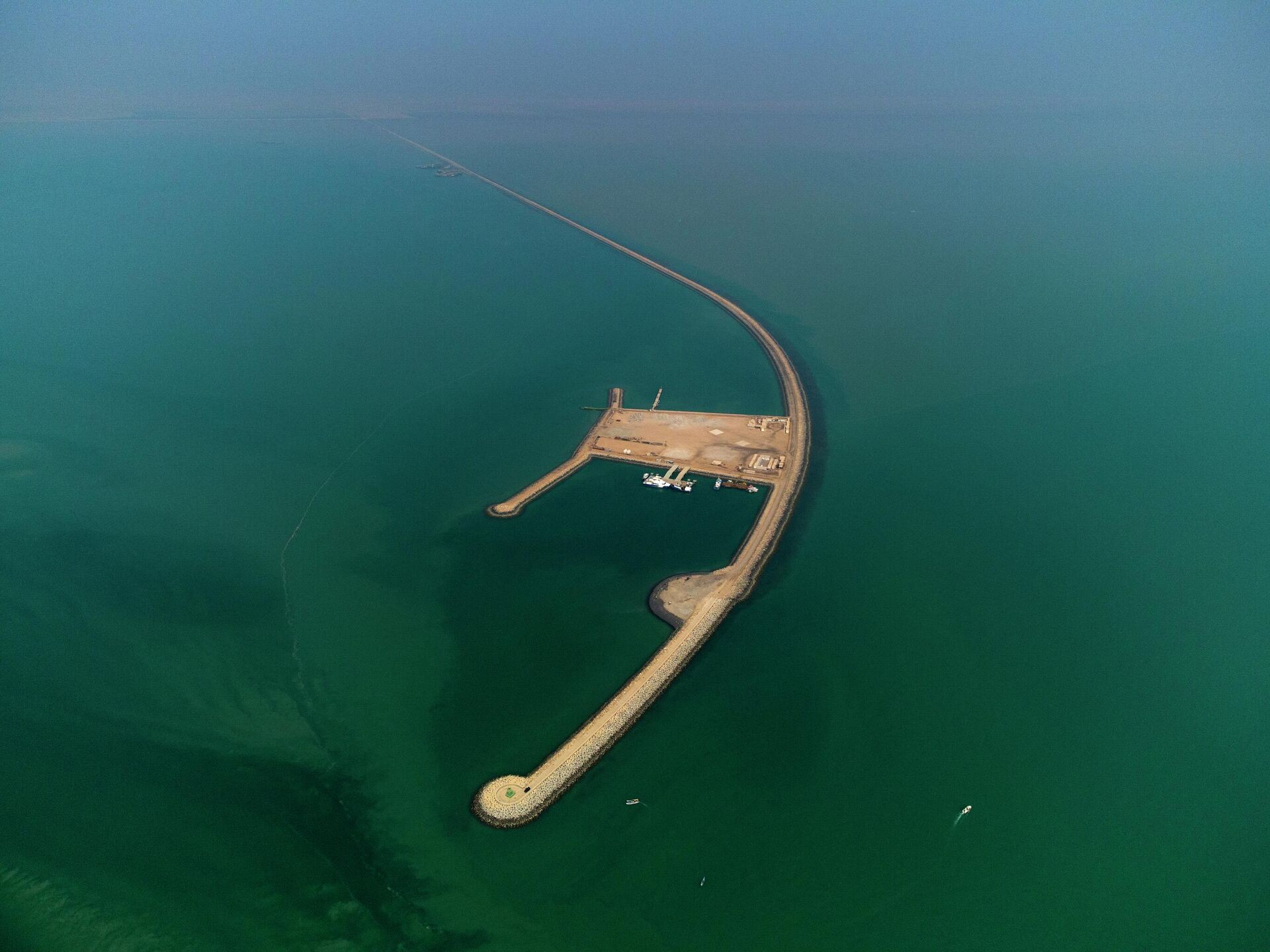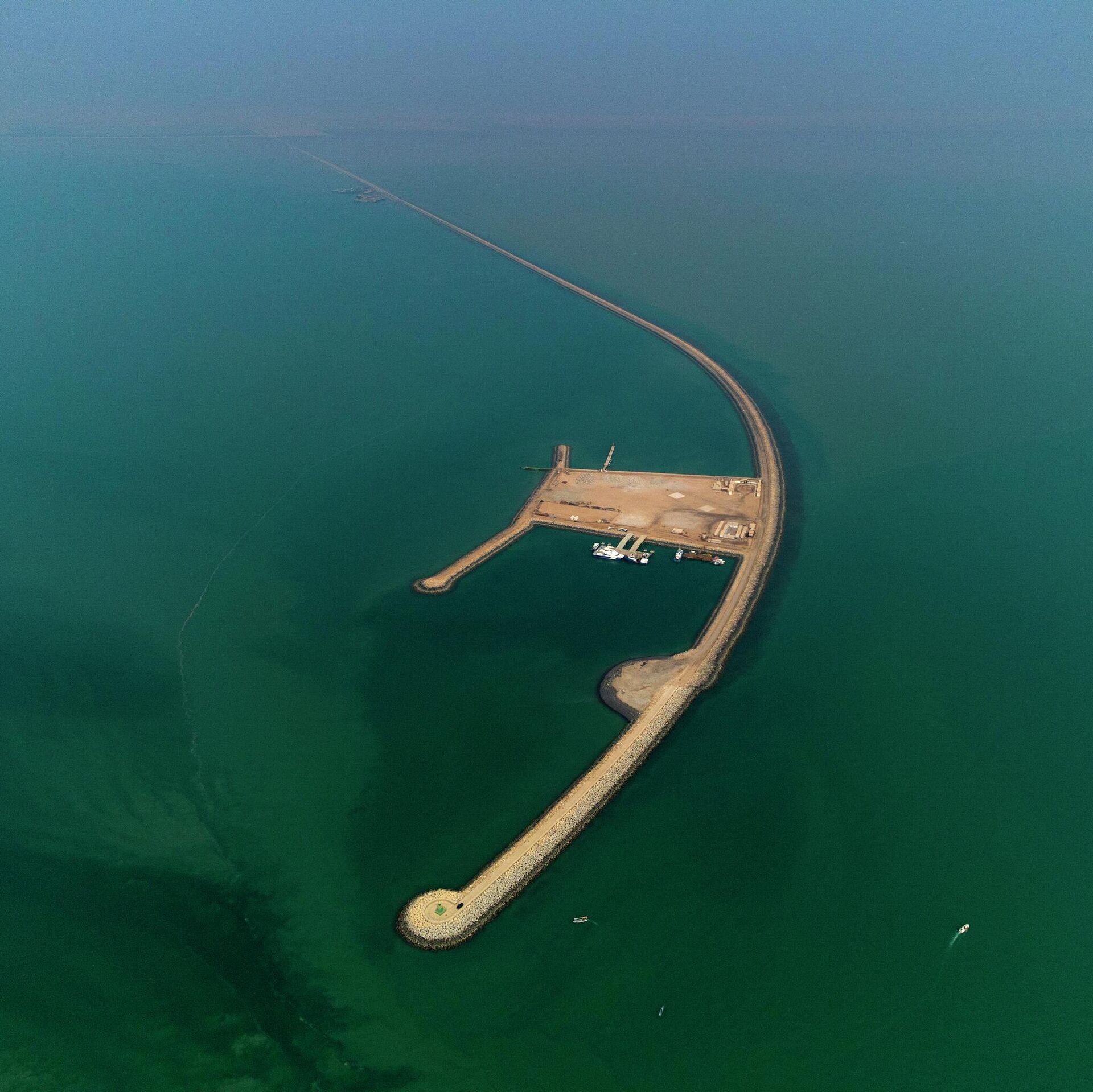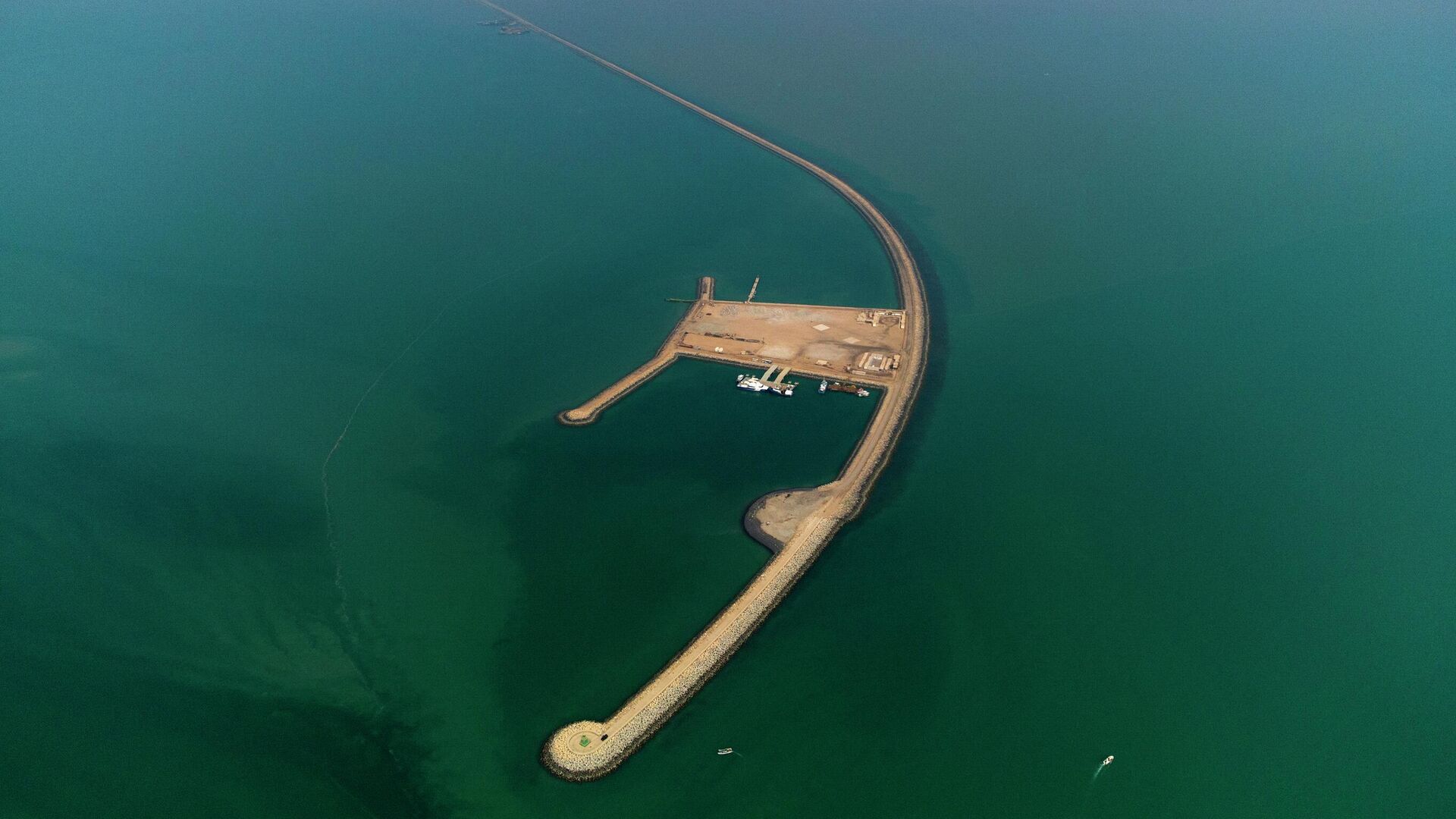 صورة جوية التقطت في 20 أكتوبر 2022، تظهر حواجز الأمواج في مشروع ميناء الفاو الكبير، قيد الإنشاء، في مدينة البصرة الجنوبية.