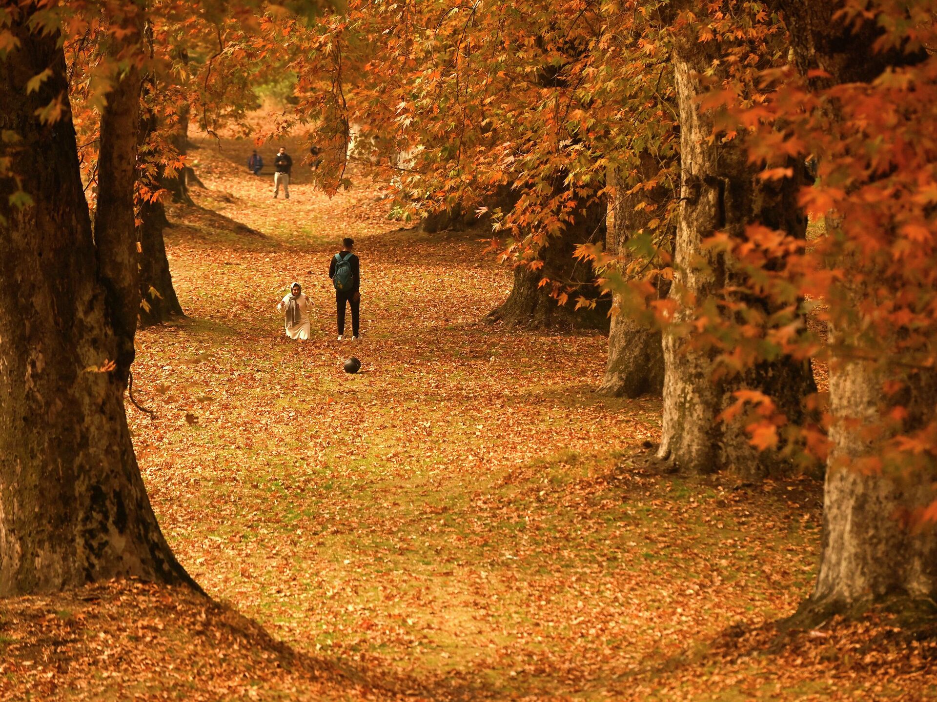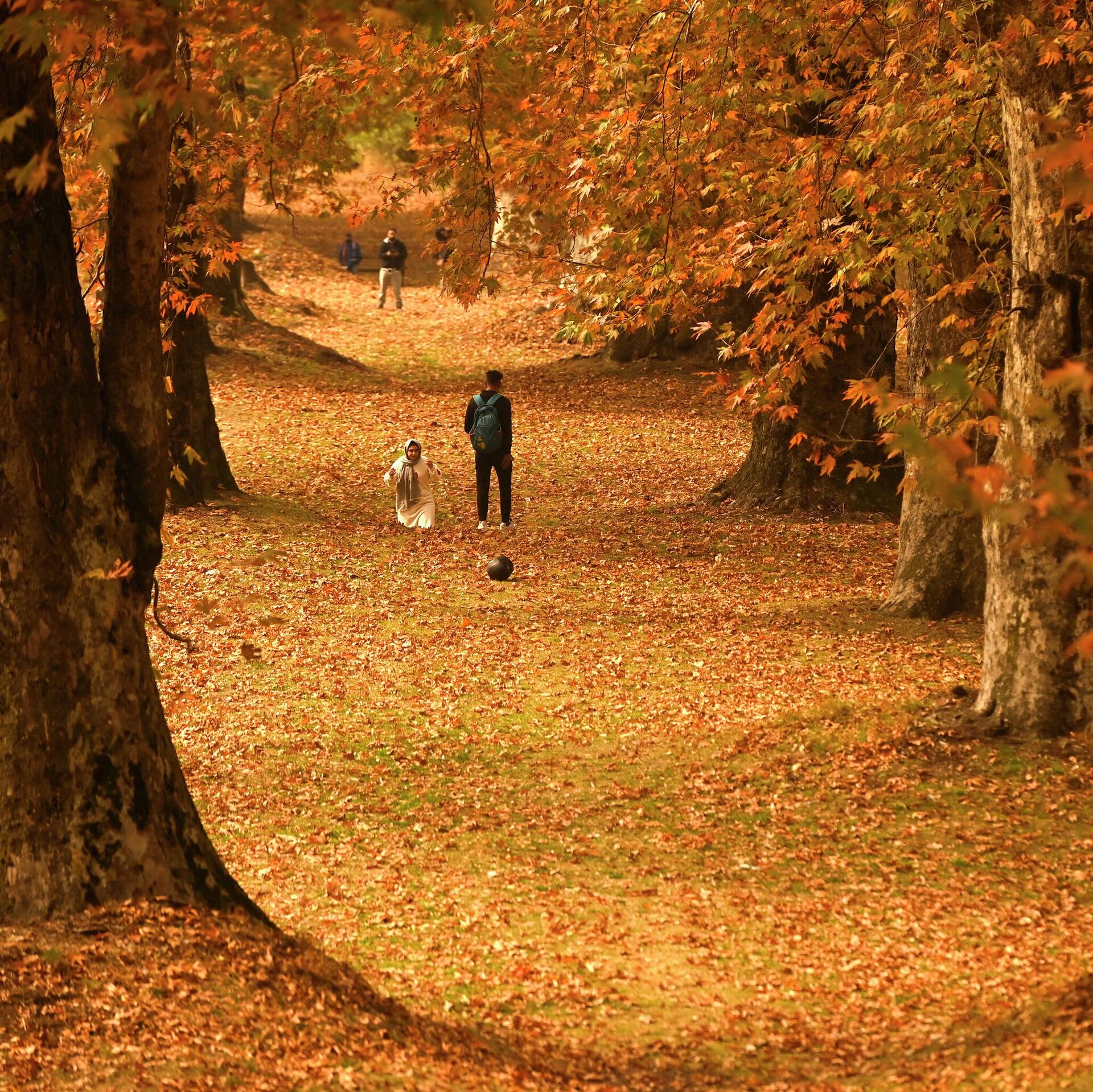 أشخاص يسيرون وسط أشجار القيقب في حديقة نيشات في سريناغار، الهند 1 نوفمبر 2022