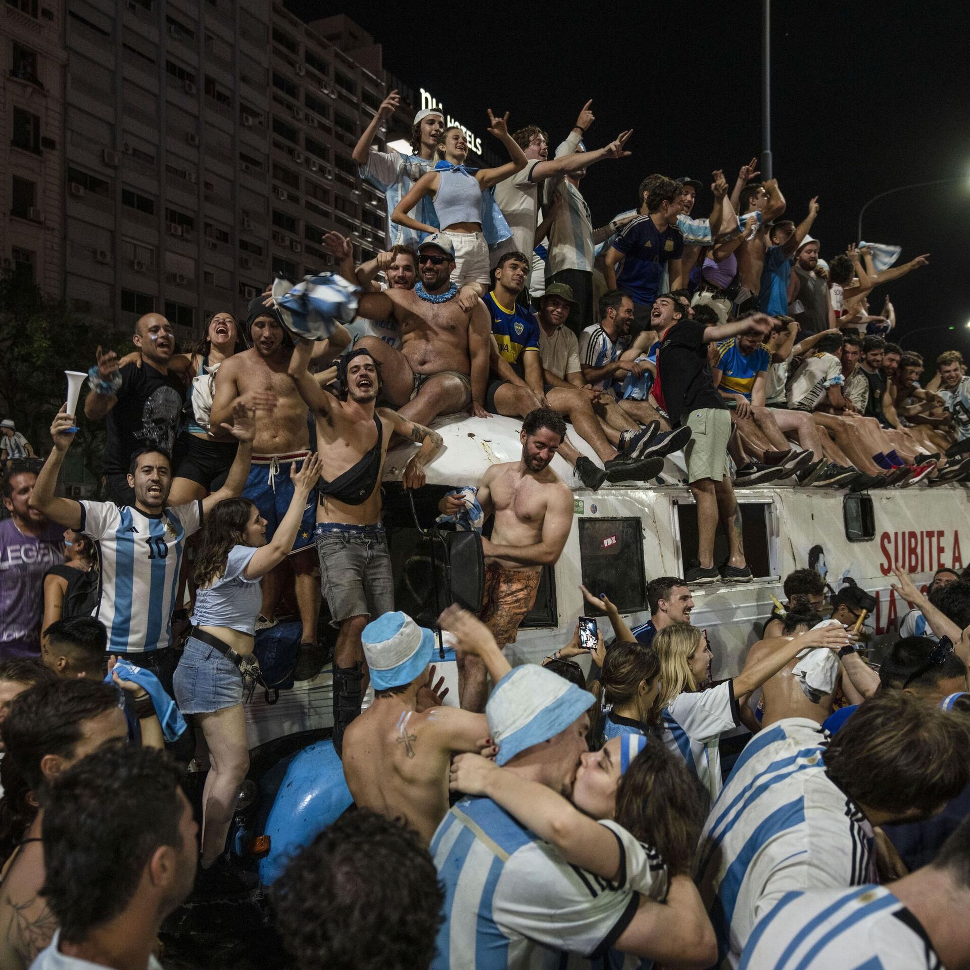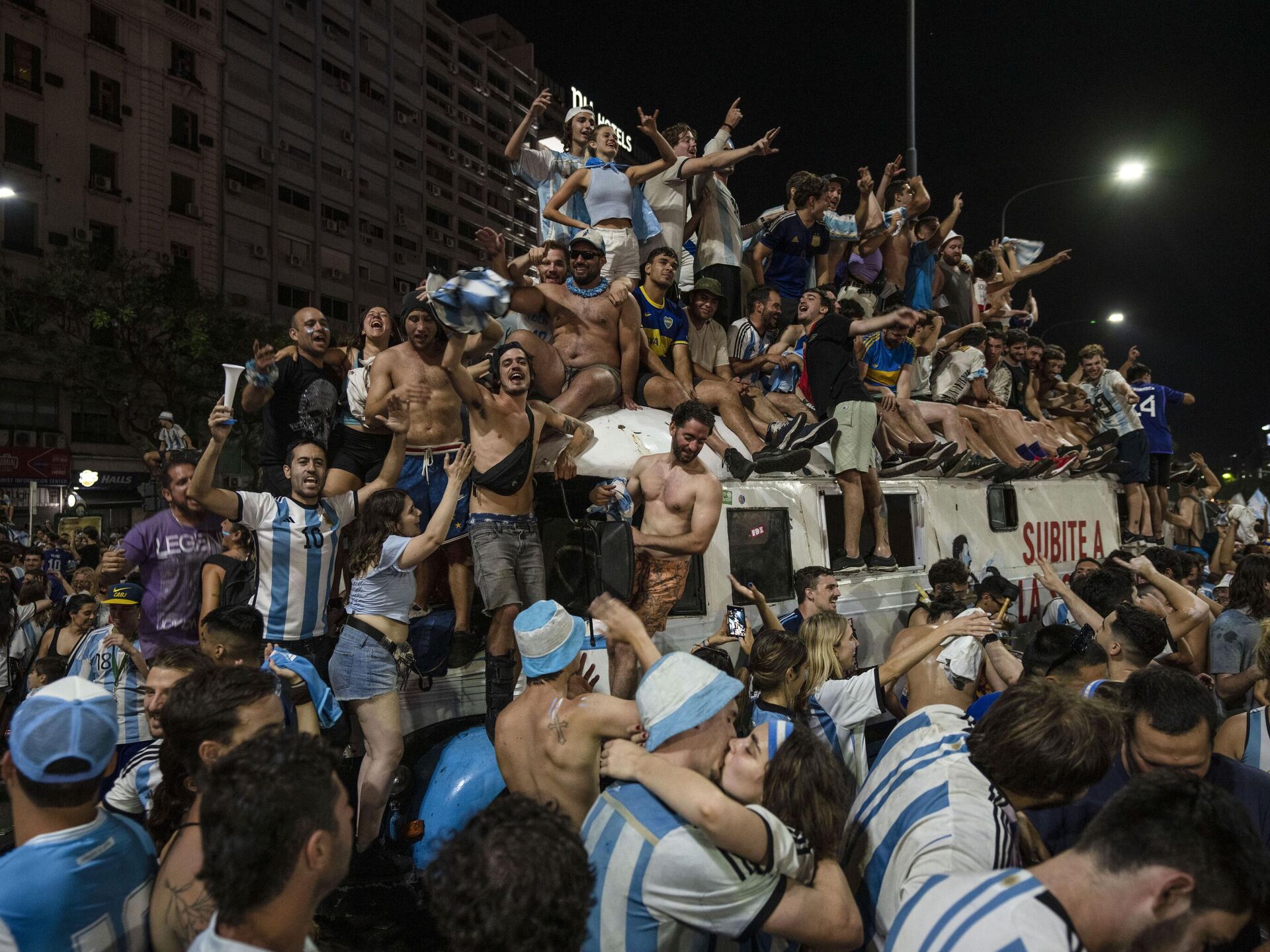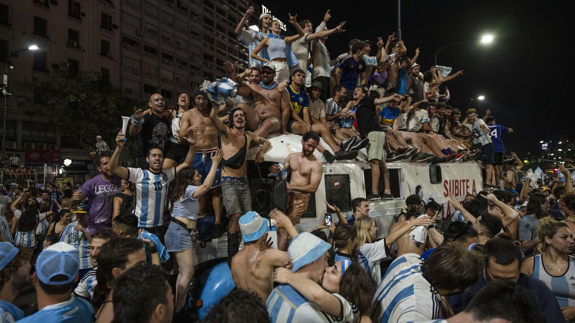 © AP Photo / Rodrigo Abdيحتفل مشجعو كرة القدم الآخرون بفوز الأرجنتين على فرنسا في المباراة النهائية لكأس العالم لكرة القدم، في بوينس آيرس، الأرجنتين، 18 ديسمبر 2022.