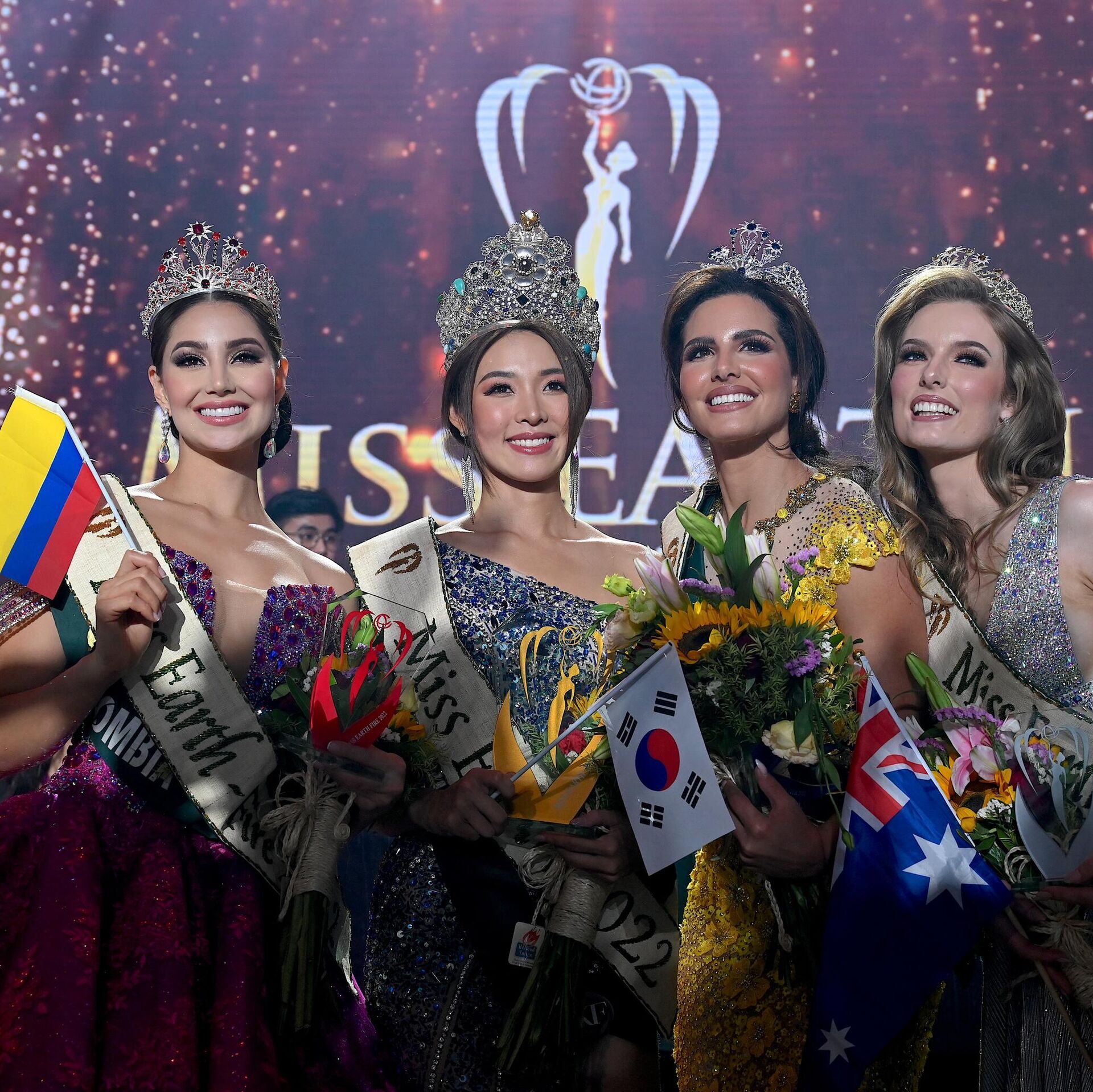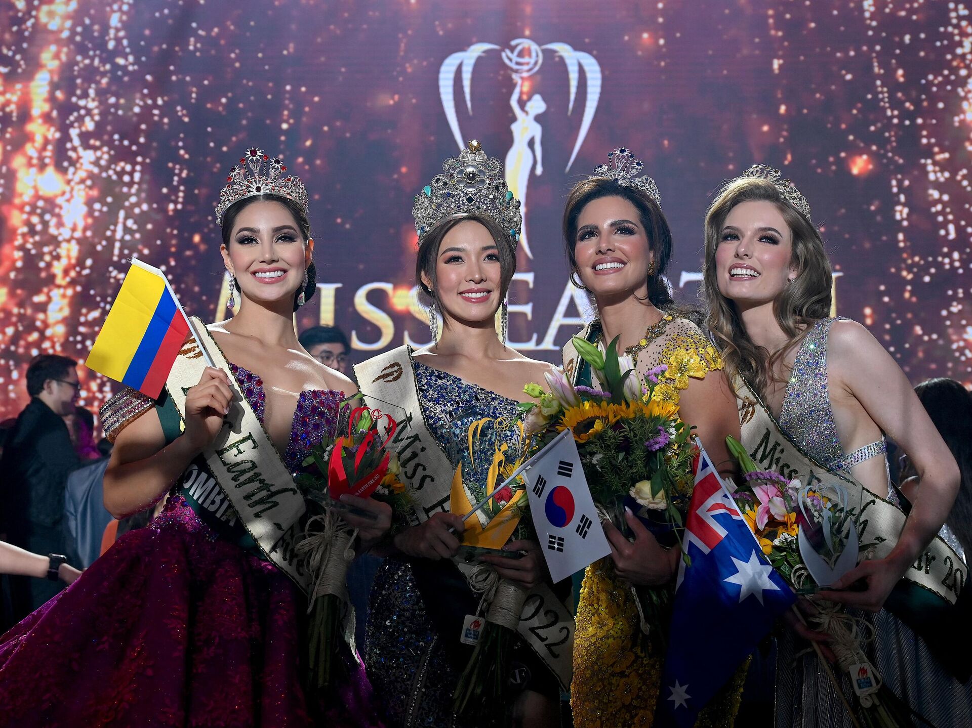 من اليسار إلى اليمين: ملكة جمال كولومبيا أندريا أغيليرا، وملكة جمال كوريا الجنوبية مينا سو تشوي، وملكة جمال فلسطين نديم أيوب، وملكة جمال أستراليا شيريدان مورتلوك، في صورة جماعية بعد ليلة التتويج خلال النسخة الـ 22 من مسابقة ملكة جمال الأرض في مانيلا، الفلبين 29 نوفمبر 2022.