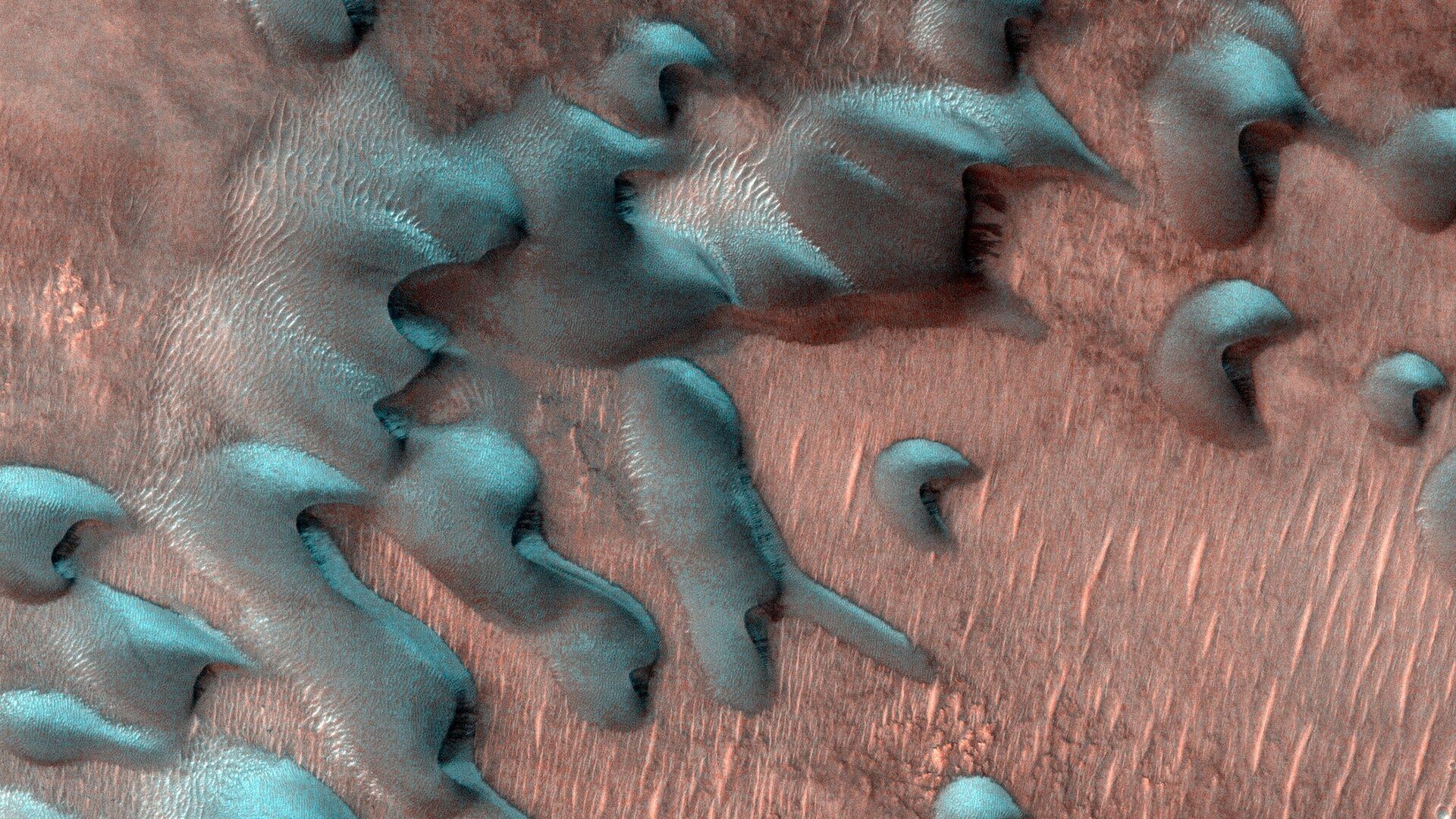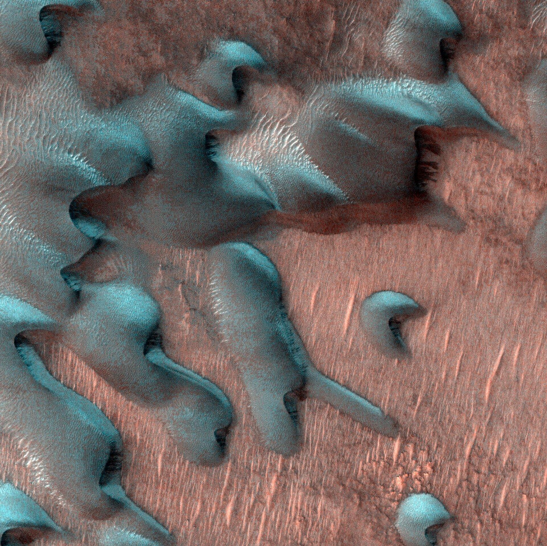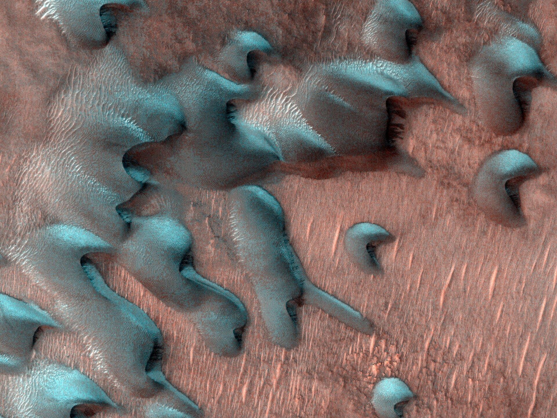 هذا المشهد من أوائل الربيع في النصف الشمالي من كوكب المريخ. هذه الكثبان مغطاة بطبقة من جليد ثاني أكسيد الكربون الموسمي (الجليد الجاف). تظهر شقوق مزرقة في الجليد عبر الجزء العلوي من بعض الكثبان الرملية.