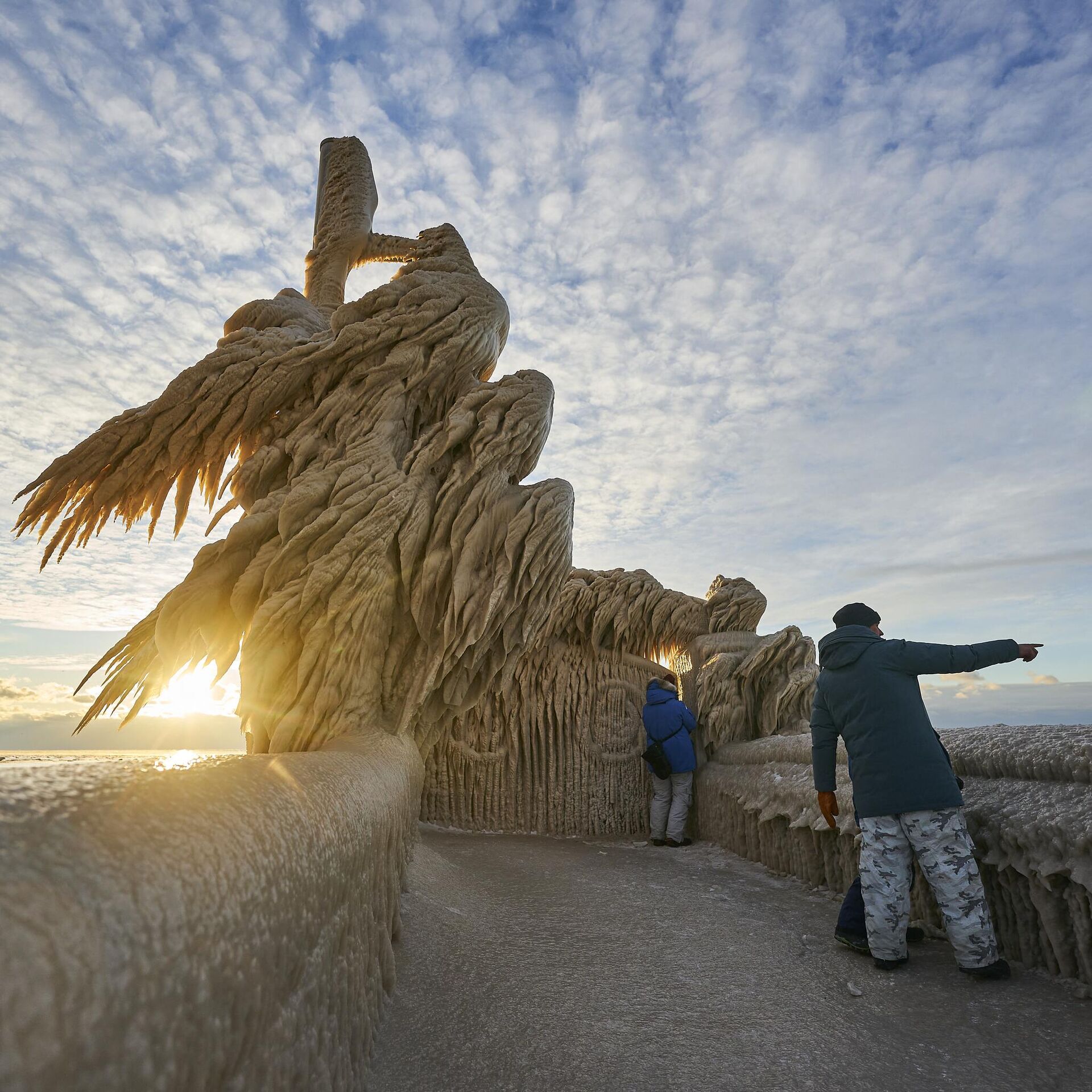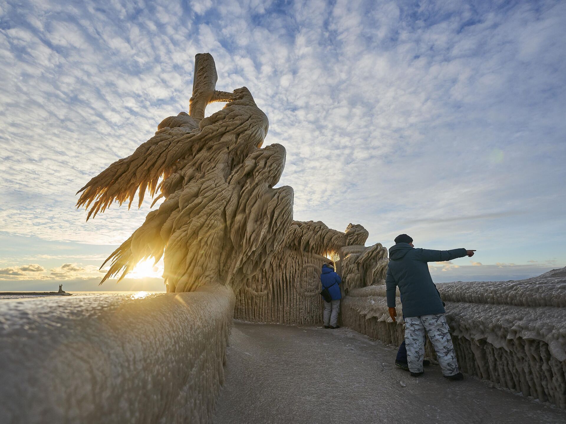 يستكشف الناس الرصيف المغطى بالجليد في بورت ستانلي، أونتاريو، كندا، في 27 ديسمبر 2022. تكونت الأشكال الجليدية هذه بسبب عاصفة شتوية كبيرة ضربت المنطقة في عطلة نهاية أسبوع عيد الميلاد.