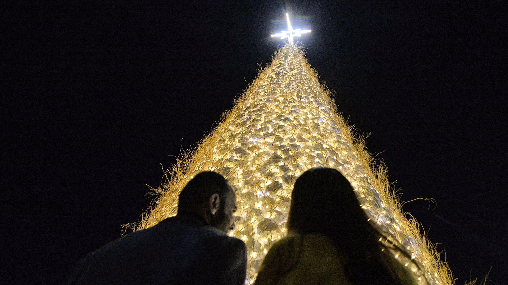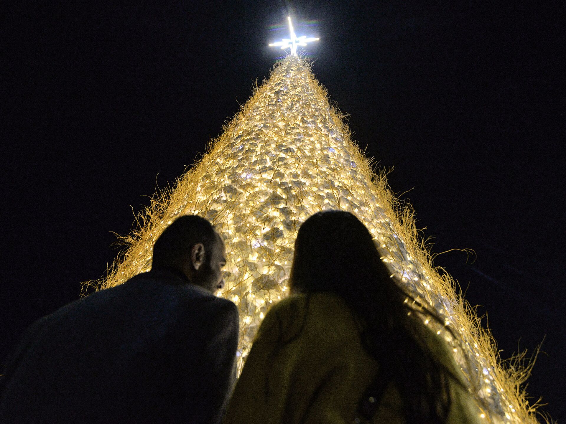 © AFP 2023 / Zaid Al-Obeidi الناس يتجمعون بالقرب من شجرة عيد الميلاد العملاقة المجوفة التي أقيمت في بلدة قرقوش ذات الأغلبية المسيحية (بغديدة)، في محافظة نينوى، على بعد حوالي 30 كيلومترًا من الموصل، العراق 7 ديسمبر 2021.