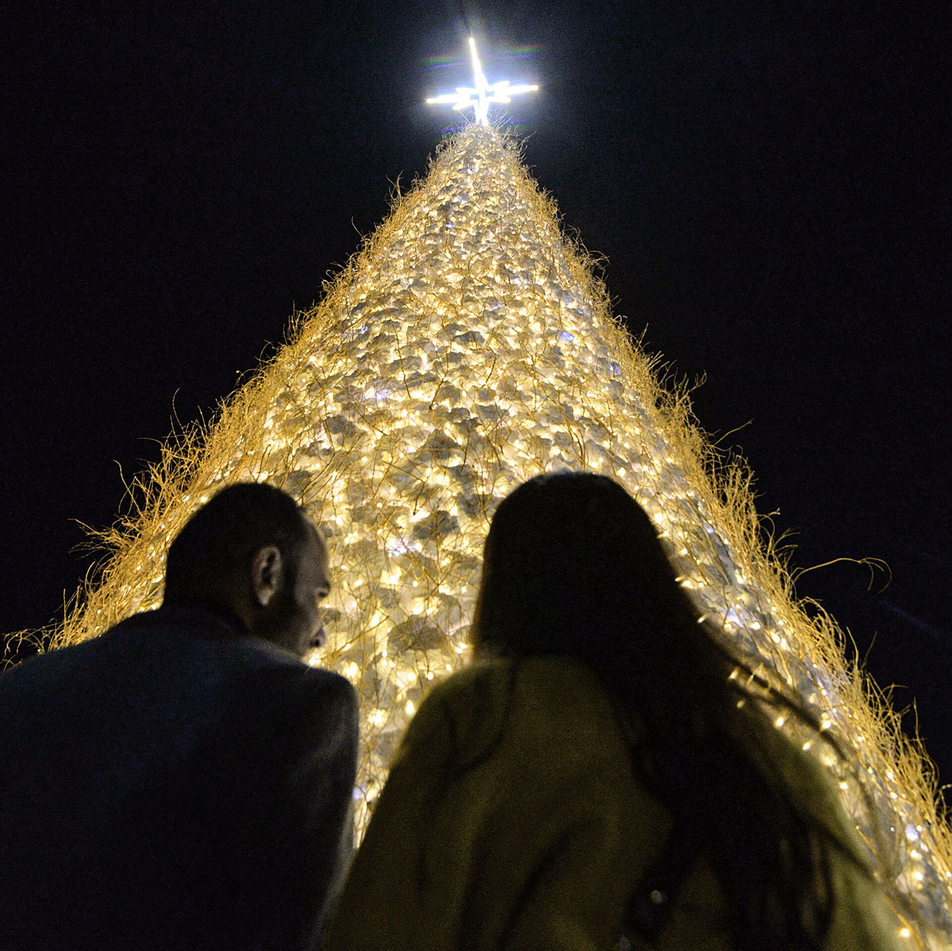 الناس يتجمعون بالقرب من شجرة عيد الميلاد العملاقة المجوفة التي أقيمت في بلدة قرقوش ذات الأغلبية المسيحية (بغديدة)، في محافظة نينوى، على بعد حوالي 30 كيلومترًا من الموصل، العراق 7 ديسمبر 2021. - سبوتنيك عربي, 1920, 07.01.2023