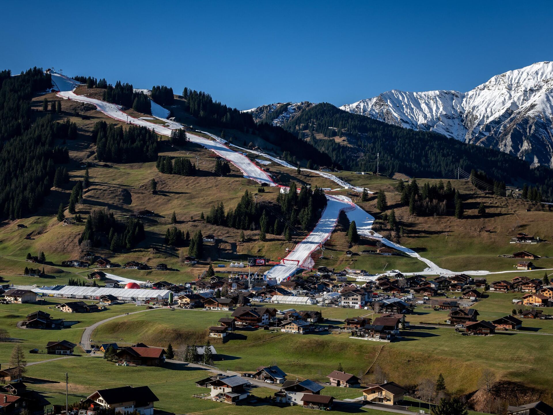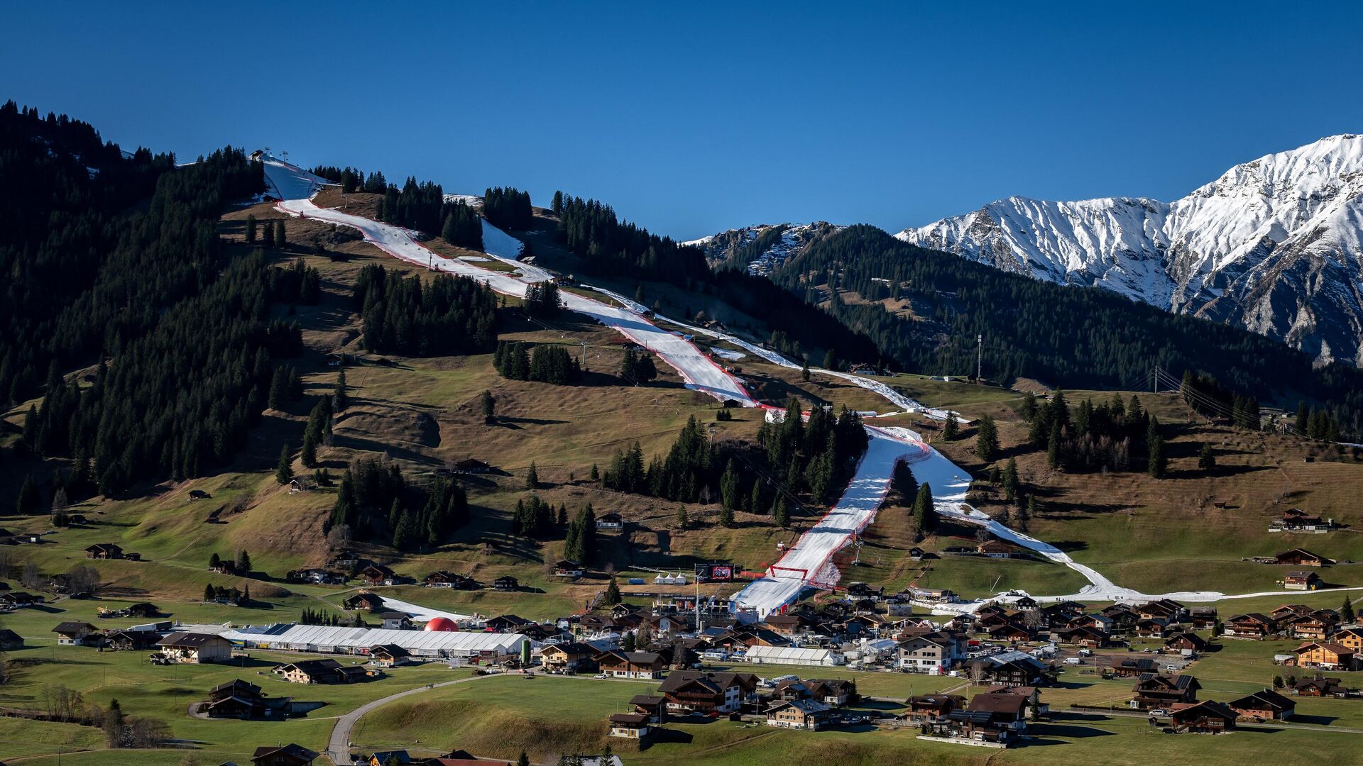 تُظهر هذه الصورة التي التقطت في 6 يناير 2023 منحدر "تشوينسبيرغلي" (Chuenisbargli) وسط المناظر الطبيعية الخالية من الثلوج عشية أحداث كأس العالم للتزلج على جبال الألب في منتجع جبال الألب السويسري ادلبودن. بسبب قلة الثلوج، تم إغلاق العديد من منتجعات التزلج على ارتفاع متوسط في سويسرا.