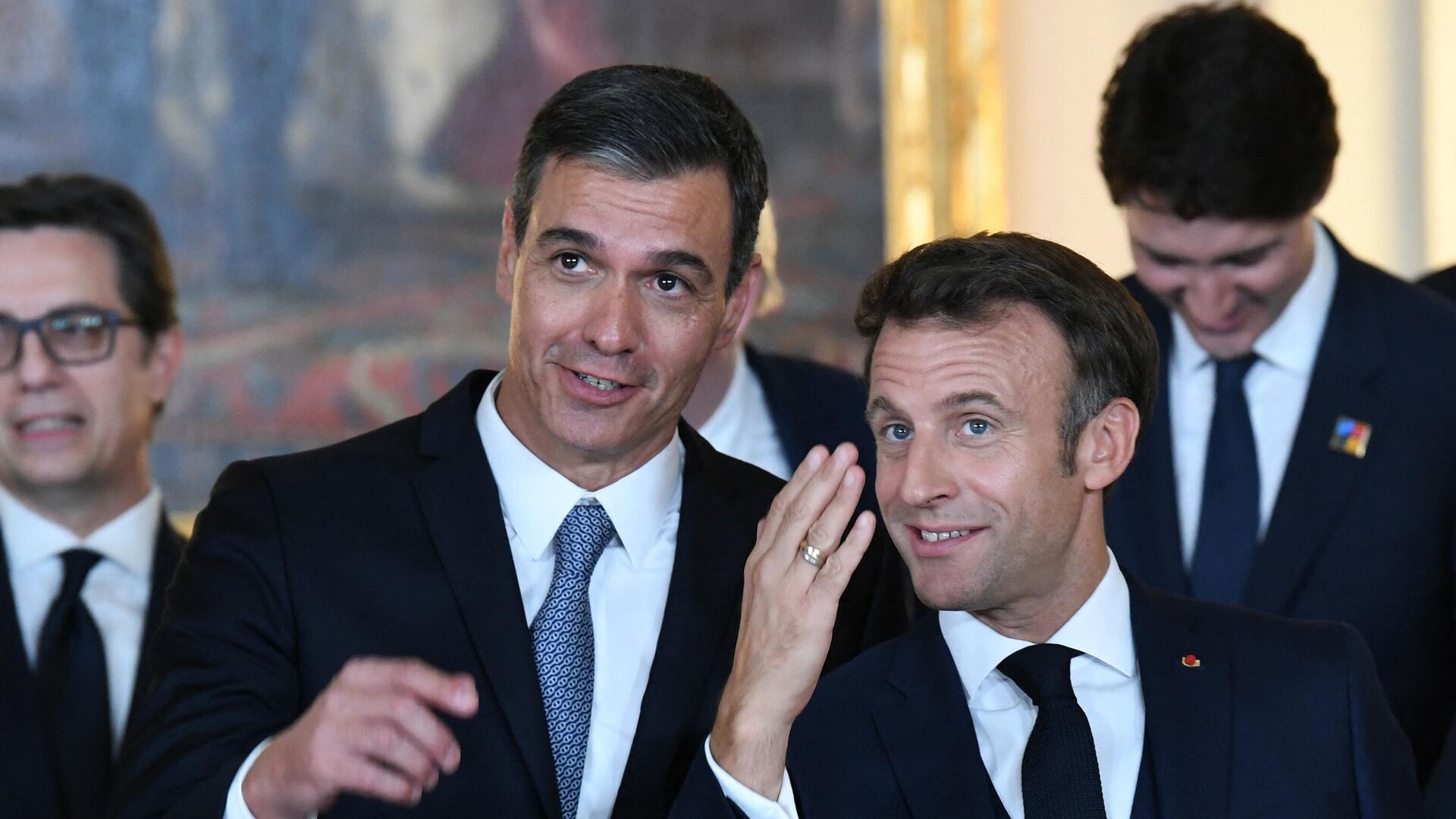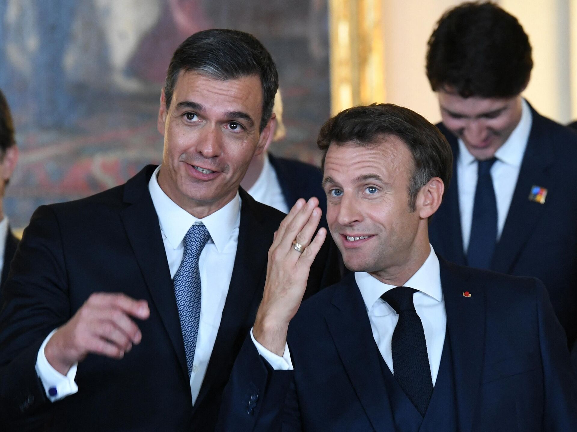 © AFP 2023 / Bertrand Guayرئيس وزراء إسبانيا بيدرو سانتشيس ورئيس فرنسا إيمانويل ماكرون يتحدثان قبيل العشاء في القصر الملكي في مدريد، في إطار اجتماع دول أعضاء الناتو في مدريد، إسبانيا 28 يونيو 2022