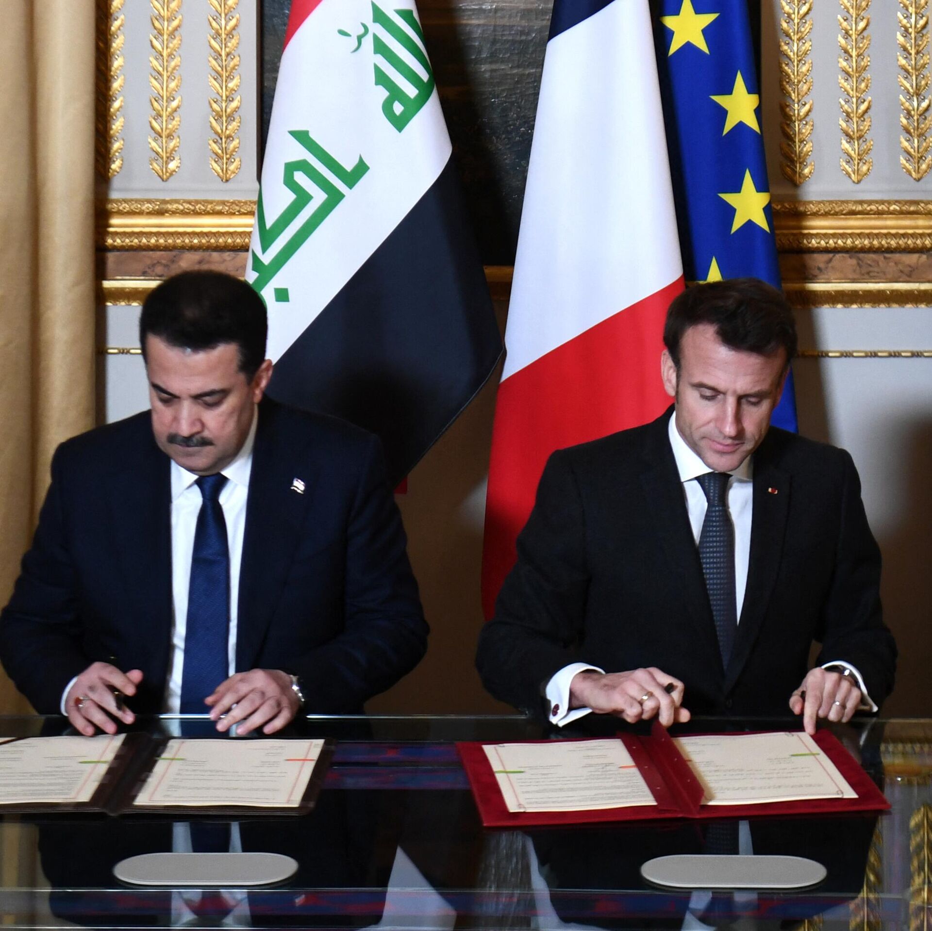 وقع رئيس الوزراء العراقي محمد شياع السوداني مع الرئيس الفرنسي إيمانويل ماكرون اتفاقية شراكة استراتيجية. 27.01.2023, سبوتنيك عربي