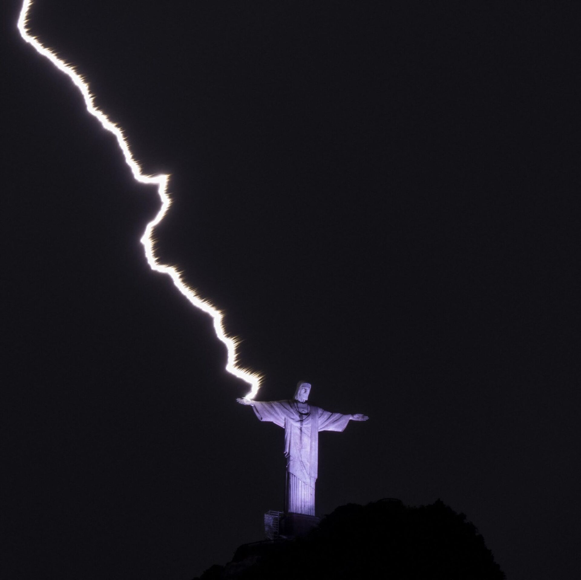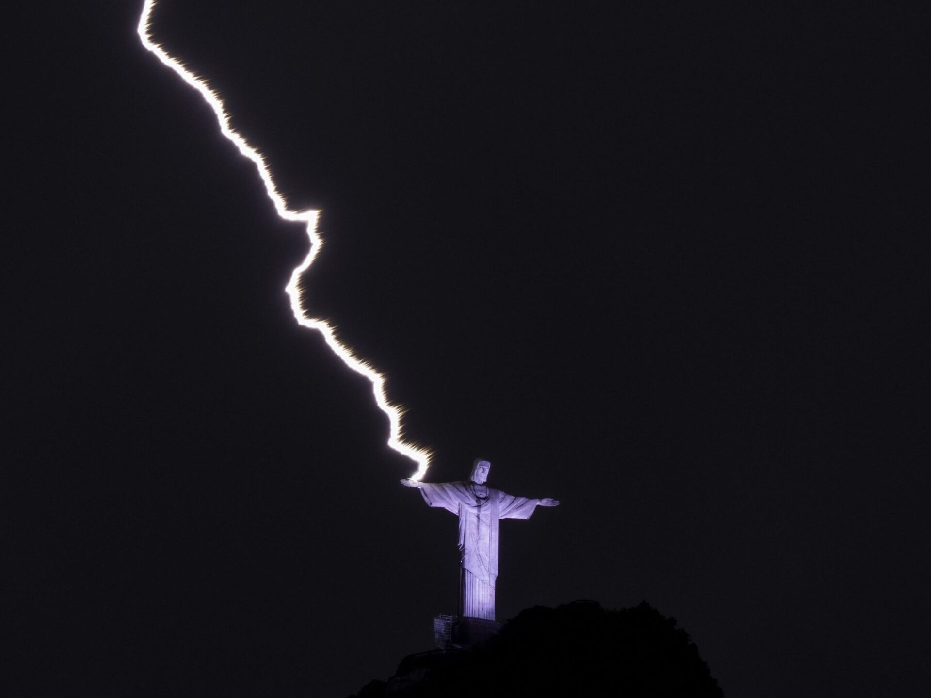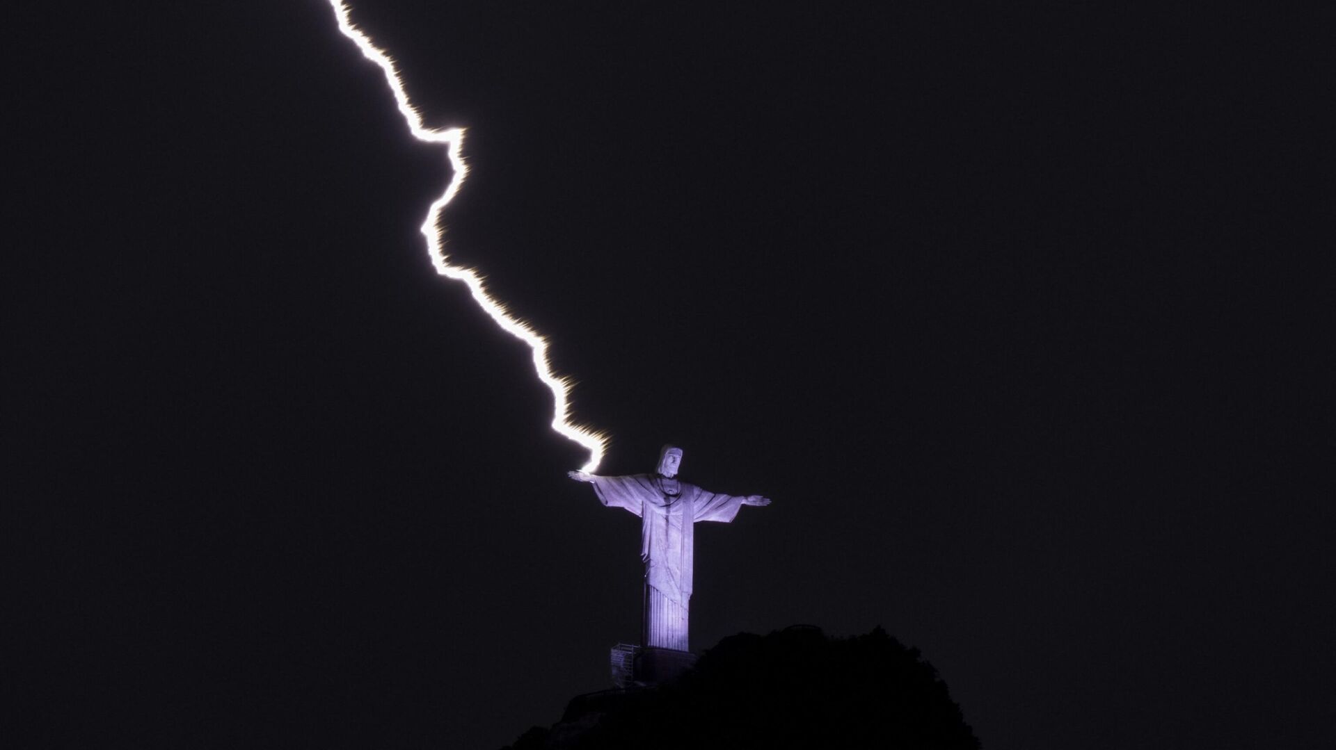 صاعقة تضرب يد تمثال المسيح الفادي في جبل كوركوفادو في ريو دي جانيرو، البرازيل، 21 فبراير 2023.
