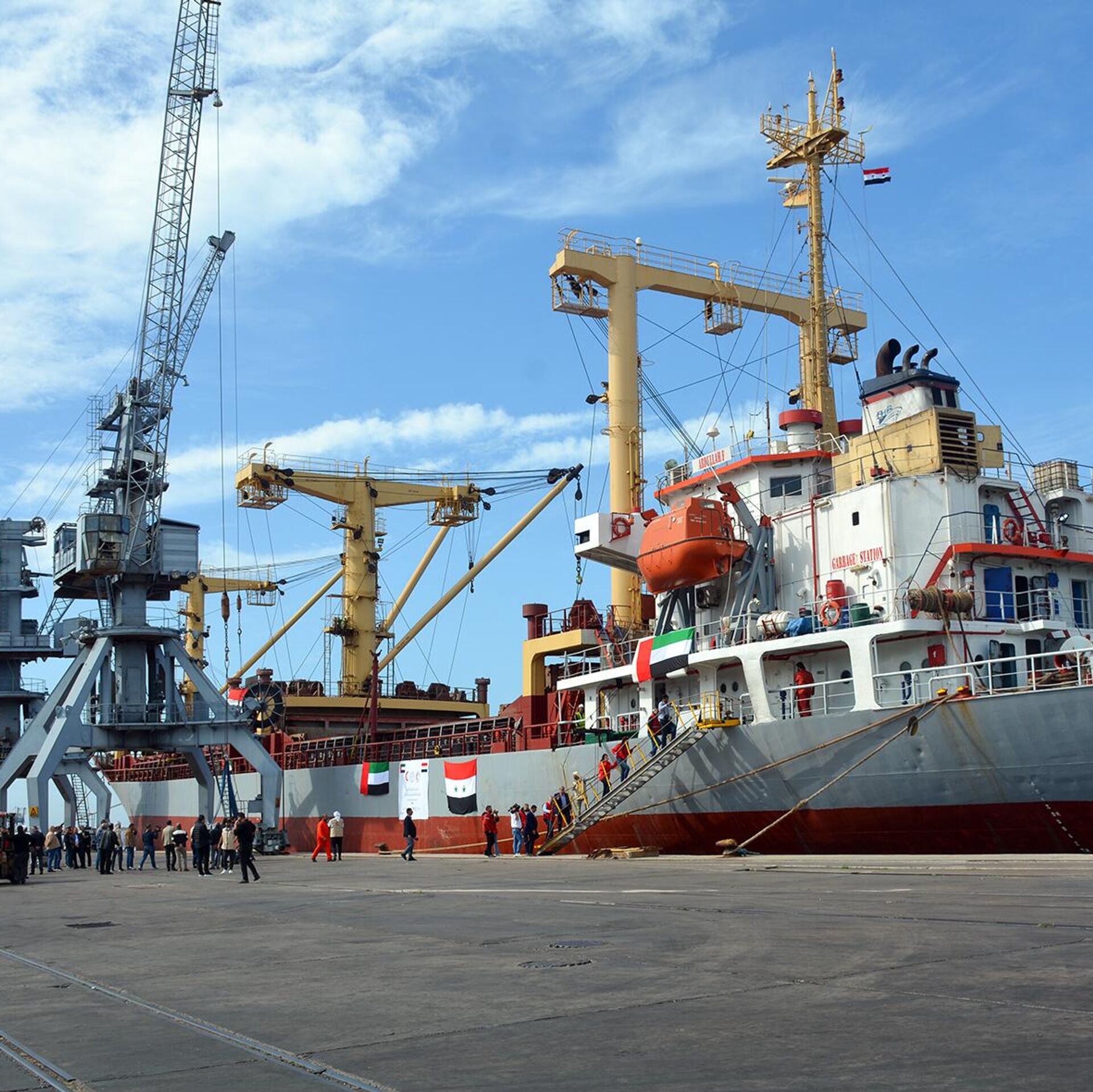 "وصلت السفينة صباح اليوم، إلى ميناء اللاذقية استمراراً للجهود الإنسانية الإماراتية في دعم المتضررين جراء الزلزال"، مبيناً أنه سيتم توزيع المواد الاغاثية والإنسانية البالغة 1000 طن على المتضررين من الزلزال، وذلك بالتنسيق مع الهلال الأحمر العربي السوري.