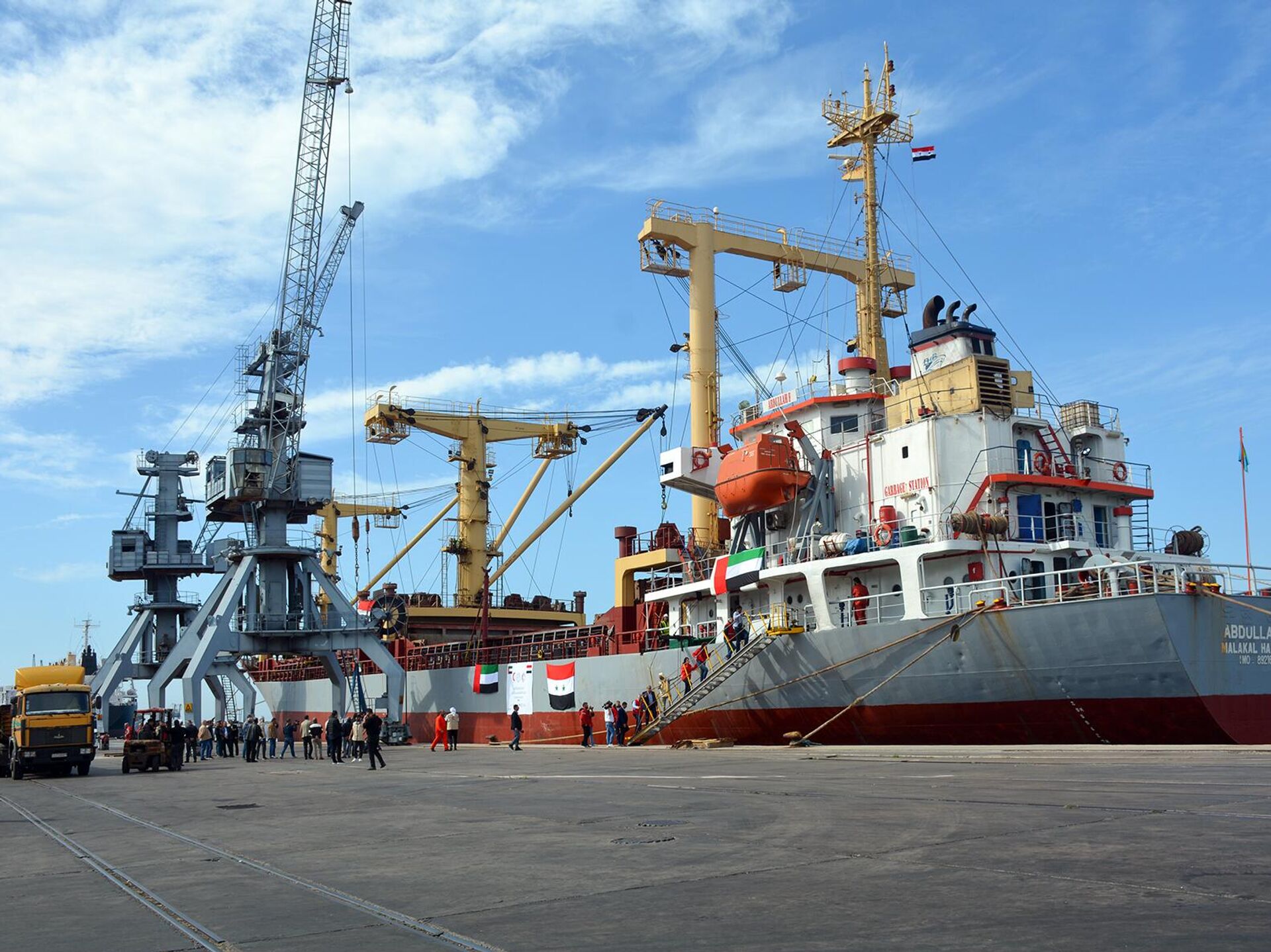 رست أول سفينة مساعدات إماراتية، صباح اليوم، بميناء اللاذقية، محملّة بـ 1000 طن من المواد الإغاثية والطبية والغذائية والمستلزمات الضرورية، مقدّمة من الهلال الأحمر الإماراتي، في الوقت الذي تستعد سفينة أخرى للتوجه إلى سوريا.