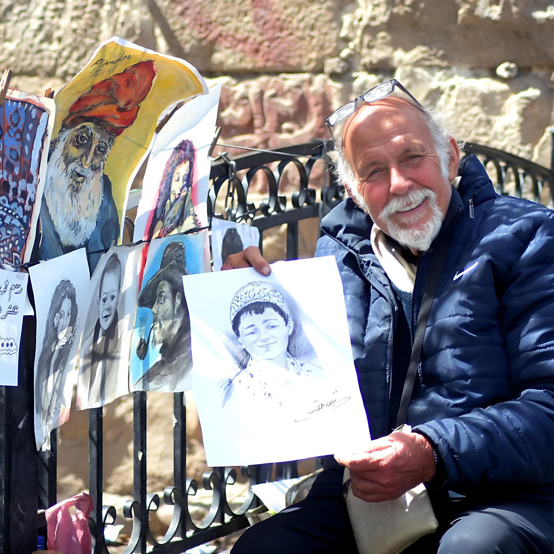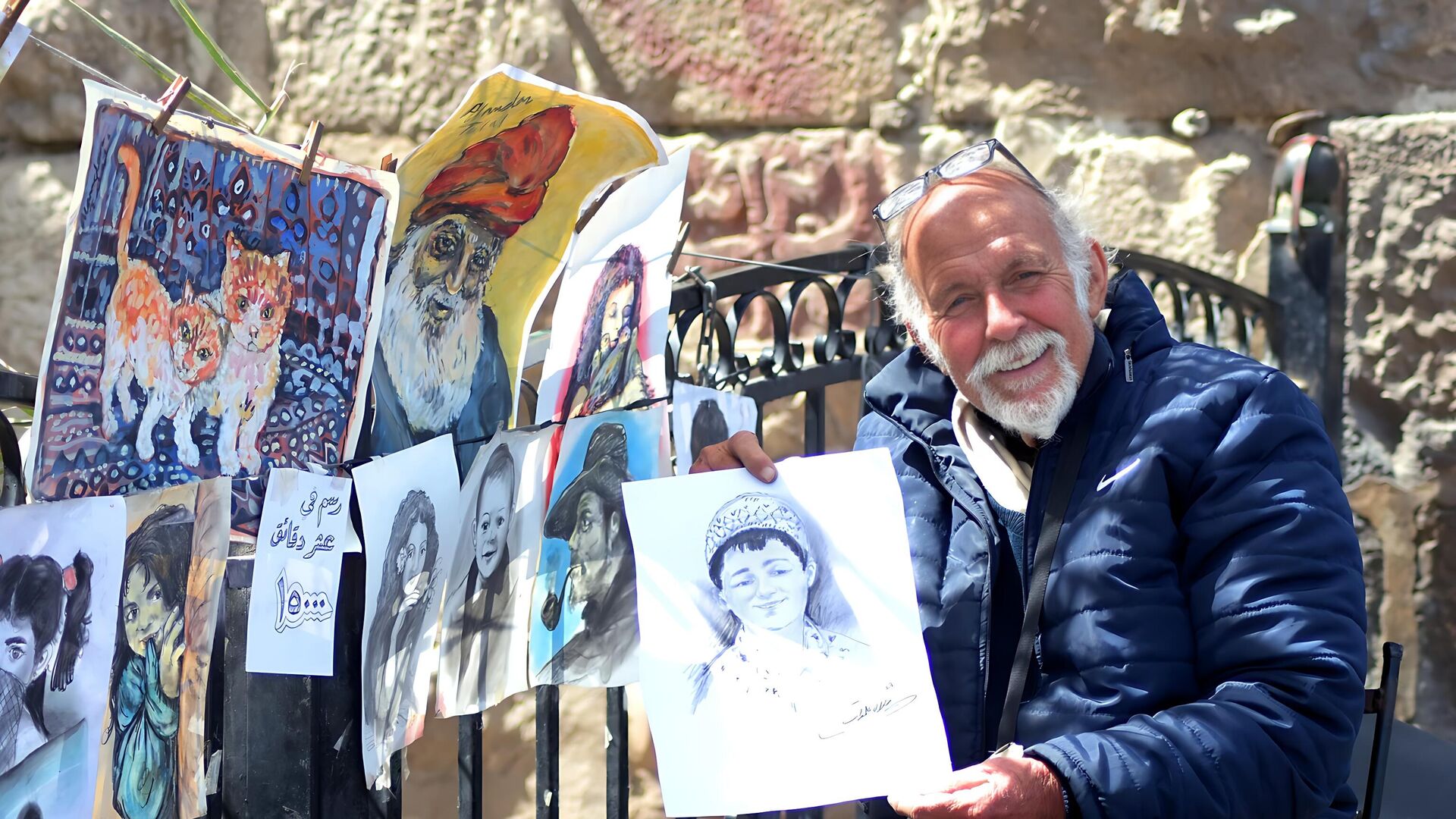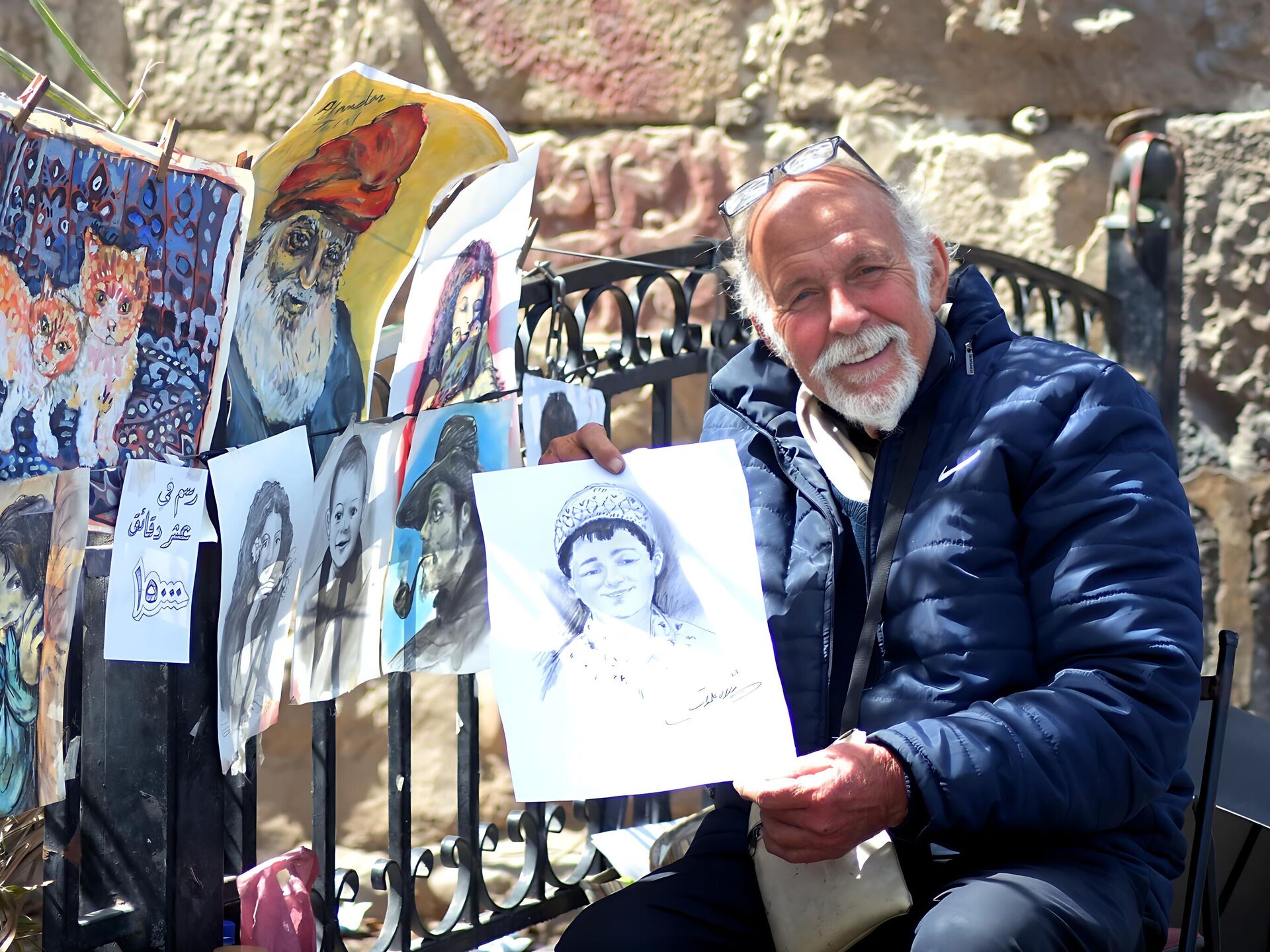 واحد وثلاثون عاماً، ولايزال "أبو جميل"، ملاصقا لجدار قلعة دمشق، يلفت أنظار المارة بسحر أنامله التي ترسم الوجوه الفورية بدقائق معدودة، وبحرفية فنية عالية.