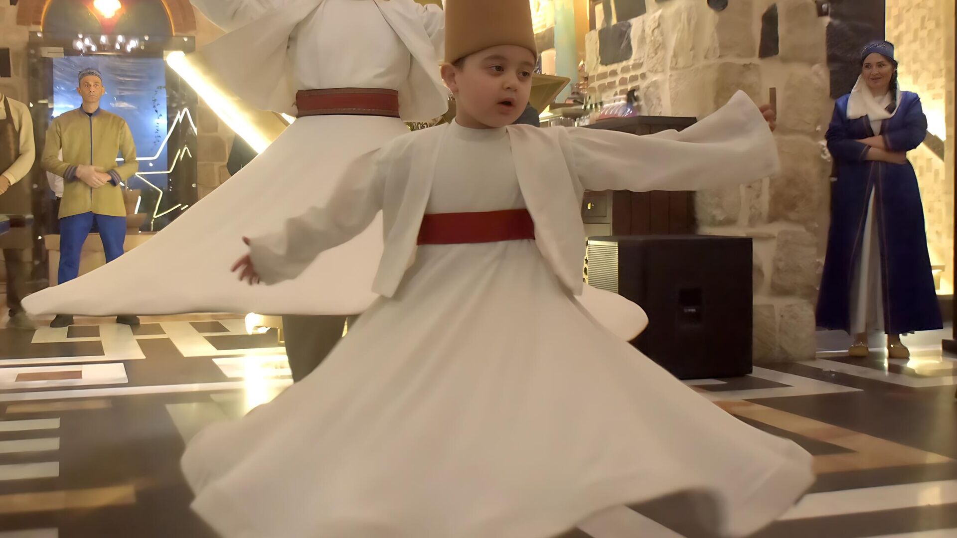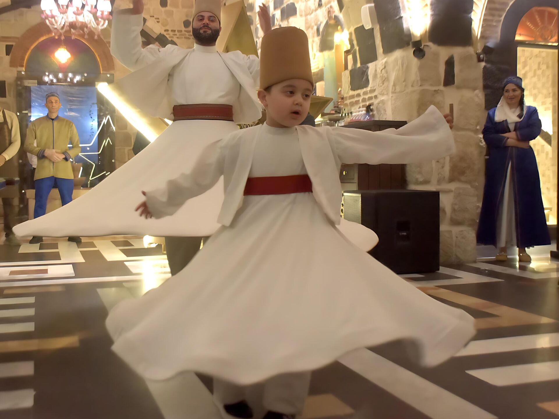 يلفت أنس، ذو السنوات الست، رفقة والده (المولوي) مؤيد الخراط، الحاضرين وهو يدور بسرعة حول نفسه محافظًا على توازنه وهو يؤدي رقصة السماح "المولوية الصوفية"، المتوارثة منذ قرون.