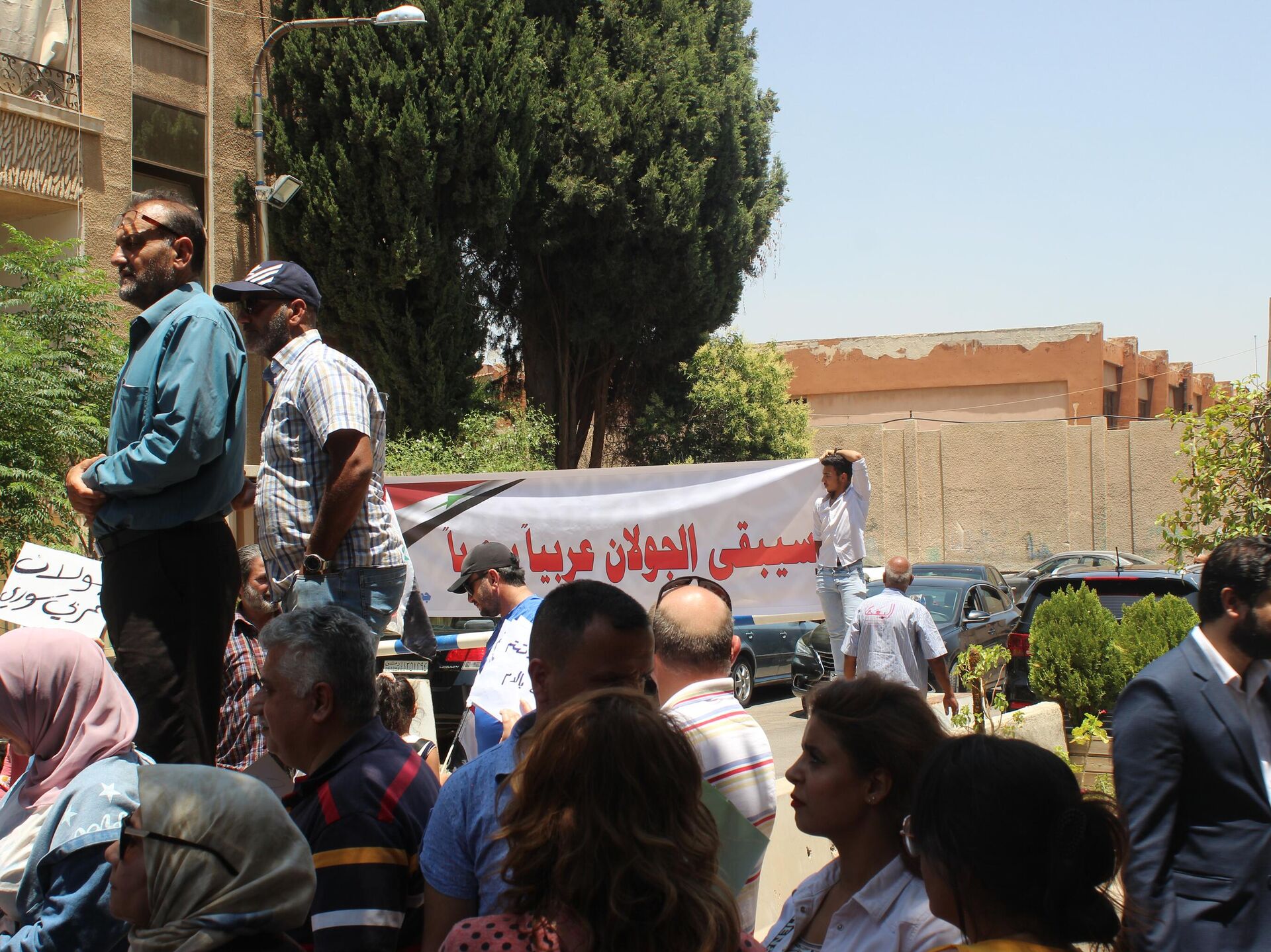 كما نفذ أهالي درعا وقفة احتجاجية متزامنة رفضا للممارسات الإسرائيلية ومحاولاته السطو على أراضي الجولانيين عبر "مسرحية المراوح".