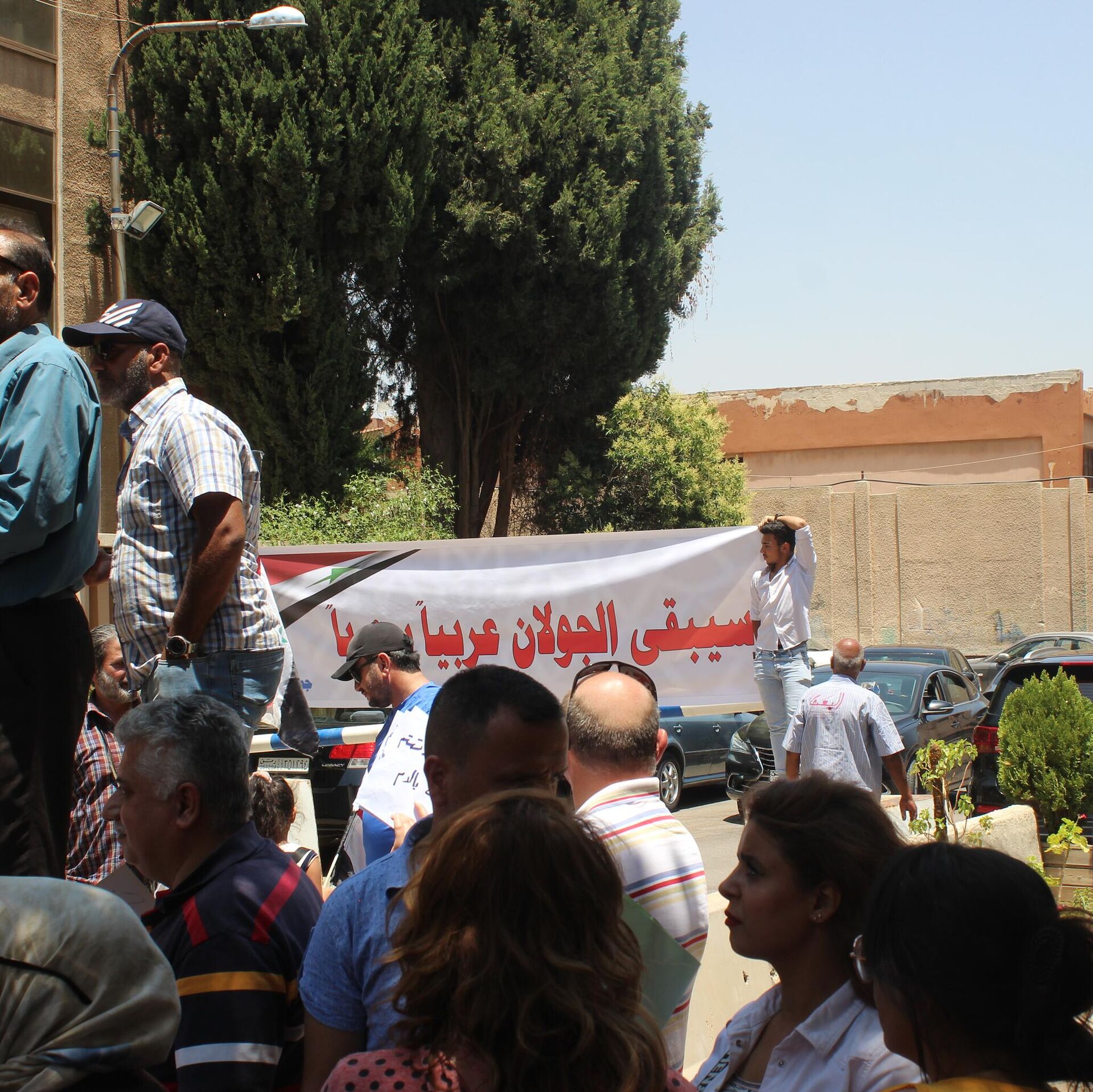 تضامنًا مع أهالي الجولان السوري المحتل، نفذ مئات السوريين عصر اليوم وقفة تضامنية أمام مقر الأمم المتحدة في دمشق، استنكارًا لممارسات كيان الاحتلال الإسرائيلي ضد أهالي الجولان الذين يقفون بوجه سلطات الاحتلال الإسرائيلي ومساعيها المحمومة منذ عشرات السنين لتجريد الجولان من سكانه.