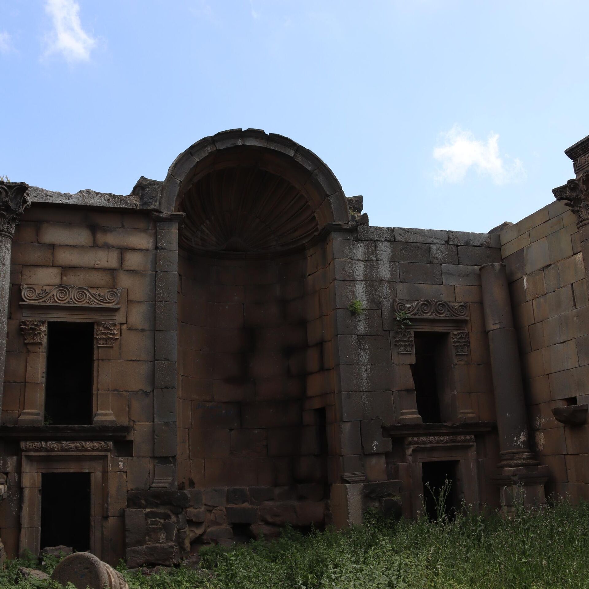 كما يبرز من الجدران رفوف حجرية خصصت لوضع المزهريات والتماثيل والأسرجة المضيئة، أما الأرضية فهي مبلطة بالحجر البازلتي أيضا، وقد تعرضت للتخريب خلال السنوات الأخيرة، ويعتقد بأن سقفه القديم كان من الخشب على شكل هرمي، لكن لم يبق منه شيء حاليا.