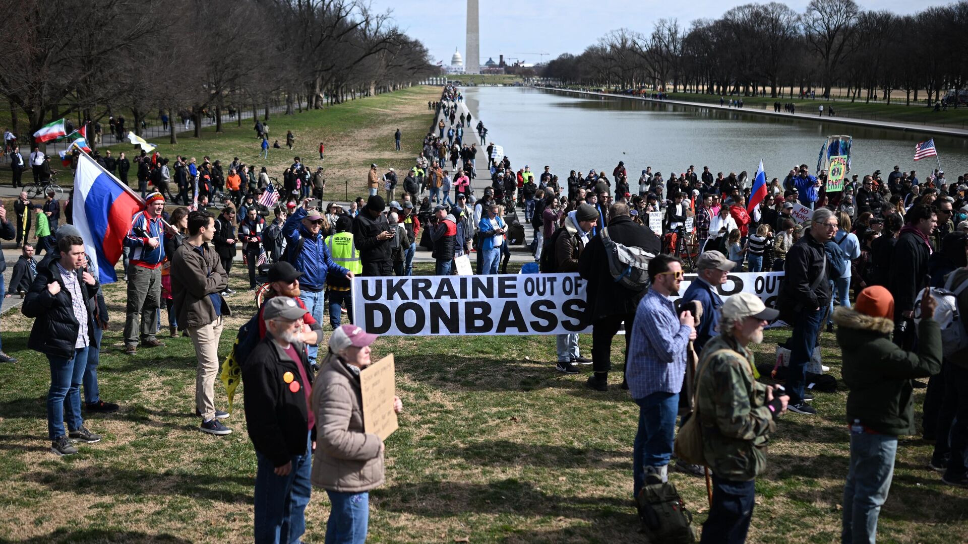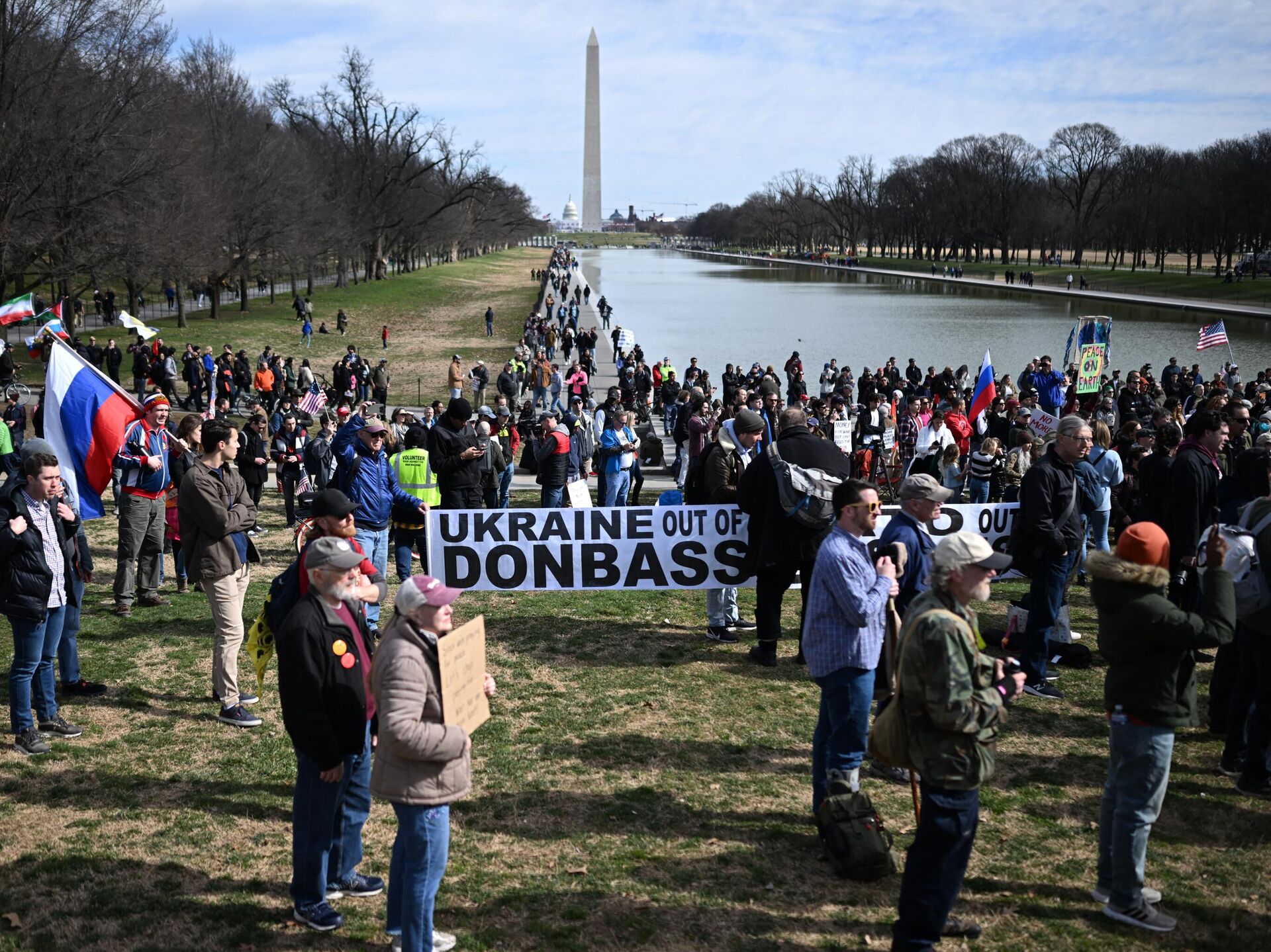 © AFP 2023 / Andrew Caballero-Reynoldsاحتجاجات في واشنطن على إمدادات السلاح لأوكرانيا بعنوان "ارفعوا أيديكم عن الصين وروسيا"