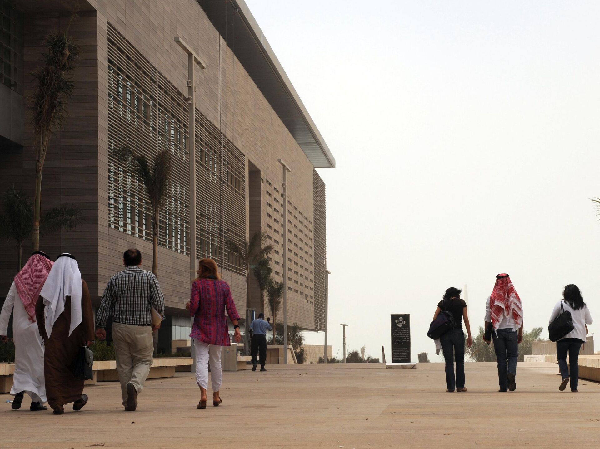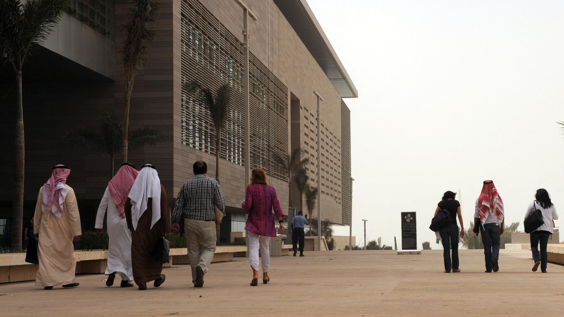 أعضاء هيئة التدريس والطلاب يسيرون في حرم جامعة الملك عبد الله للعلوم والتكنولوجيا، شمال جدة
