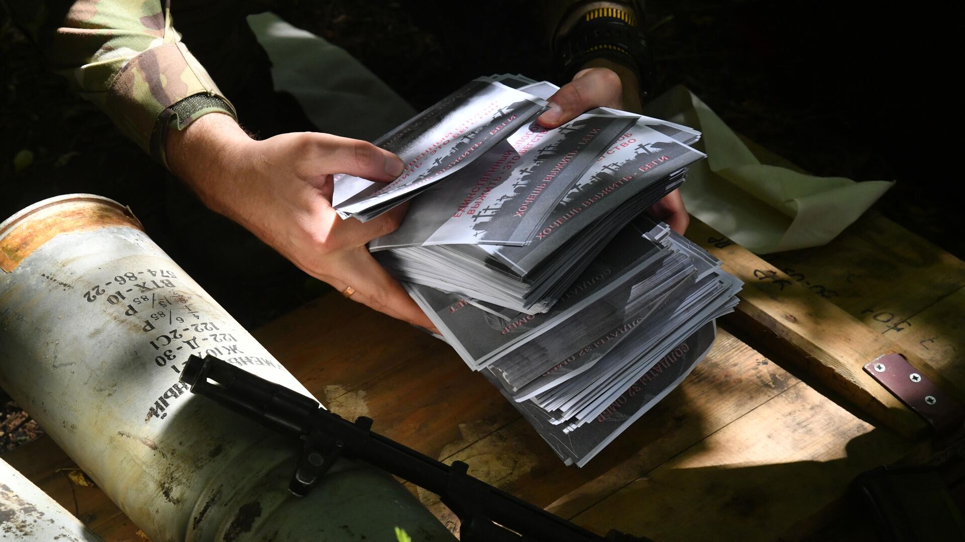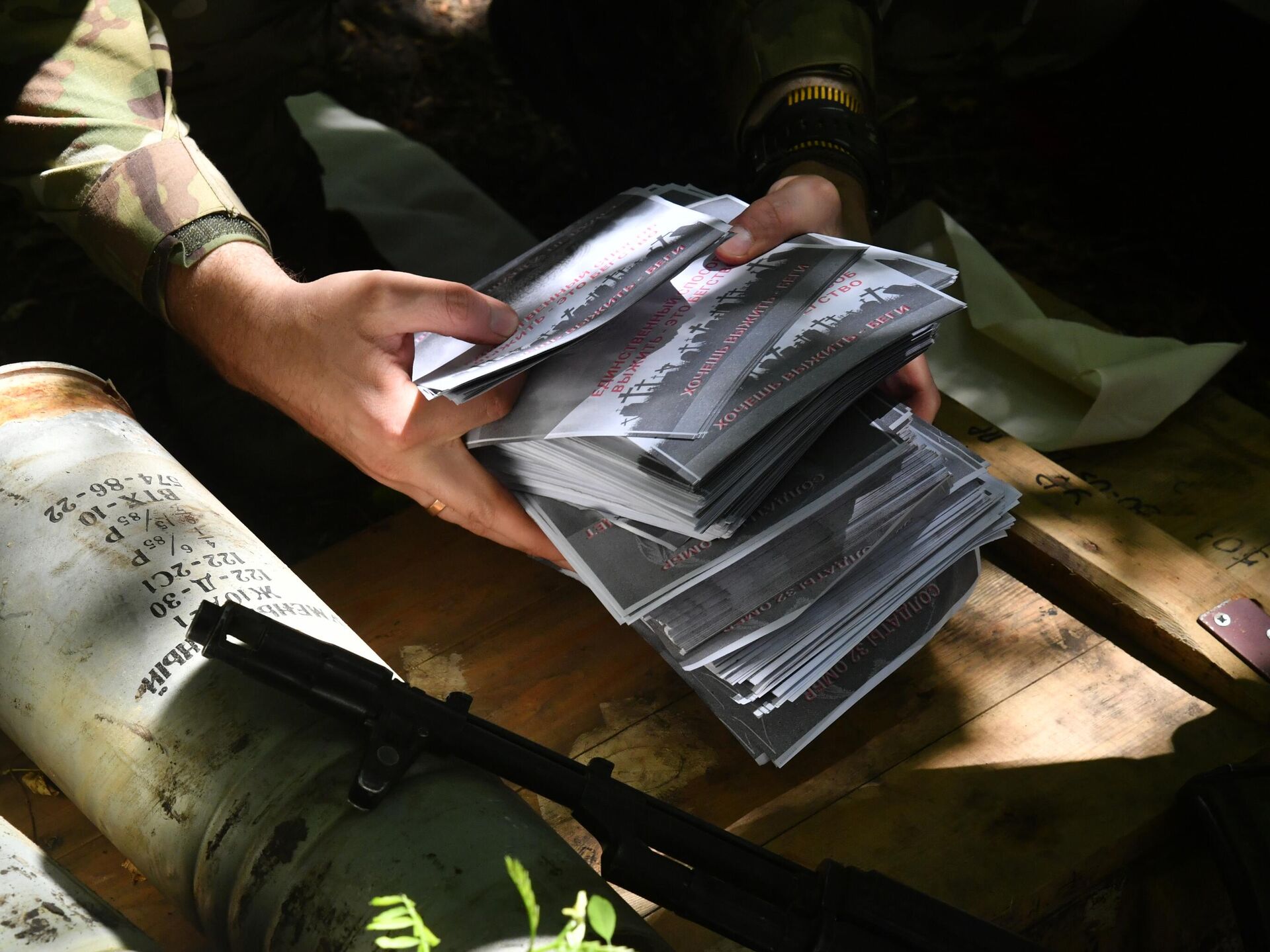 وقال أحد الجنود الروس: "إن مدفعية القوات المسلحة الروسية تطلق طلقات نارية على مواقع القوات المسلحة الأوكرانية، ويفتح الكتيبة ويملأ الخنادق والمخابئ وكامل المنطقة التي يتم فيها توجيه القذائف". ووفقا له، يجب على عناصر الجيش الأوكراني قراءة الكلمات المكتوبة والاستشعار بها.