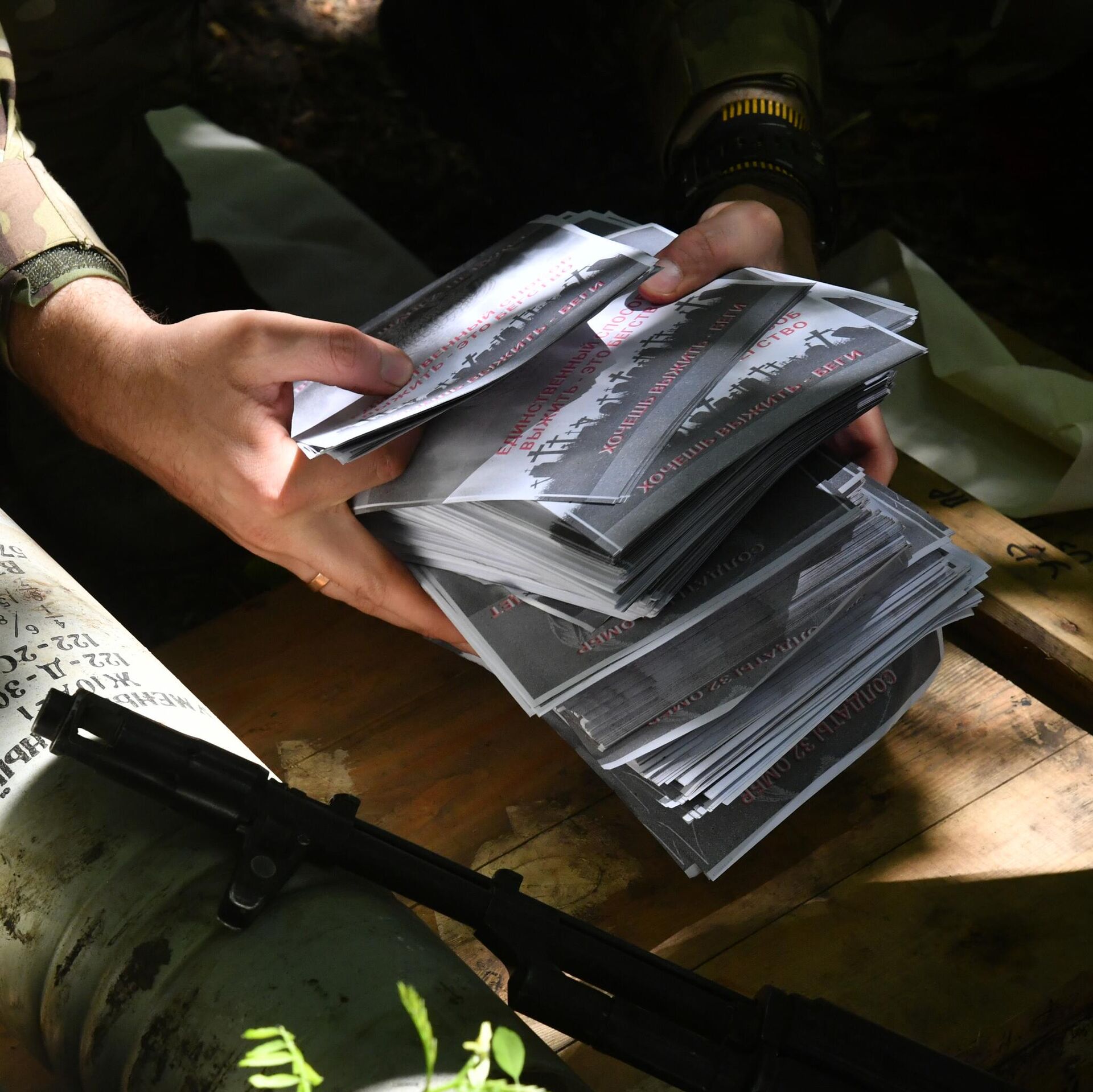 منشورات لإرسالها لقوات الجيش الأوكراني في إتجاه محور سفاتوف، جمهورية لوغانسك الشعبية. منشور كتب عليه: لن يكون هناك فرصة ثانية. الطريقة الوحيدة لتبقى على الحياة -- الفرار! أتريد أن تحيا -- اهرب!"