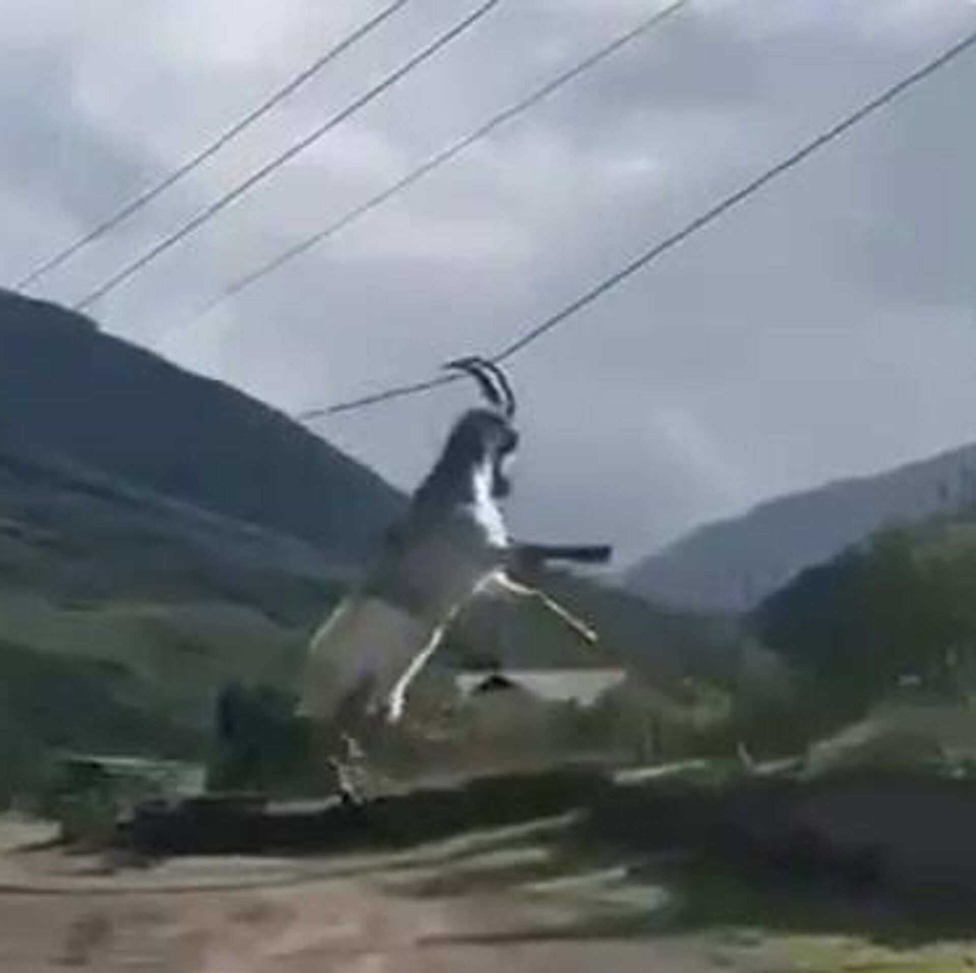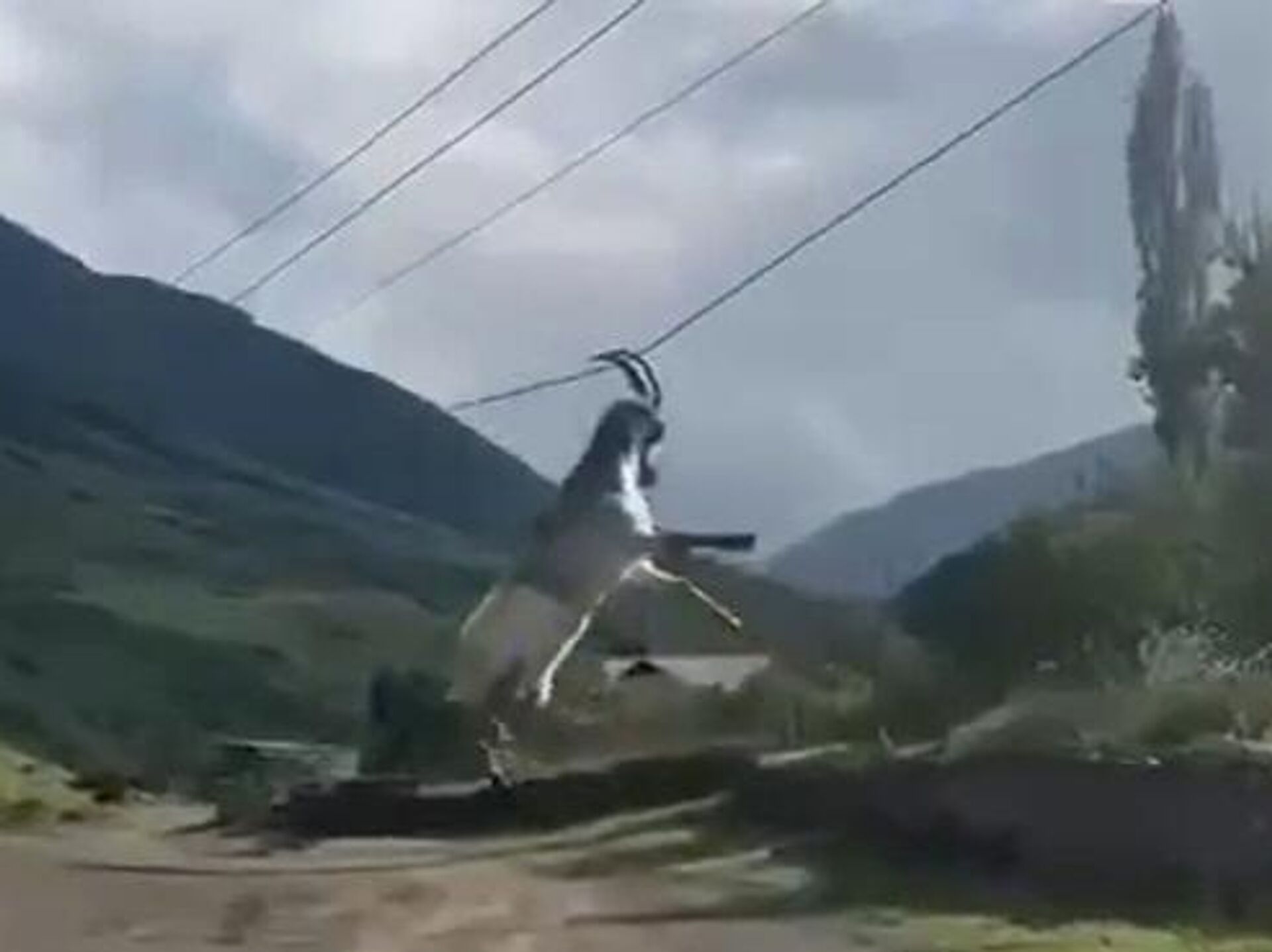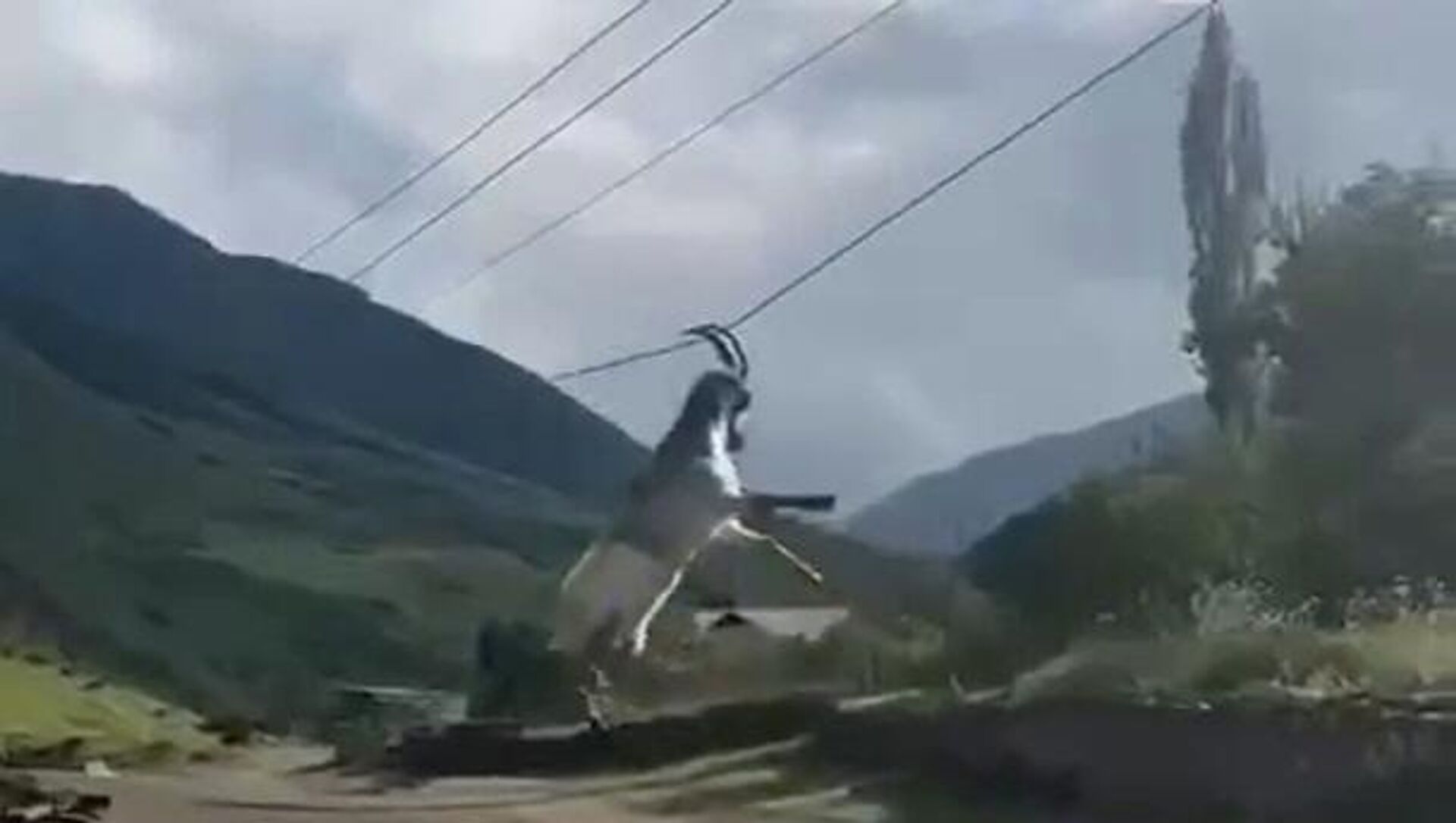 وعل ماعز "سيء الحظ" يتأرجح معلقا من قرنيه بأسلاك التوتر العالي... فيديو