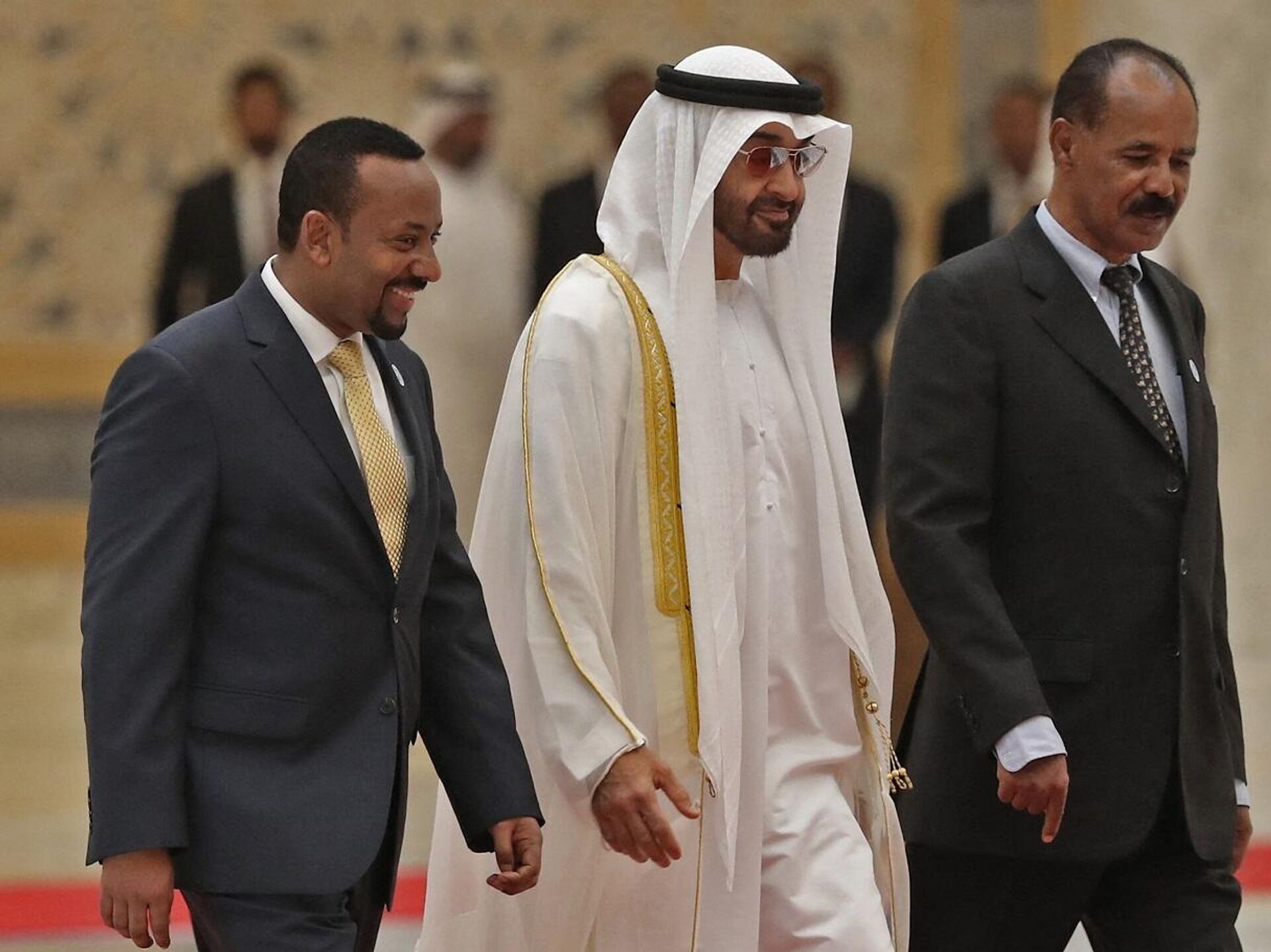© AFP 2023 / KARIM SAHIBولي عهد أبو ظبي، الشيخ محمد بن زايد، يستقبل رئيس الوزراء الإثيوبي، آبي أحمد، والرئيس الإريتري، أسياس أفورقي، في القصر الرئاسي بالعاصمة الإماراتية أبوظبي، 24 يوليو/ تموز 2018