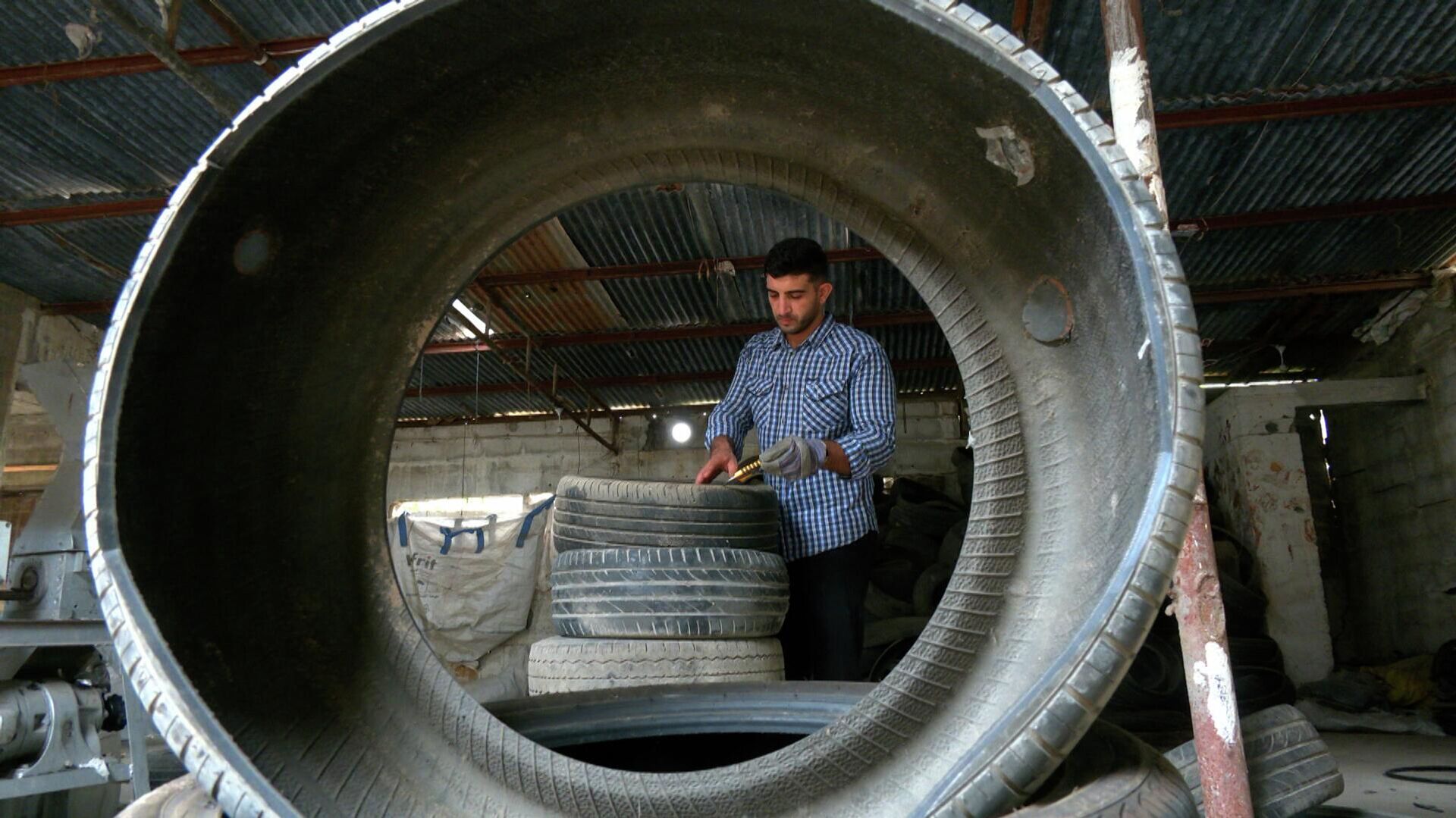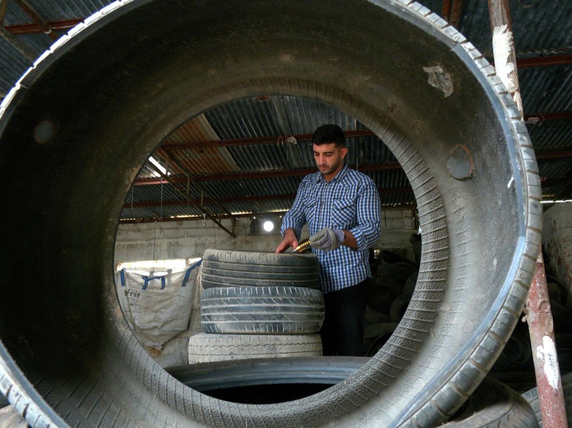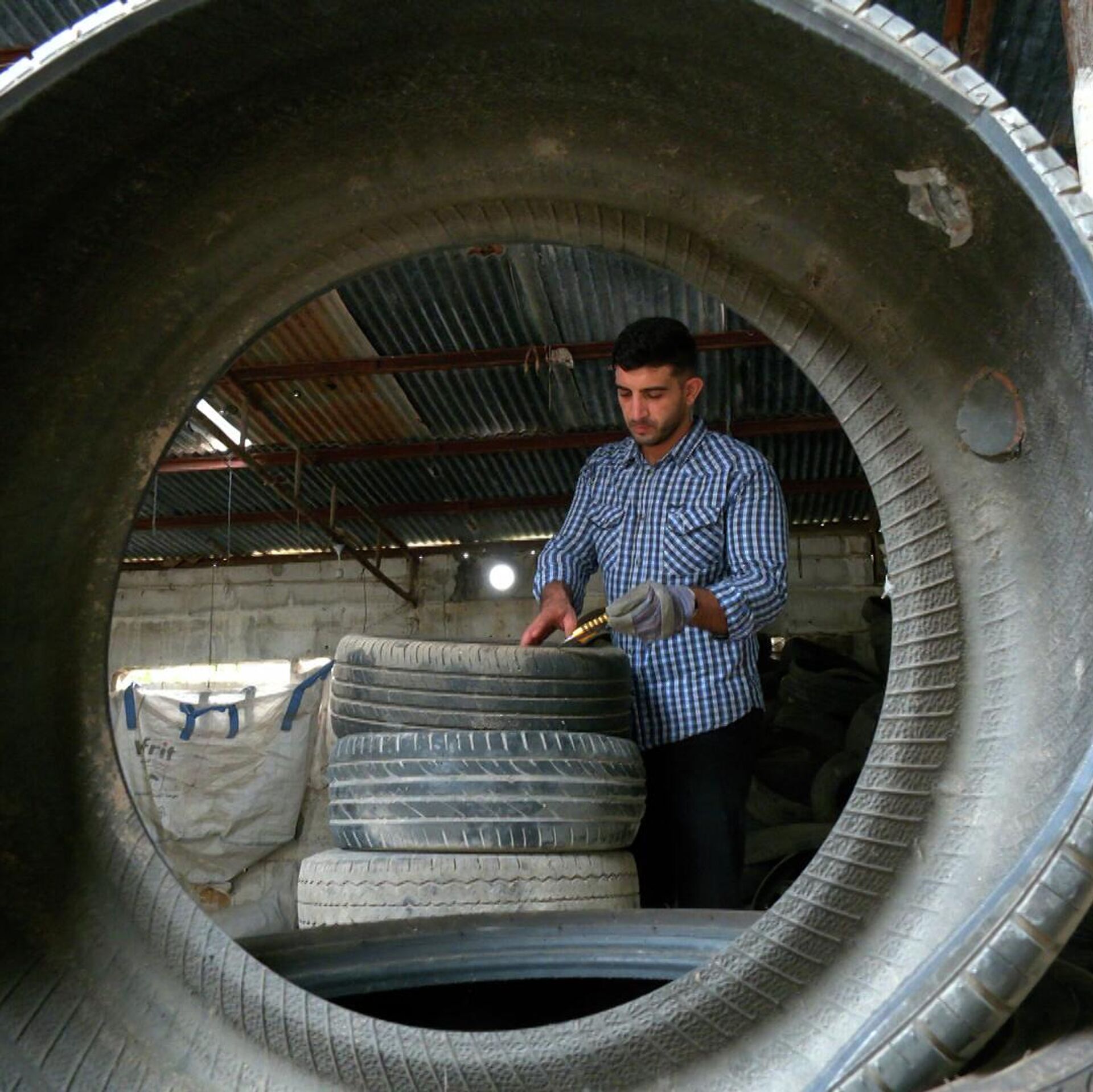 فلسطيني يعيد تدوير الإطارات التالفة للتقليل من أضرارها على البيئة