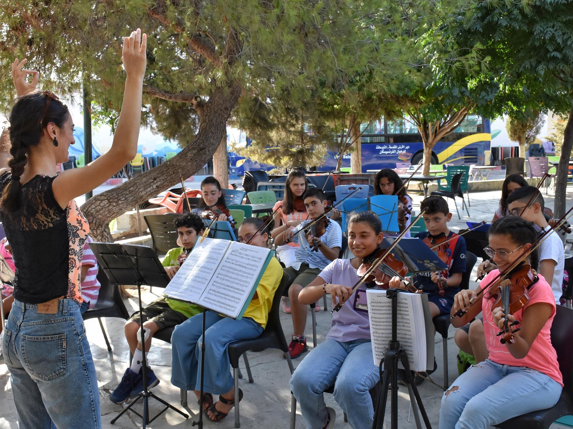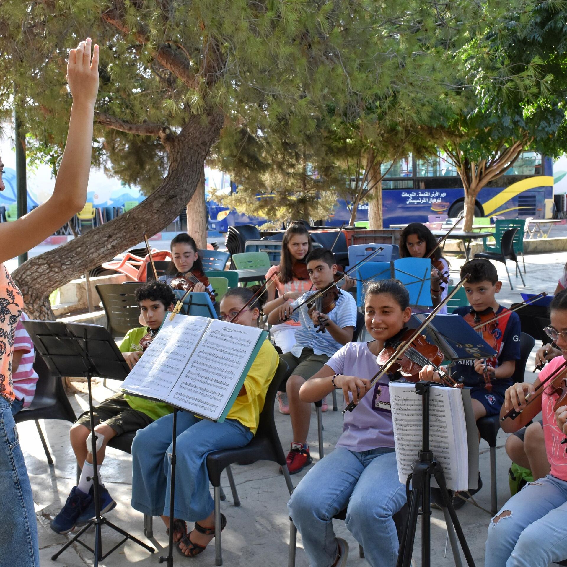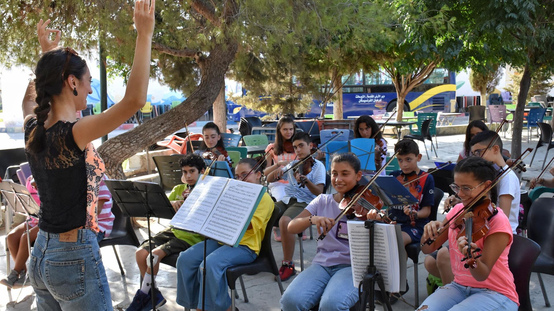 وسط غابة صغيرة من الشجيرات الخضراء، في مكان ينعم بالهدوء والسكينة الروحية في دير"الأرض المقدسة" في محافظة حلب، يتوزع الأطفال بشكل منتظم، يحتضنون آلاتهم الموسيقية بغبطة، يتحلقون حول مدربتهم روزي، وبإشارات منها، وأمام النوتة الموسيقية يعزفون أجمل المقطوعات من التراث العربي والروسي والأرمني والعالمي، وكأنهم يسابقون الزمن نحو المستقبل.
