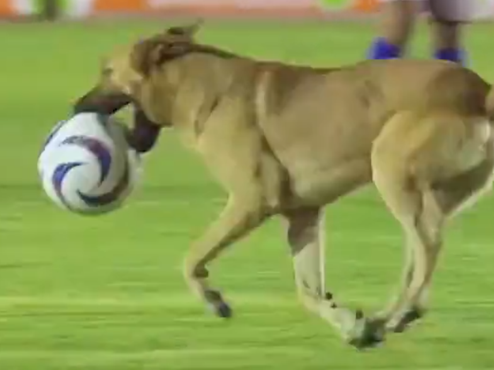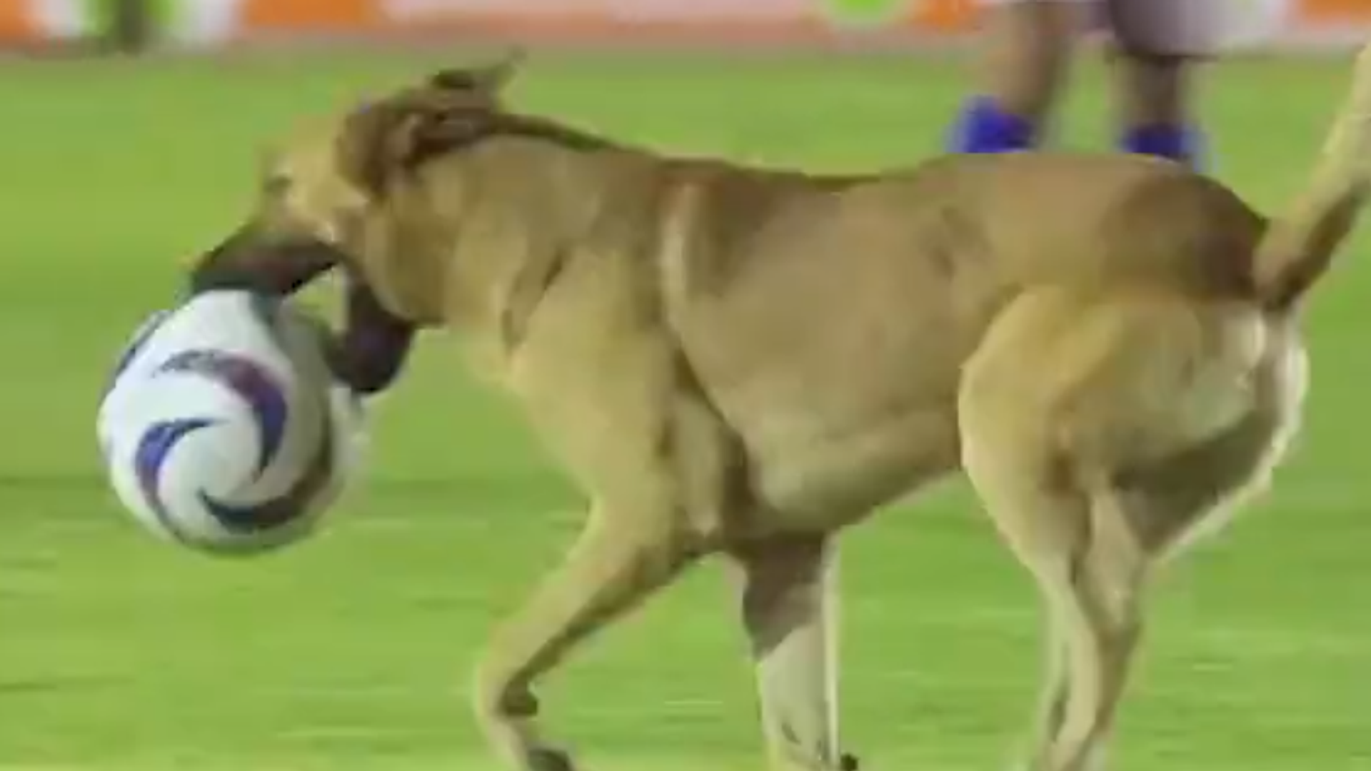 كلب يقتحم مباراة ويسرق الكرة وسط هتاف الجماهير... فيديو