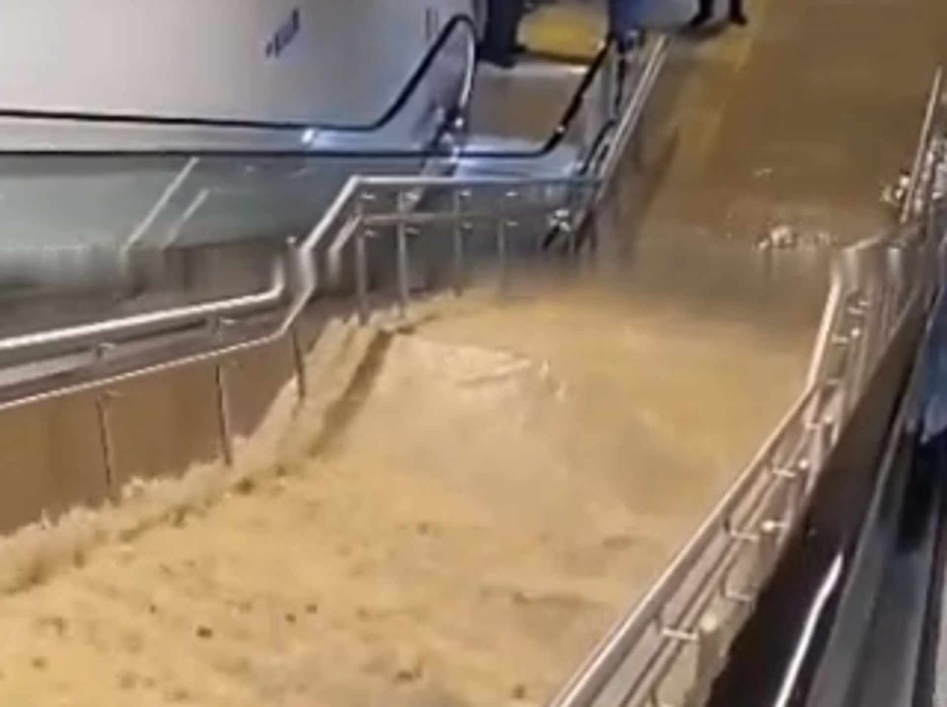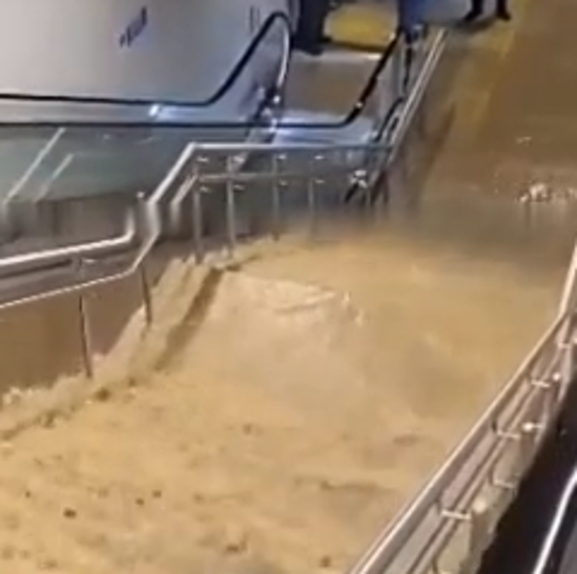 وتظهر المشاهد تدفق كميات كبيرة من المياه إلى أسفل إحدى محطات المترو، حيث غطت المياه السلم وتدفقت باتجاه الأسفل.