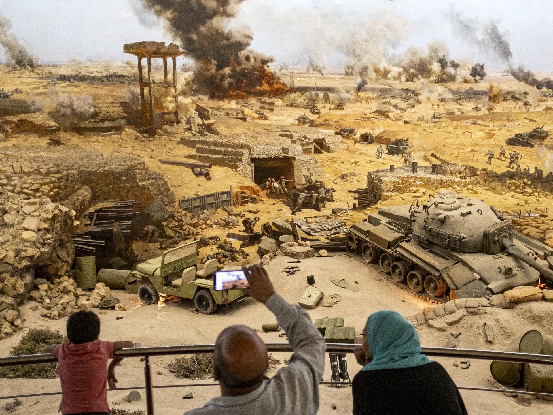 © AFP 2023 / Khaled Desoukiصبي يلتقط صورًا بالهاتف لمشهد حرب تم إعادة إنشائه أثناء زيارته لمتحف "بانوراما حرب 6 أكتوبر" والنصب التذكاري لحرب 6 أكتوبر عام 1973 في القاهرة، مصر