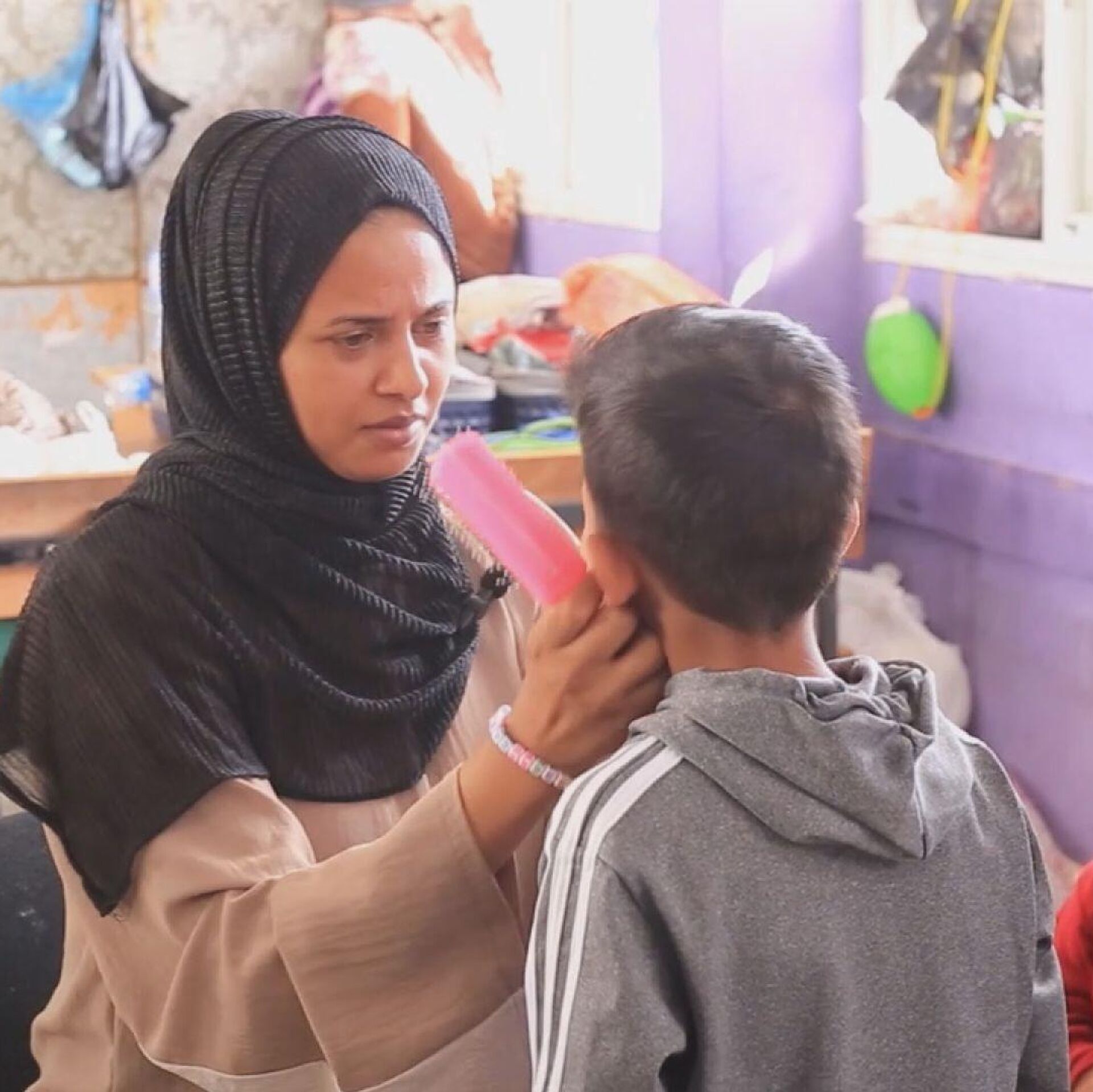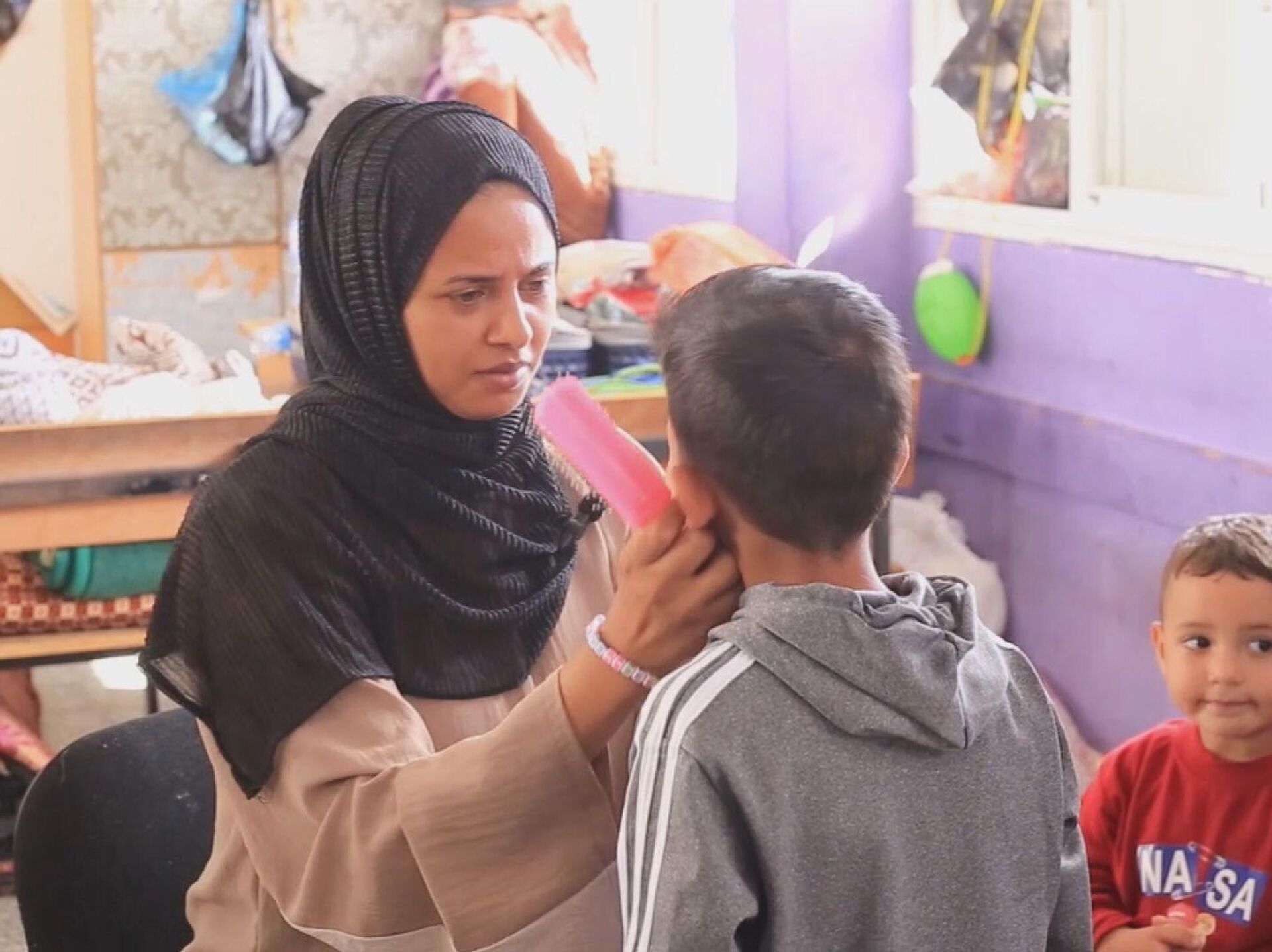 النازحة إسلام أبو صبحة جاءت إلى مركز الإيواء مع أولادها الثلاثة، بعدما قُتلت عائلتها وأقرباؤها في قصف إسرائيلي على بيتهم.
